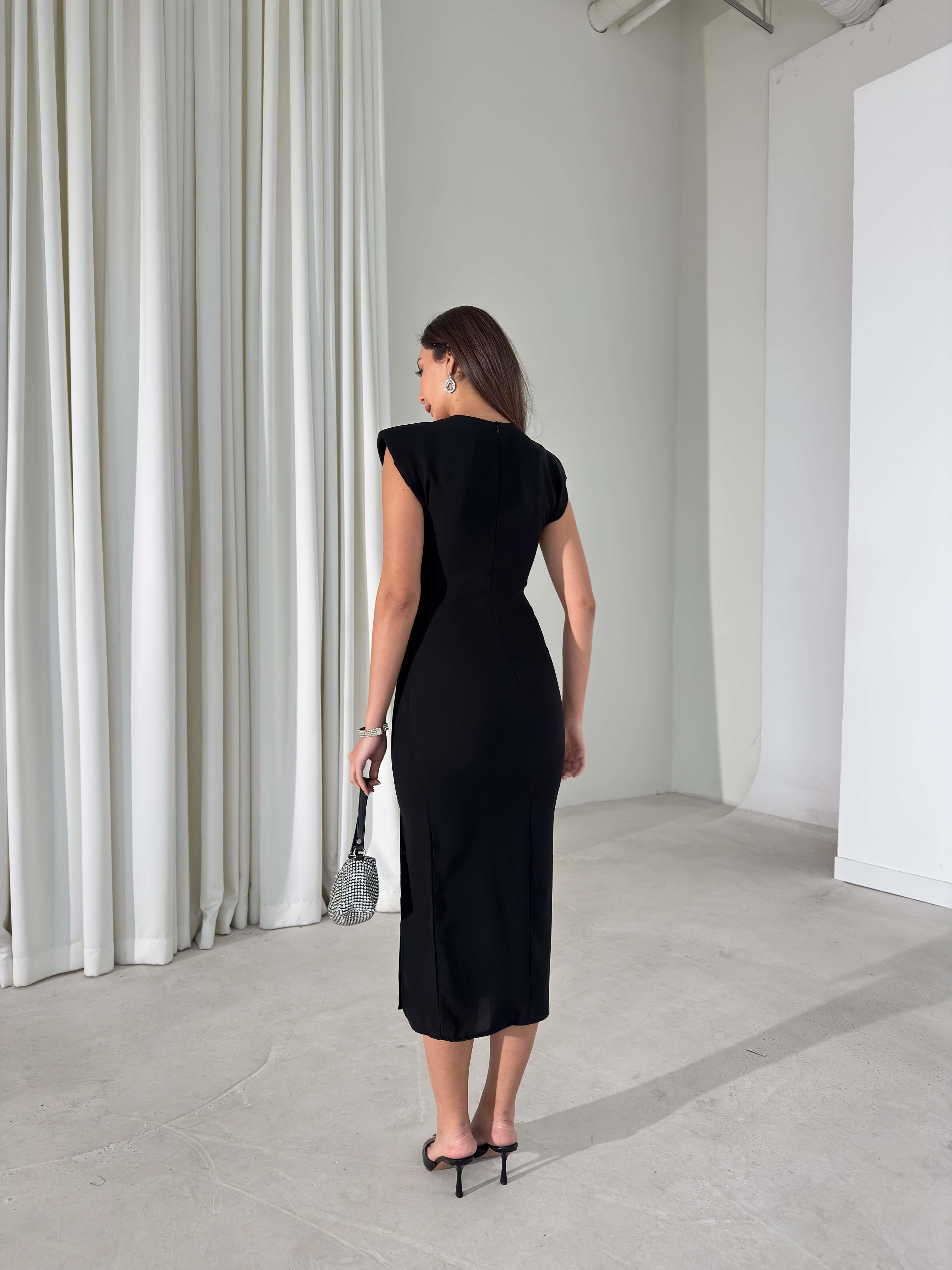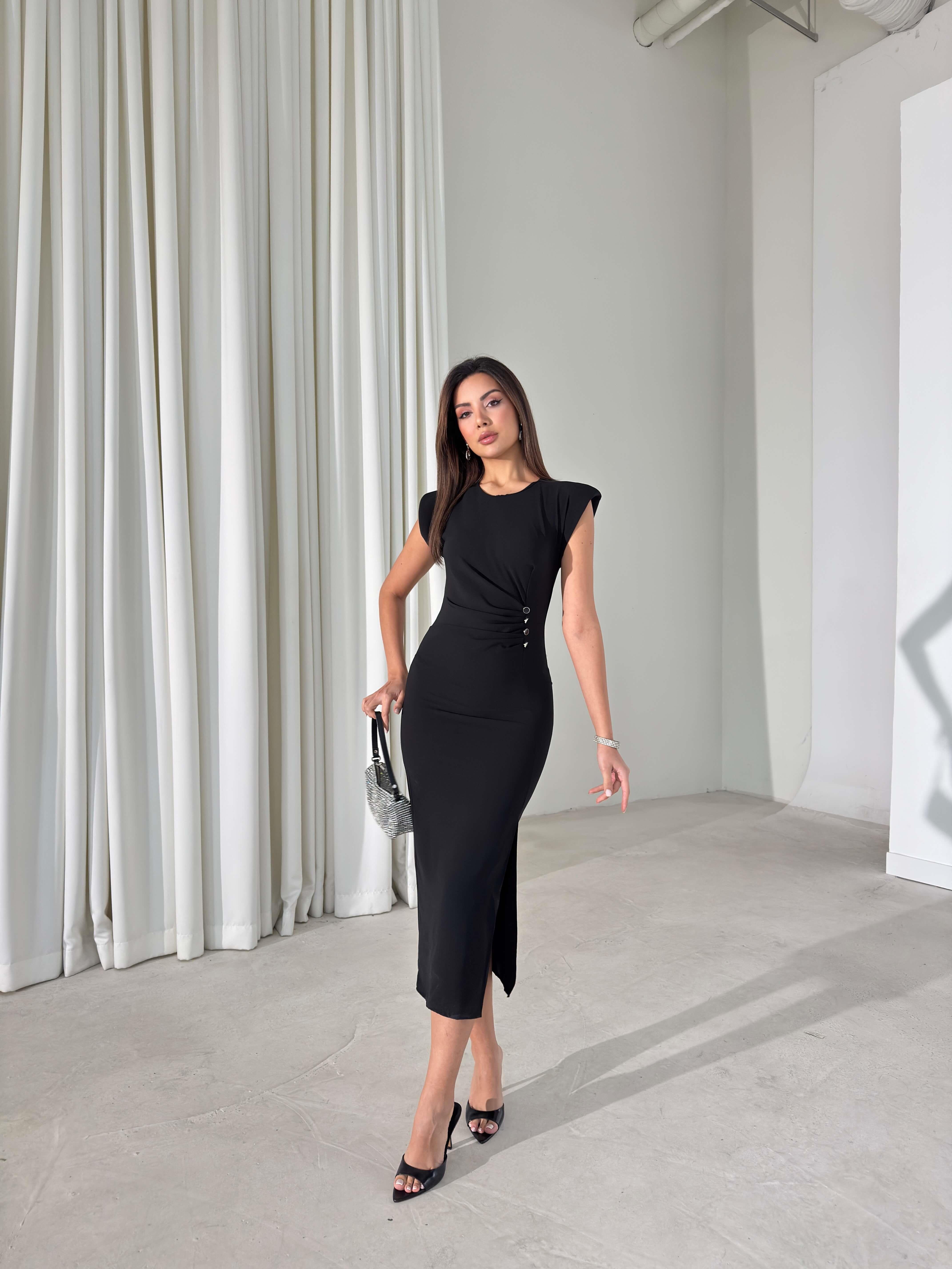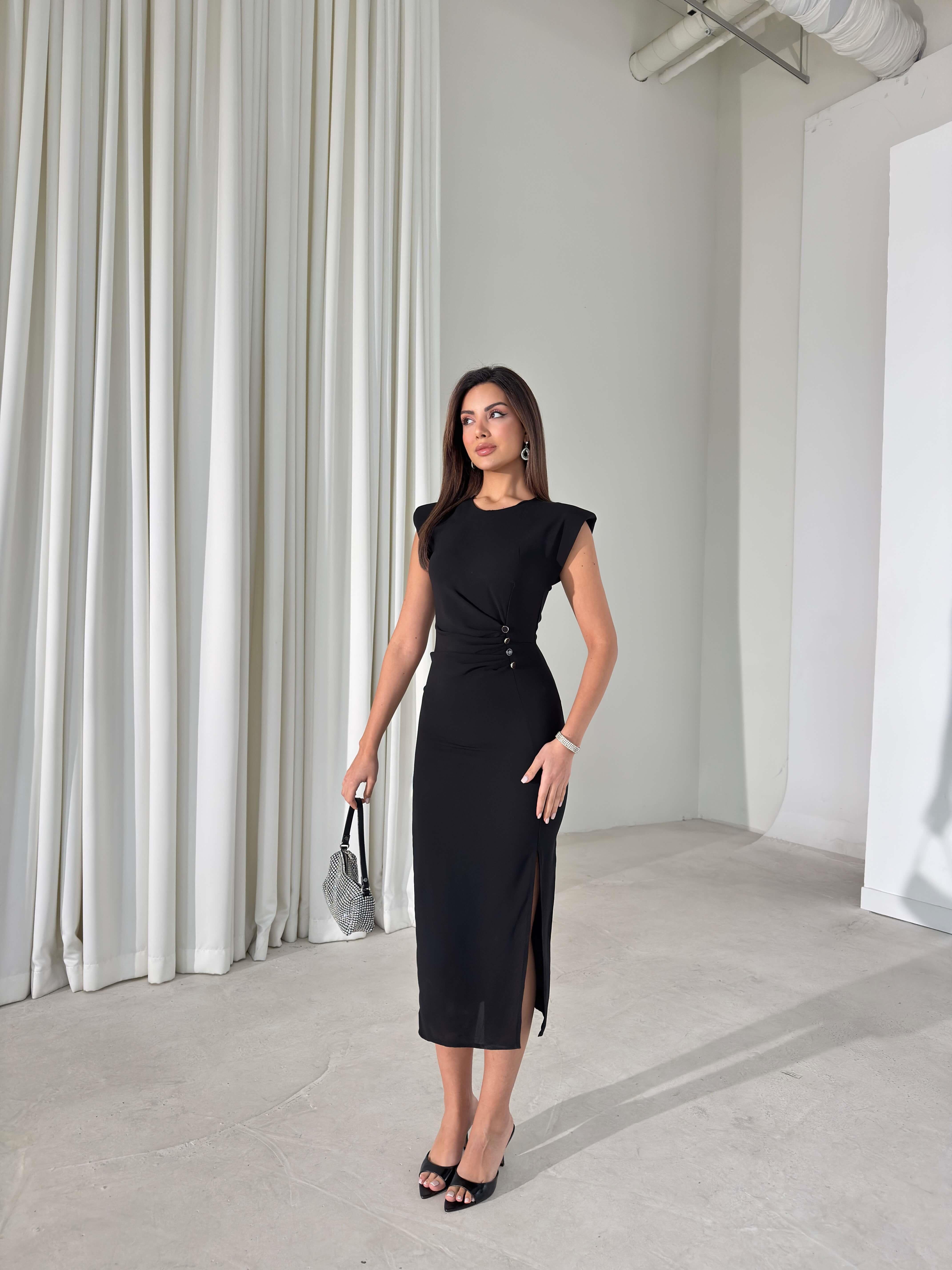 Düğme Detaylı Vatkalı Drapeli Yırtmaçlı Cenkli Siyah Kadın Elbise 26K394 (26K394)