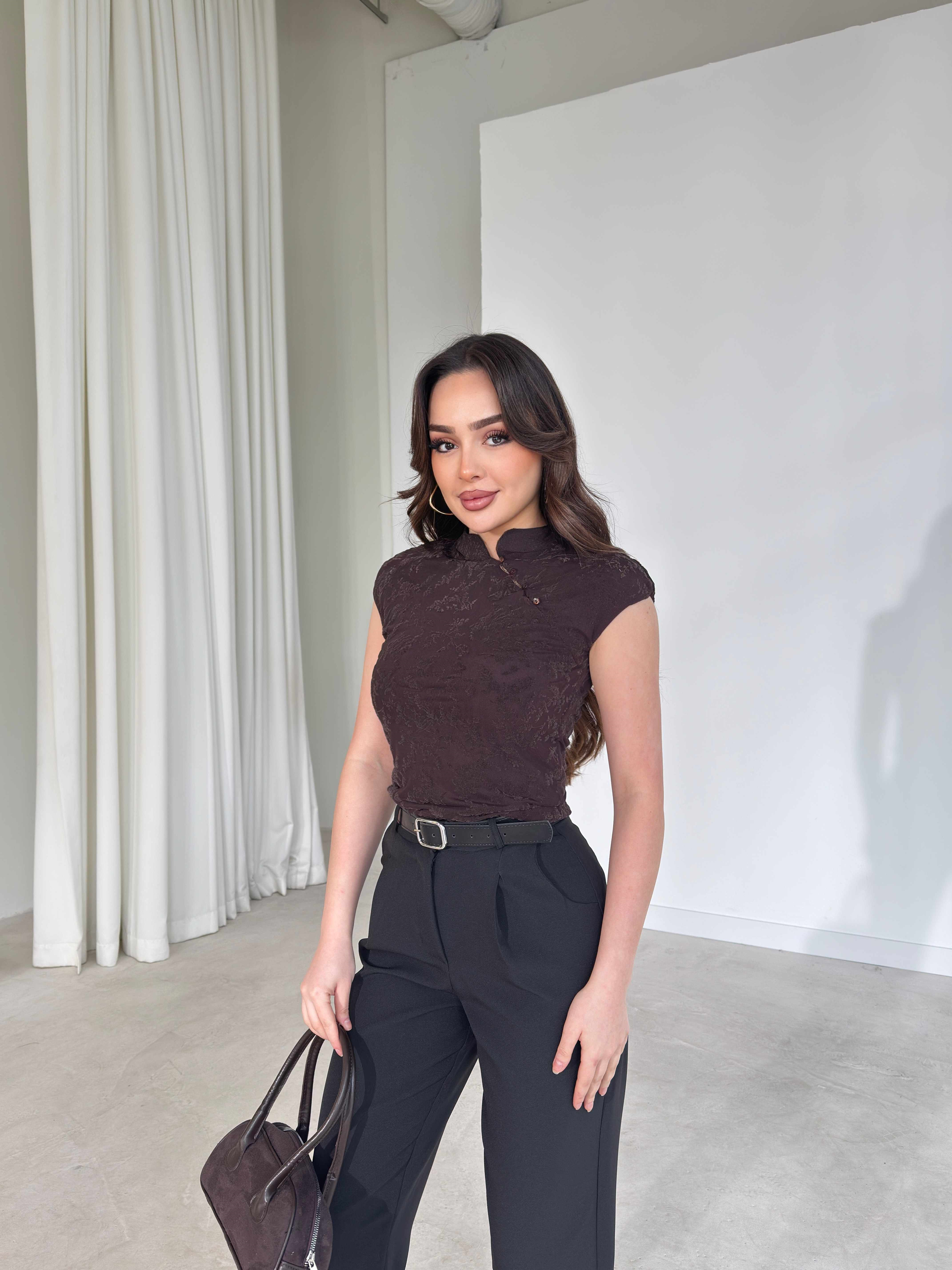 Düğme Detaylı Yanı Drape Detaylı Sıfır Kol Kahverengi Logan Kadın Bluz 26Y169 (26Y169)