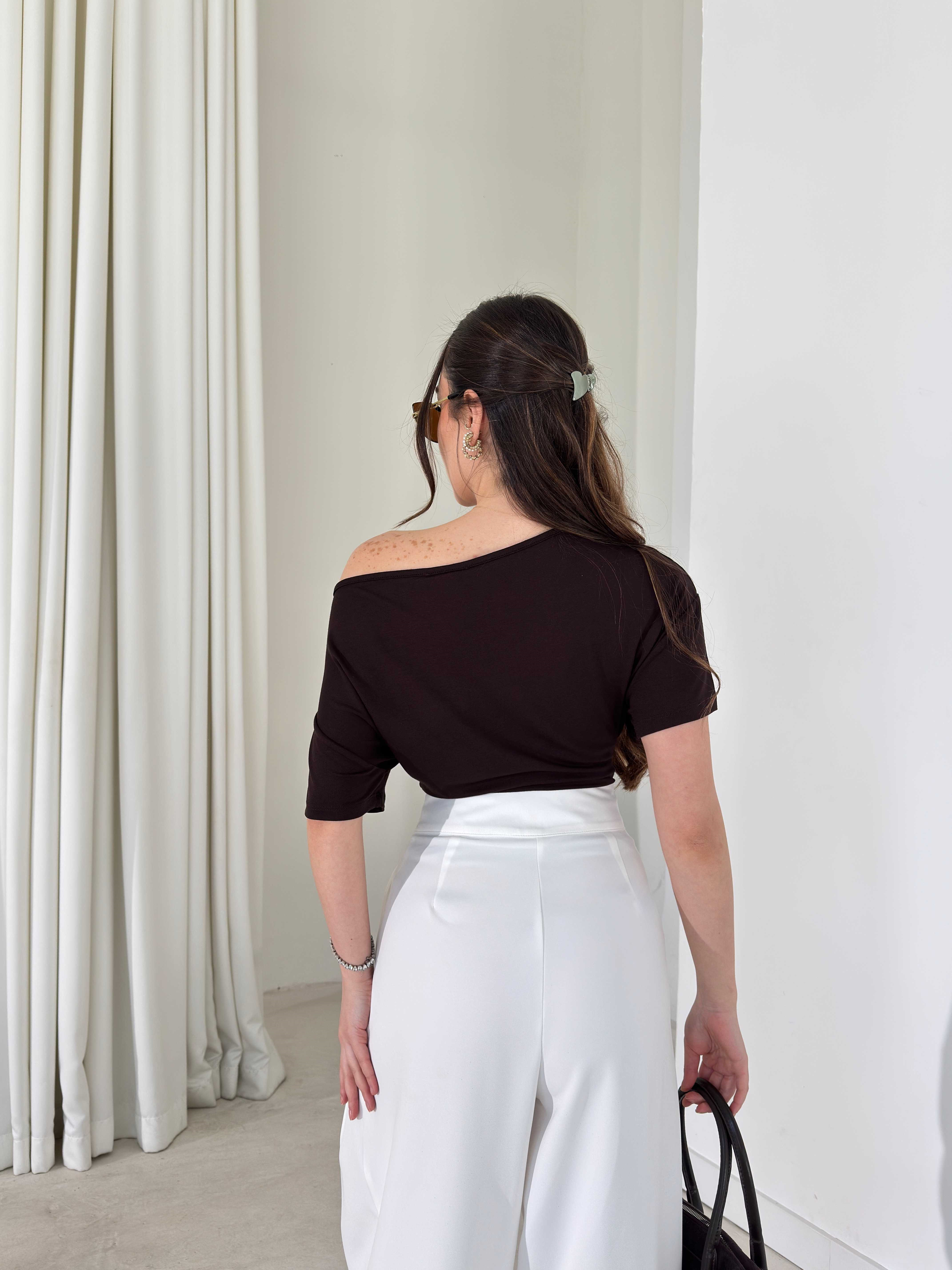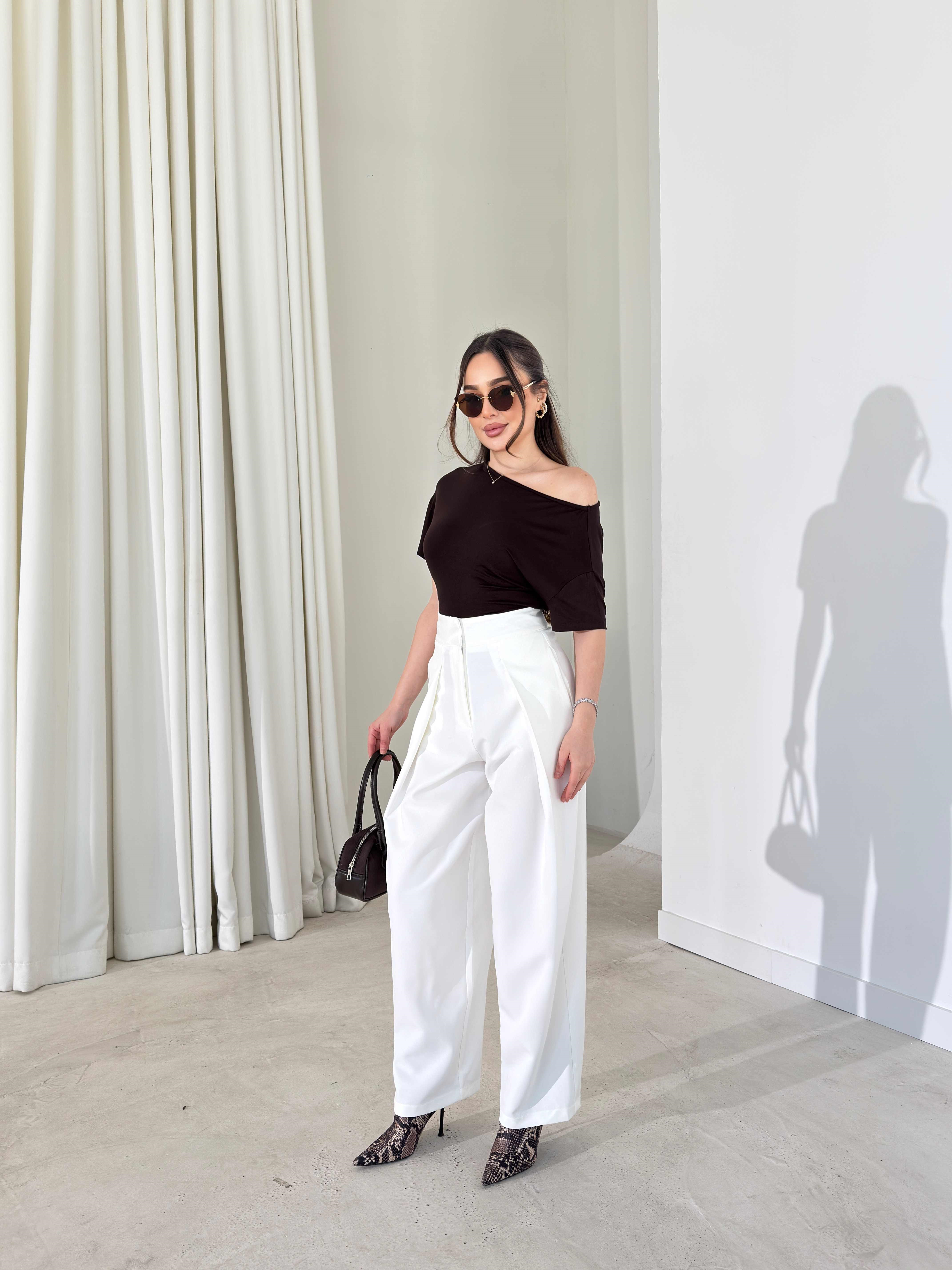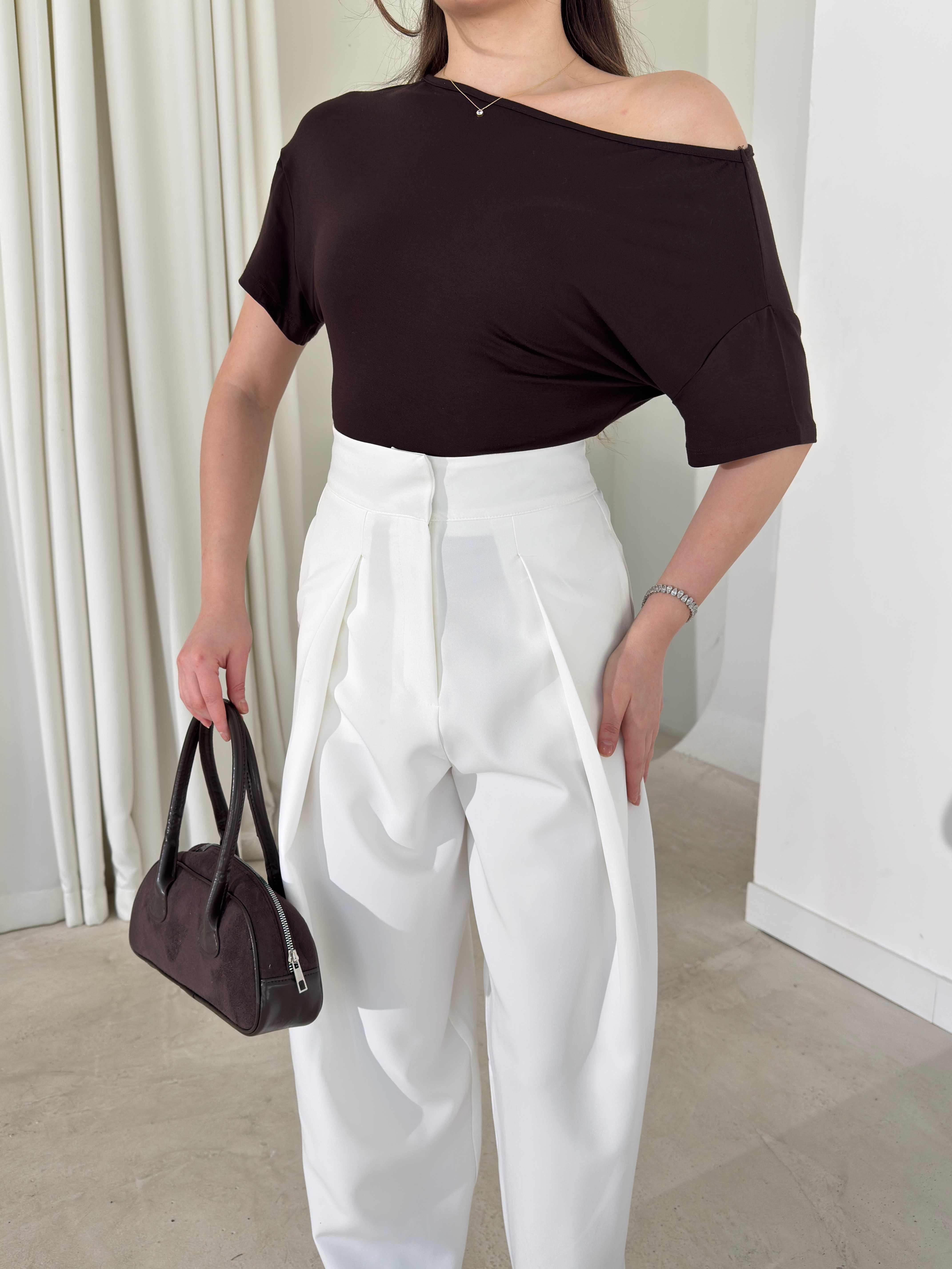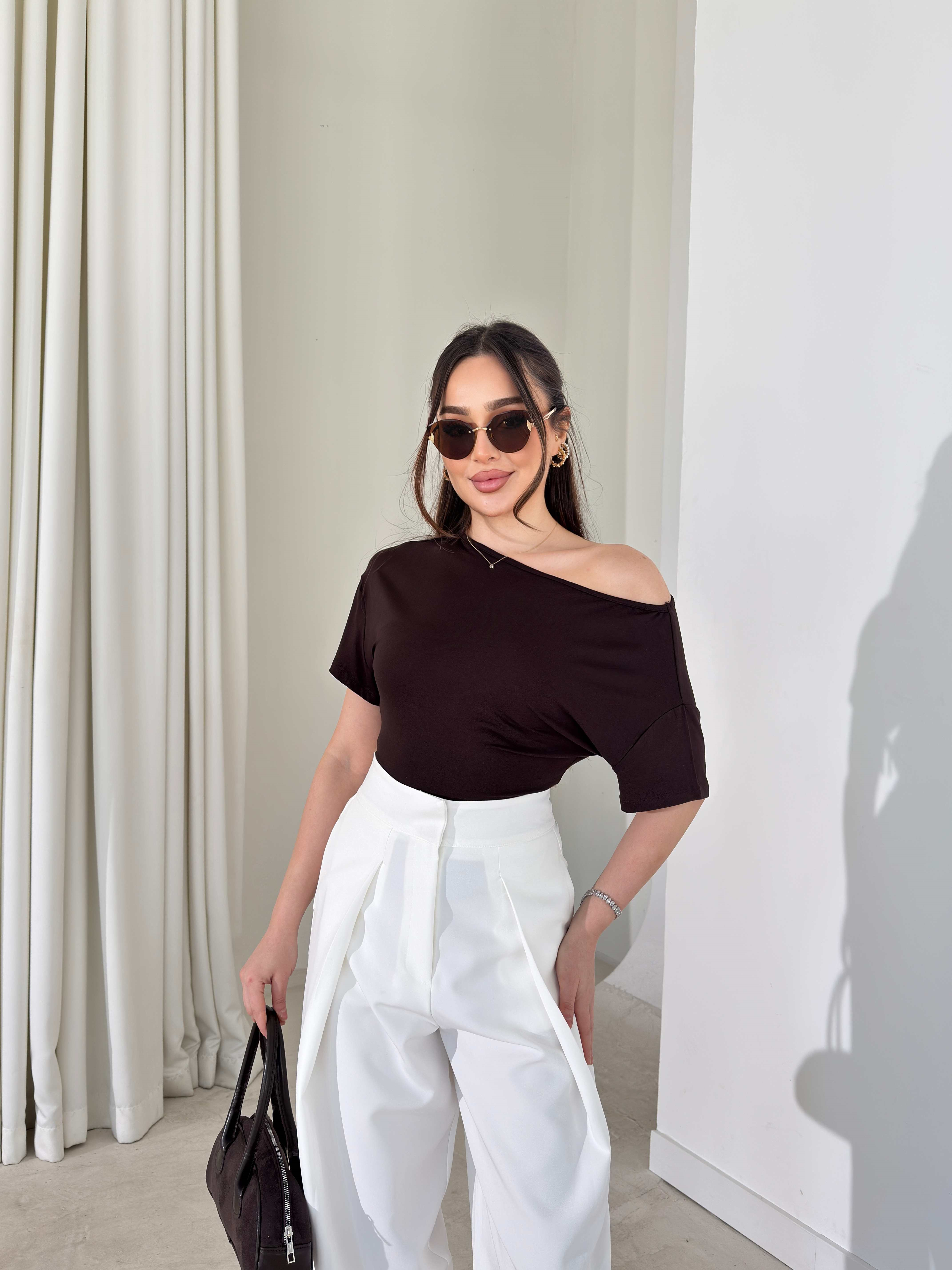 Düşük Omuz Yandan Drapeli Moven Siyah Kadın Bluz 26Y074 Düşük Omuz Yandan Drapeli Moven Ekru Kadın Bluz 26Y074