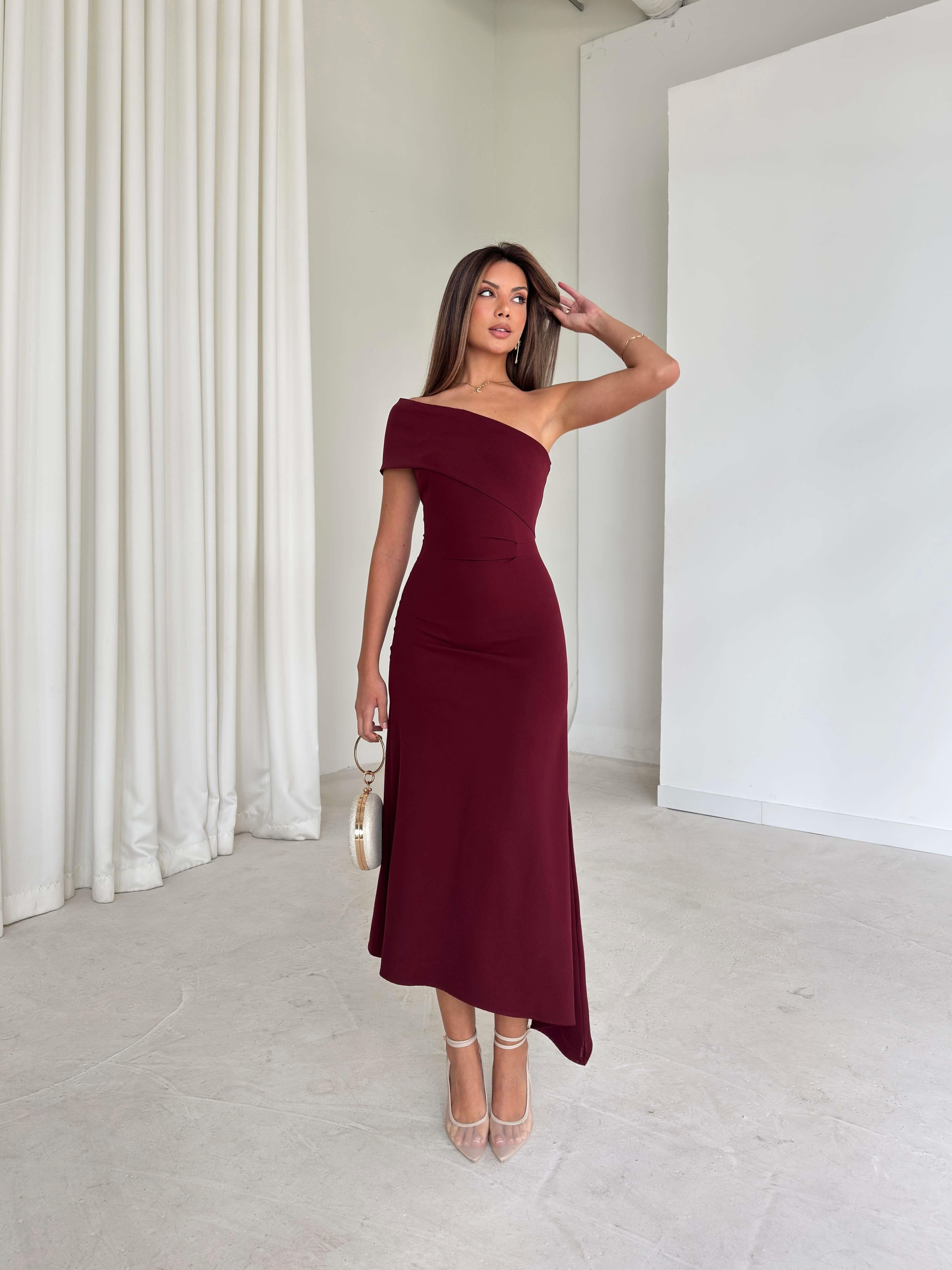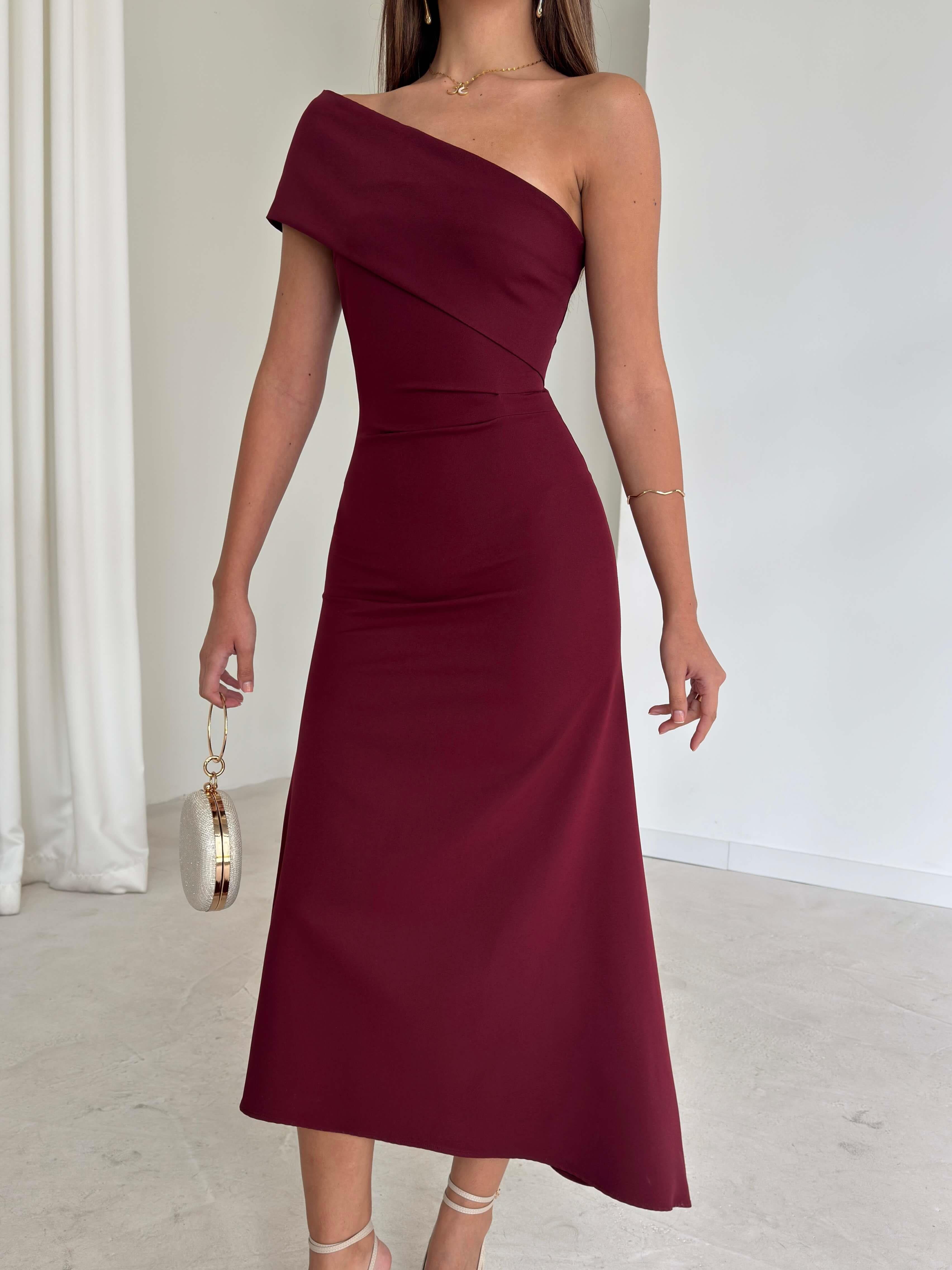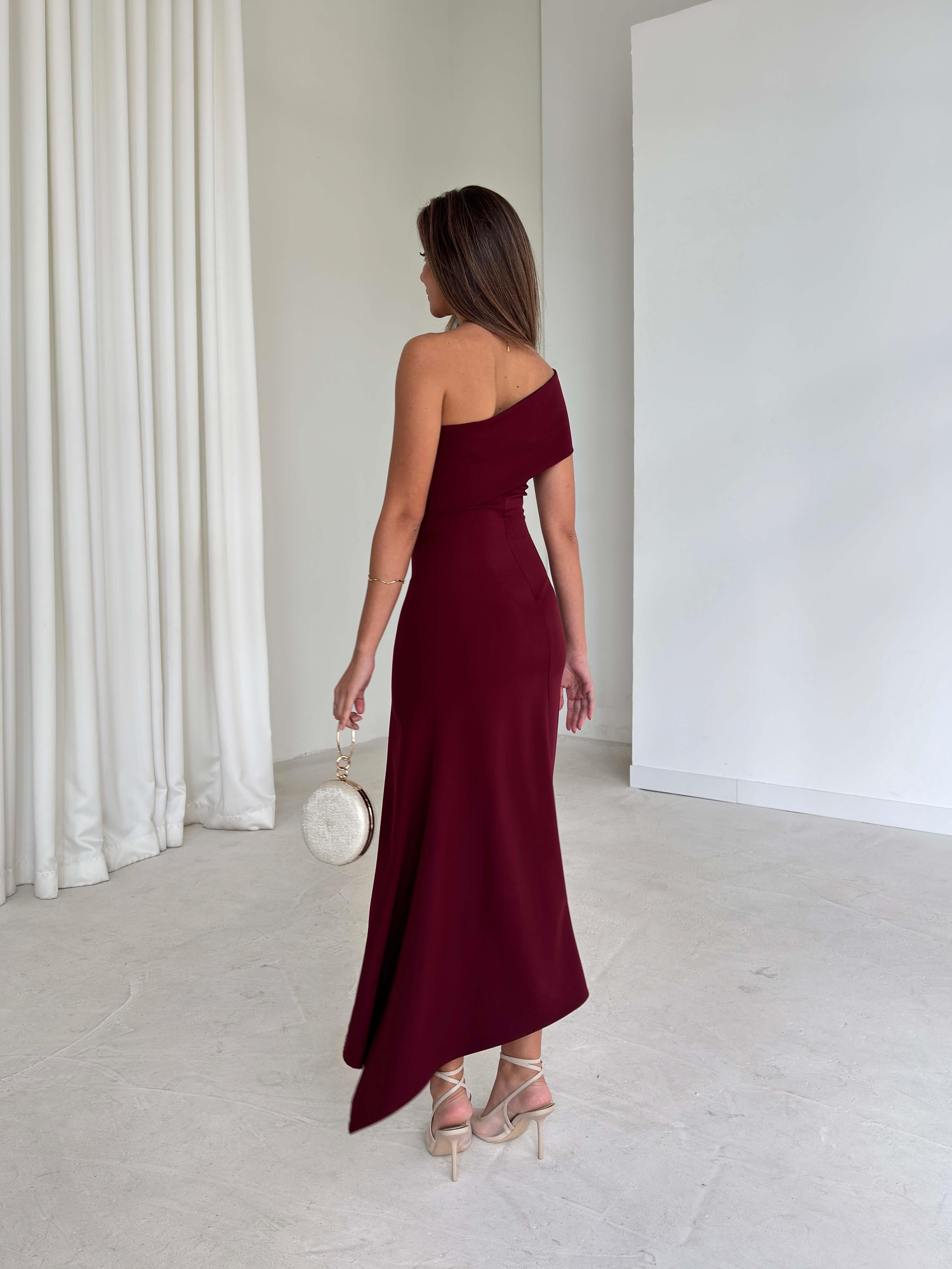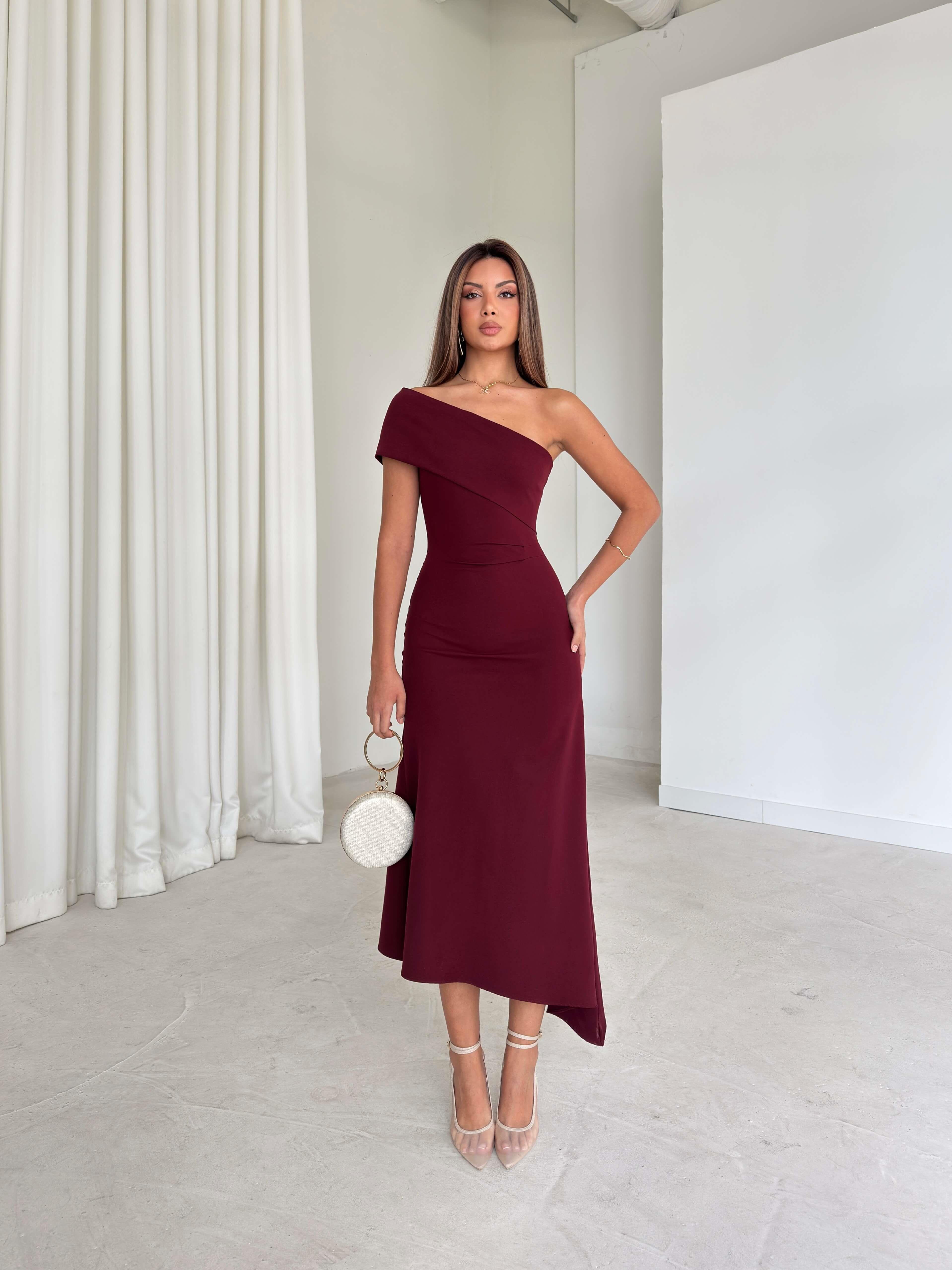 Eteği Ve Yakası Asimetrik Lamleri Bordo Kadın Midi Elbise 26K200 (26K200)