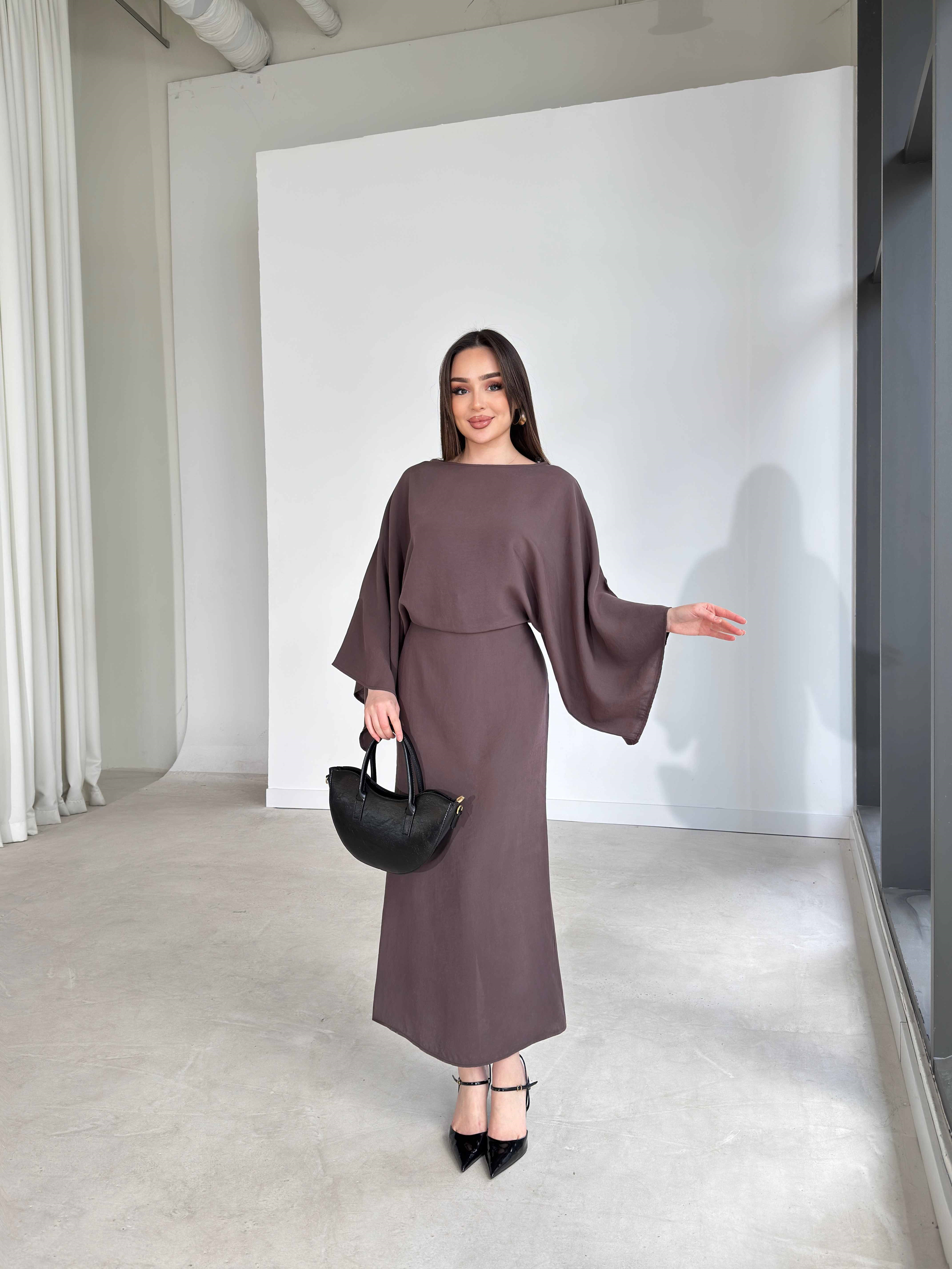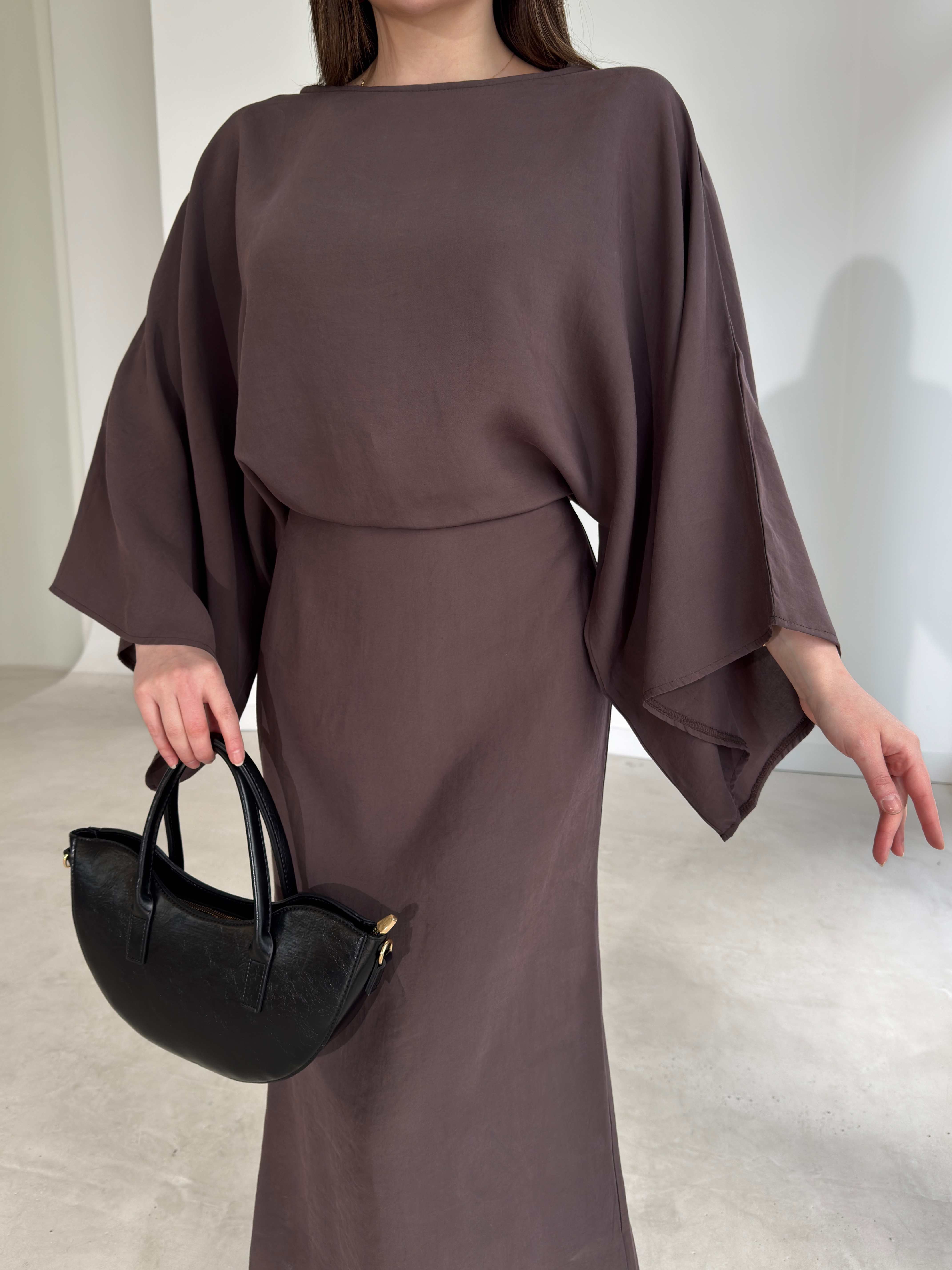 Geniş Kol Kendinden Kuşaklı Maxi Kahverengi Carolyn Kadın Elbise 26Y183 (26Y183)