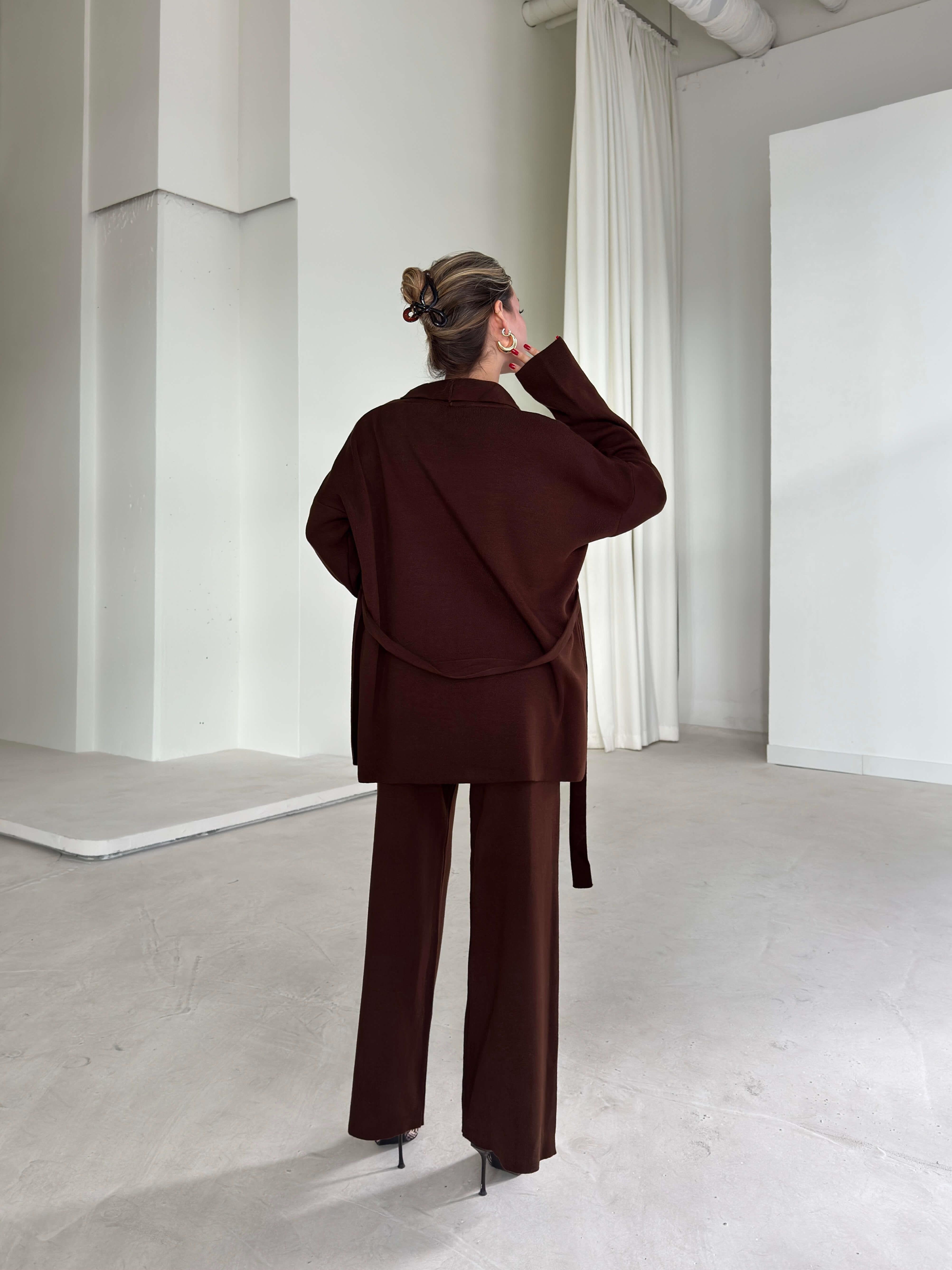 Hırkası Kuşaklı V Yaka Askılı Alint Üçlü Kadın Kahve Triko Takım 26K095 (26K095)