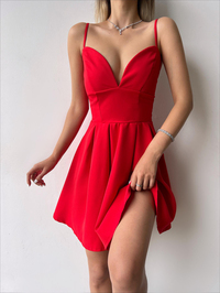*Pens detaylı, arkası fermuarlı mini elbise.