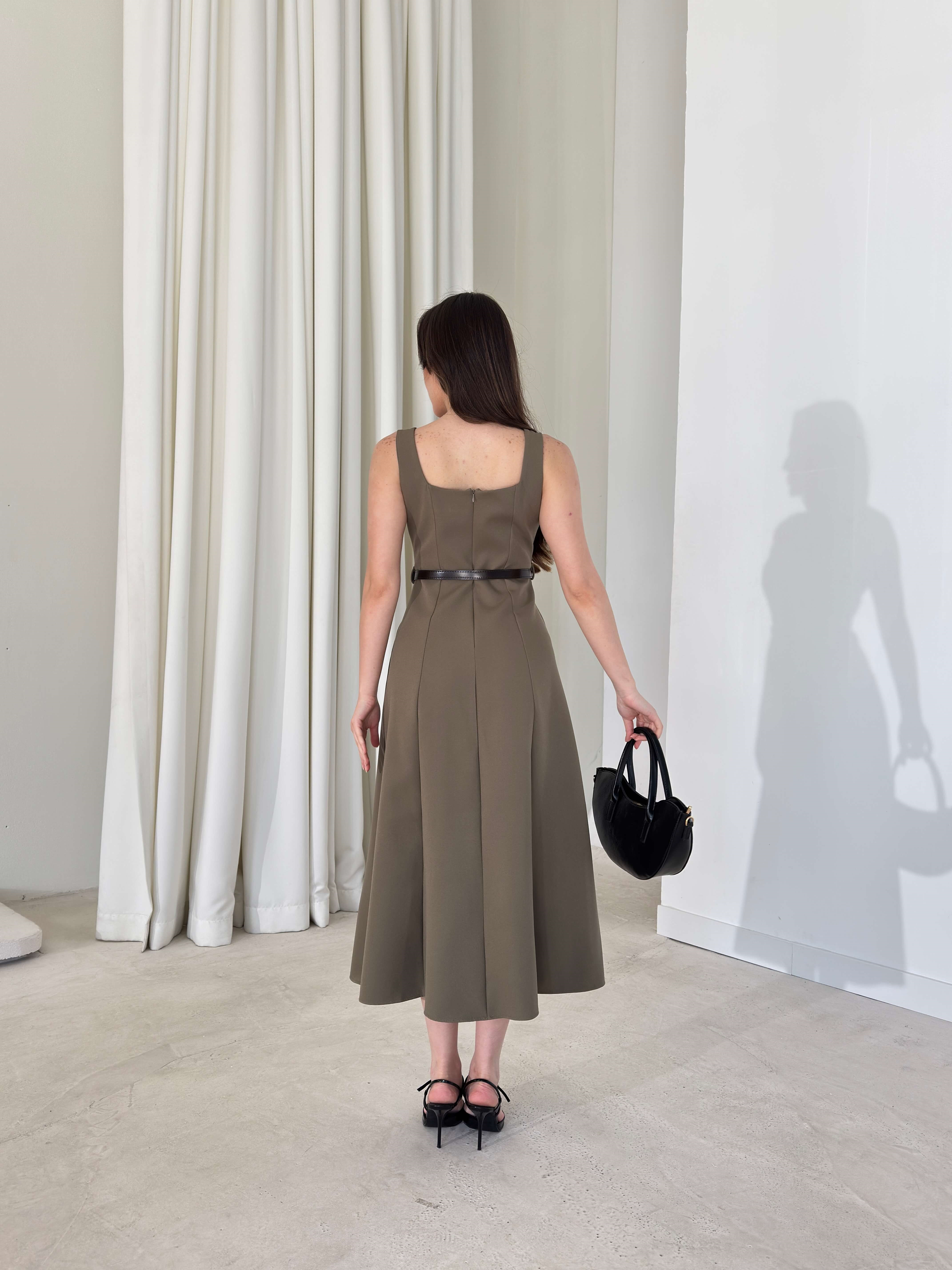 Kare Yaka Kemerli Midi Boy Haki Esperanza Kadın Elbise 26Y136 (26Y136)