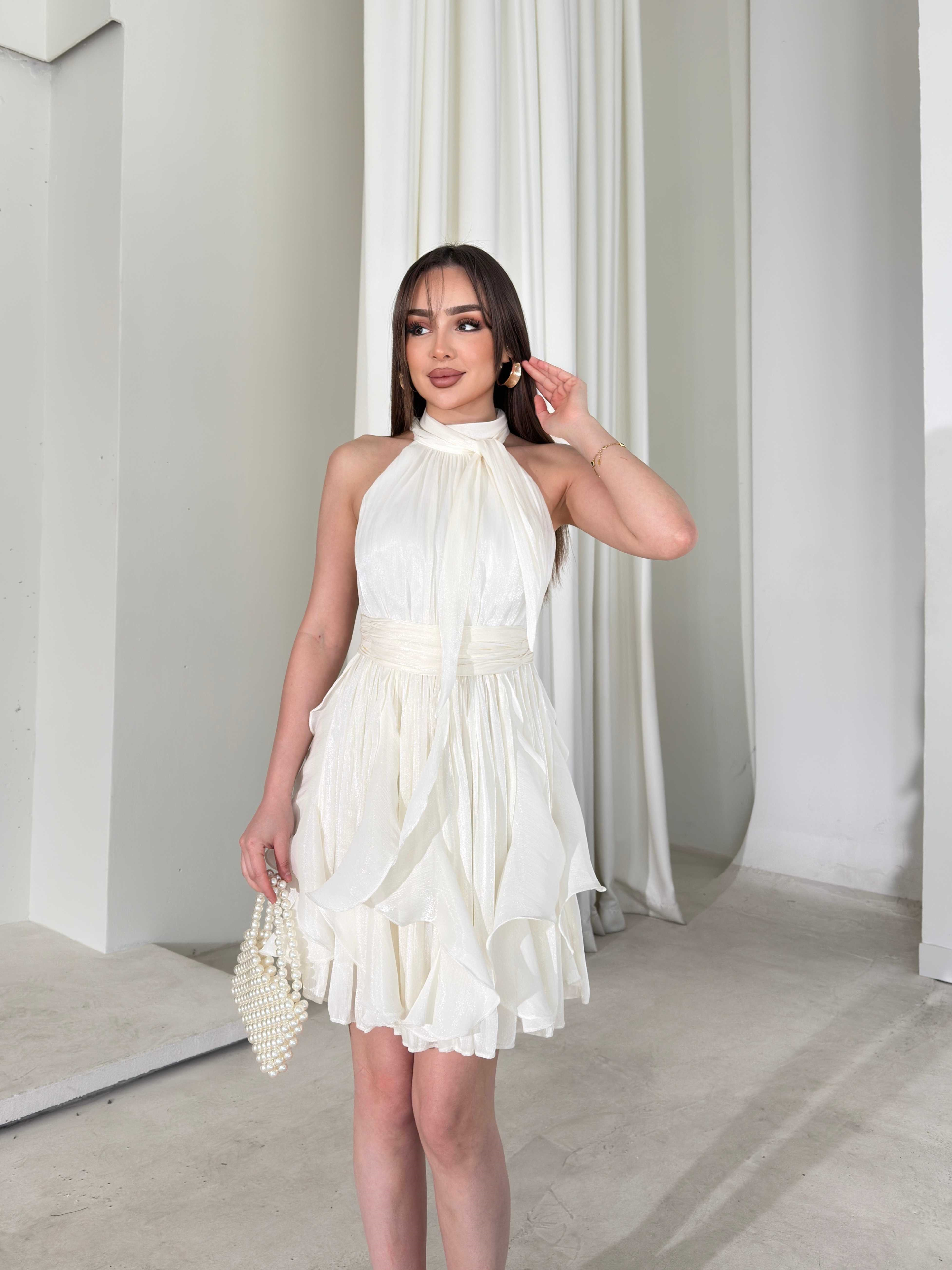 Kemerli Boyundan Bağlamalı Beyaz Mayra Kadın Elbise 26Y184 (26Y184)