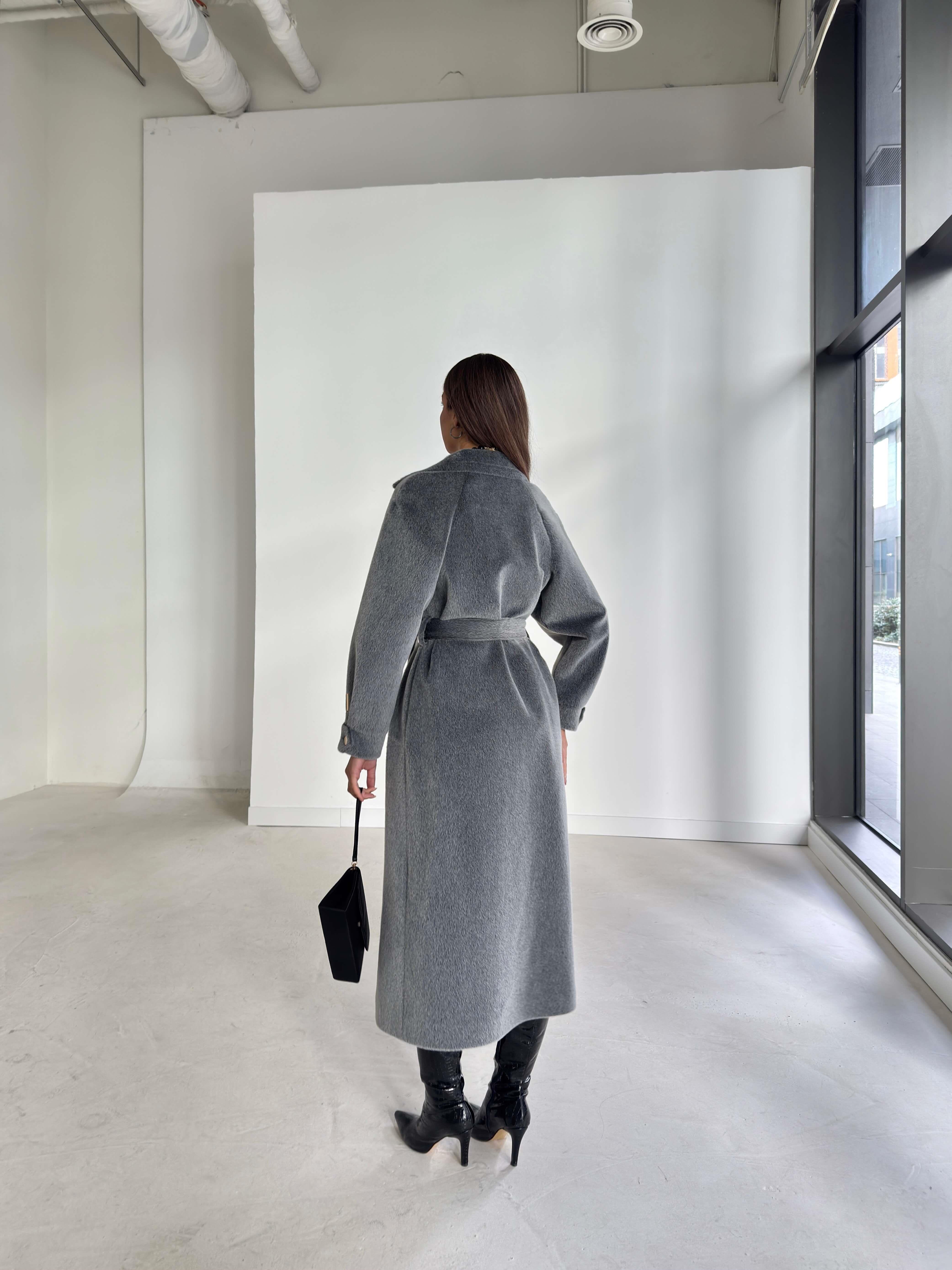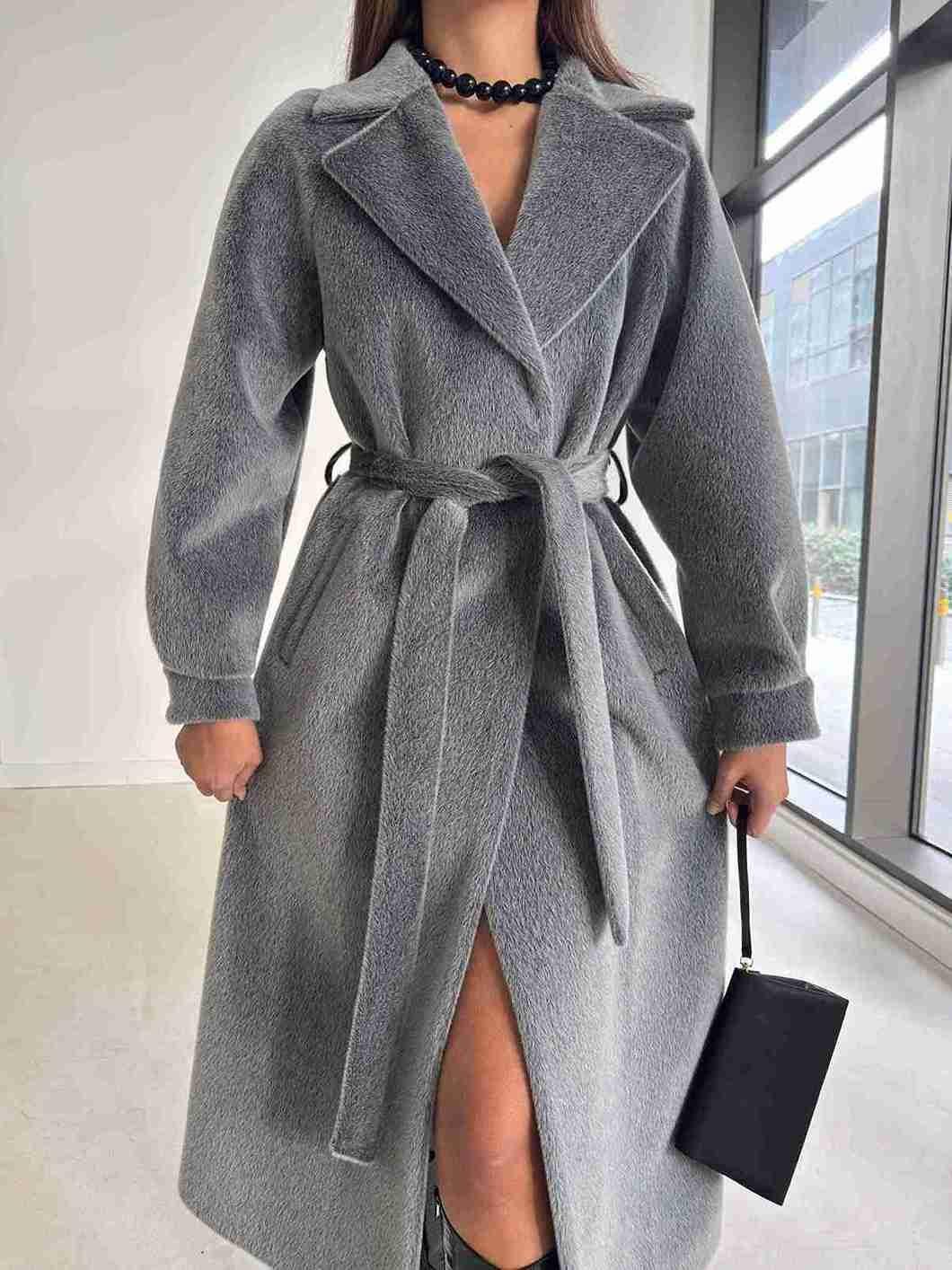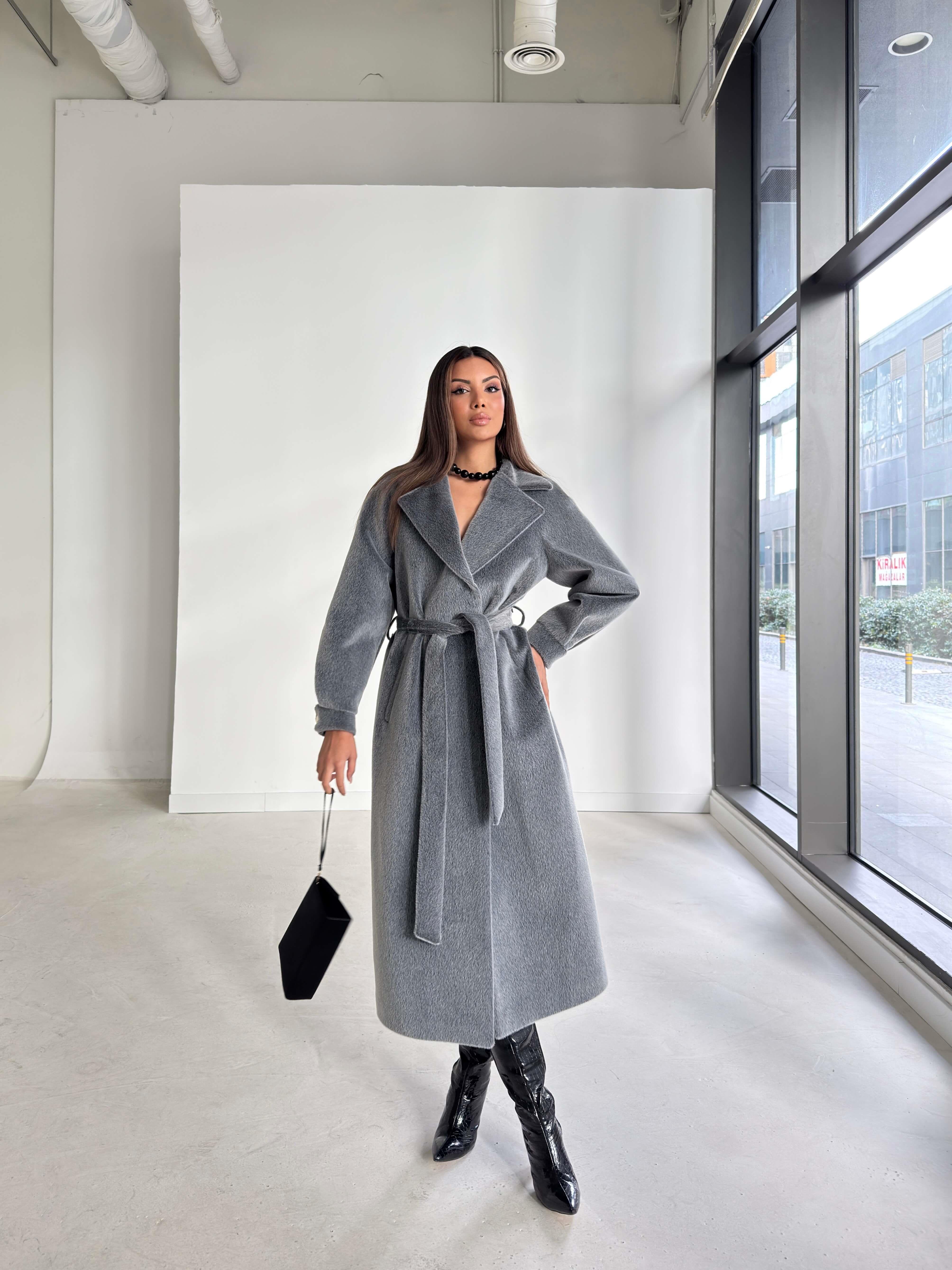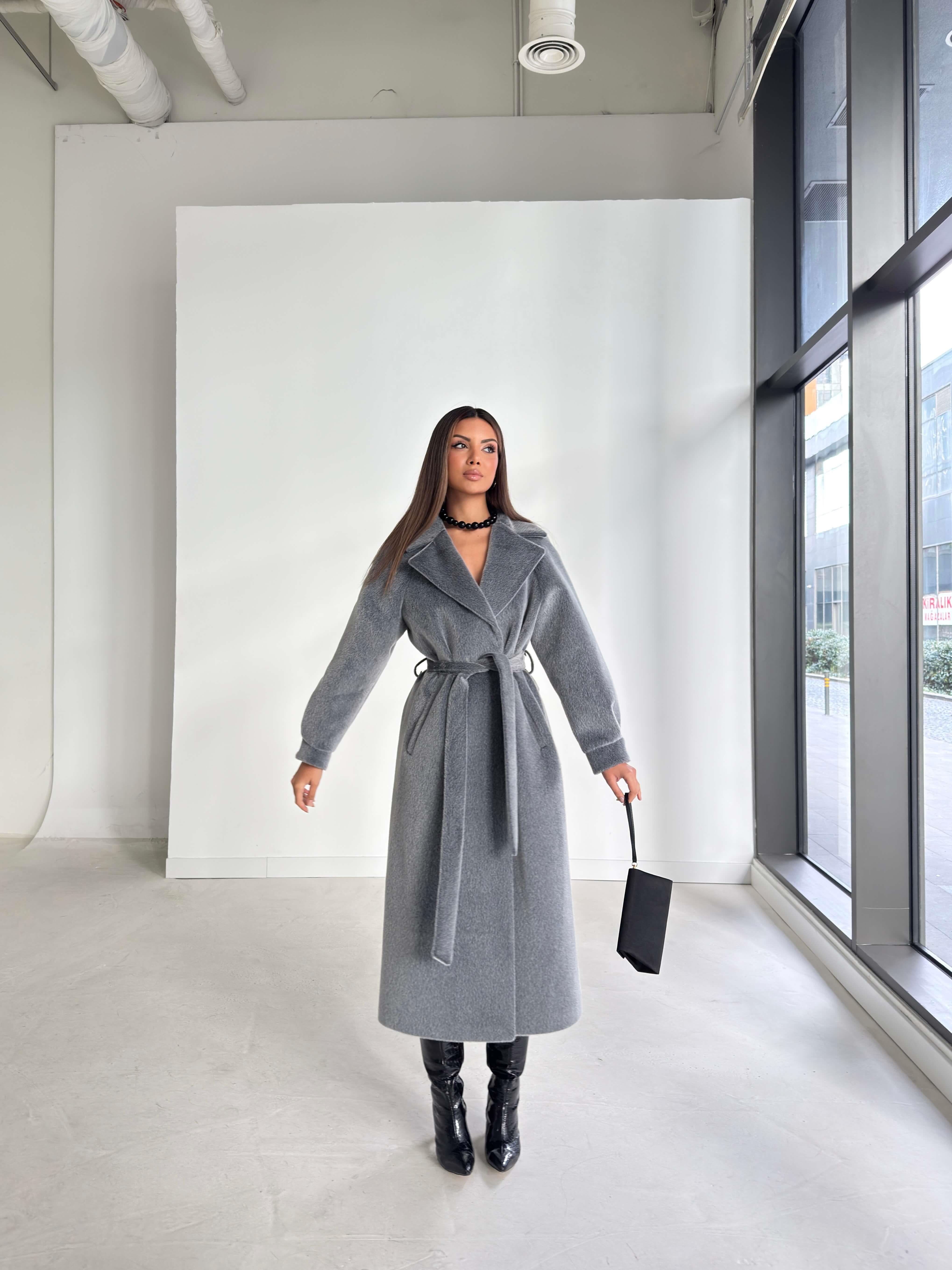Kemerli Kolu Düğmeli Kruvaze Yaka Tayline Gri Kadın Kaban 26K104 (26K104)