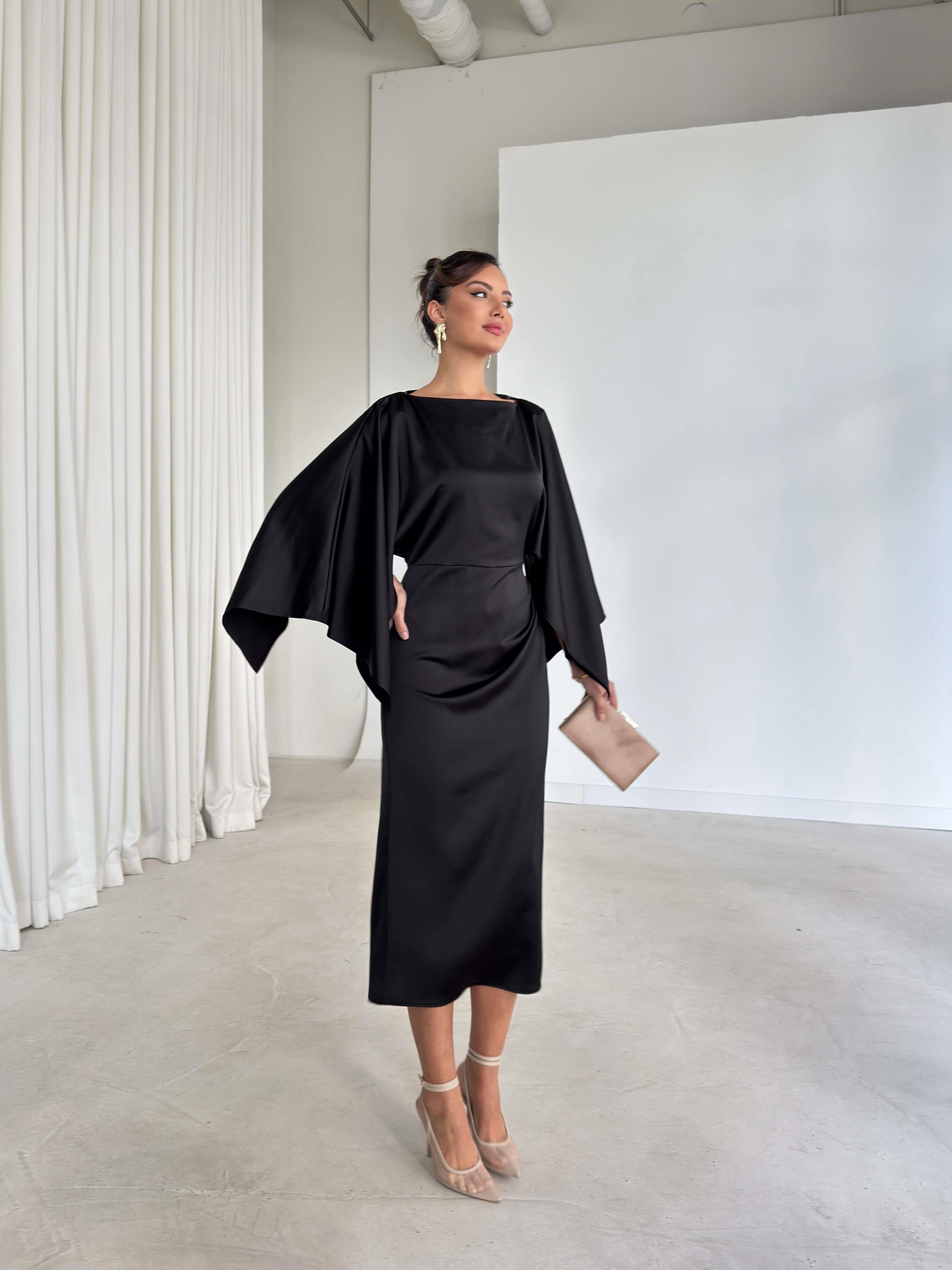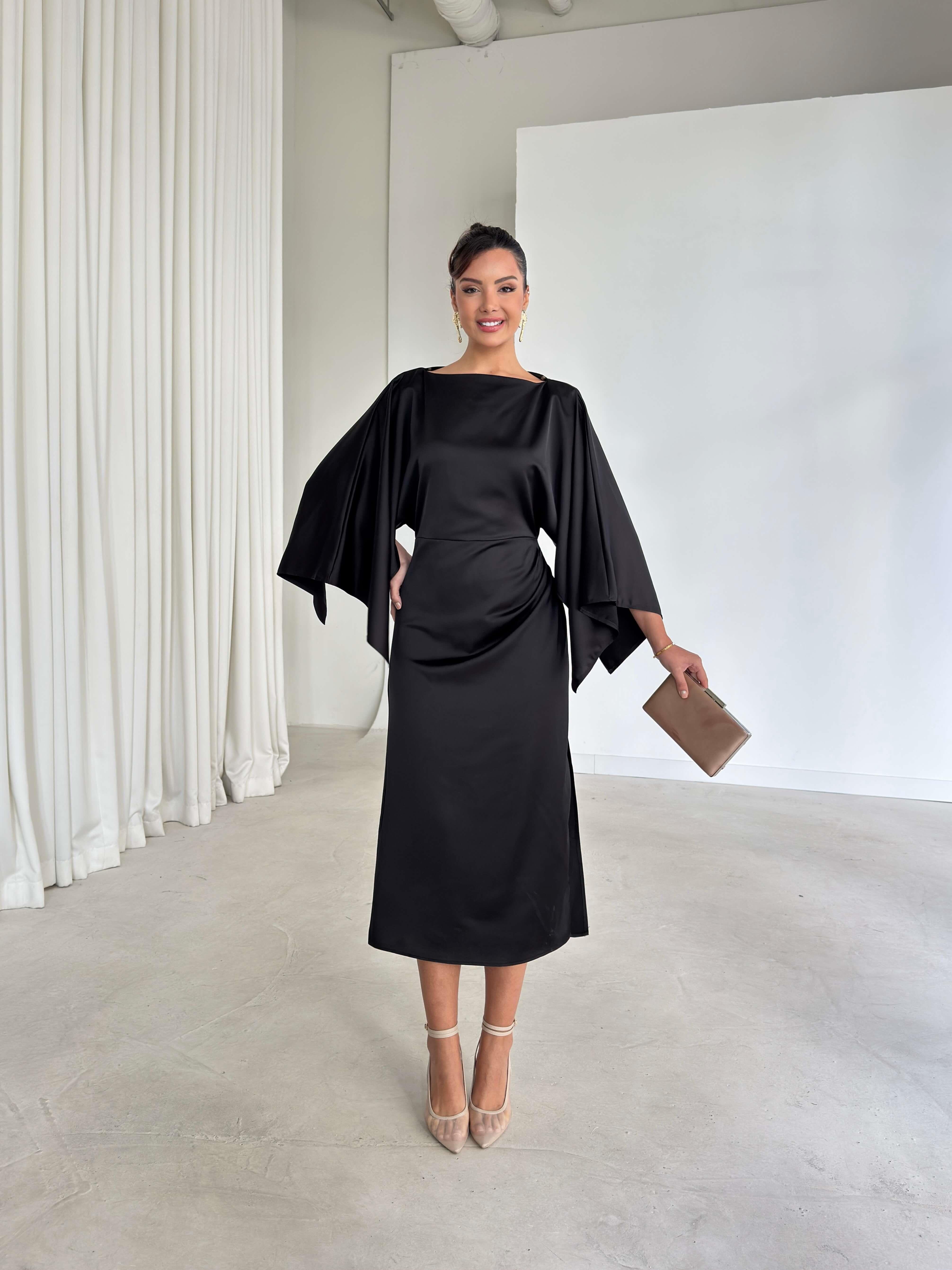 Kolları Ve Yanı Yırtmaçlı Drape Detaylı Berma Siyah Kadın Saten Elbise 26K339 (26K339)