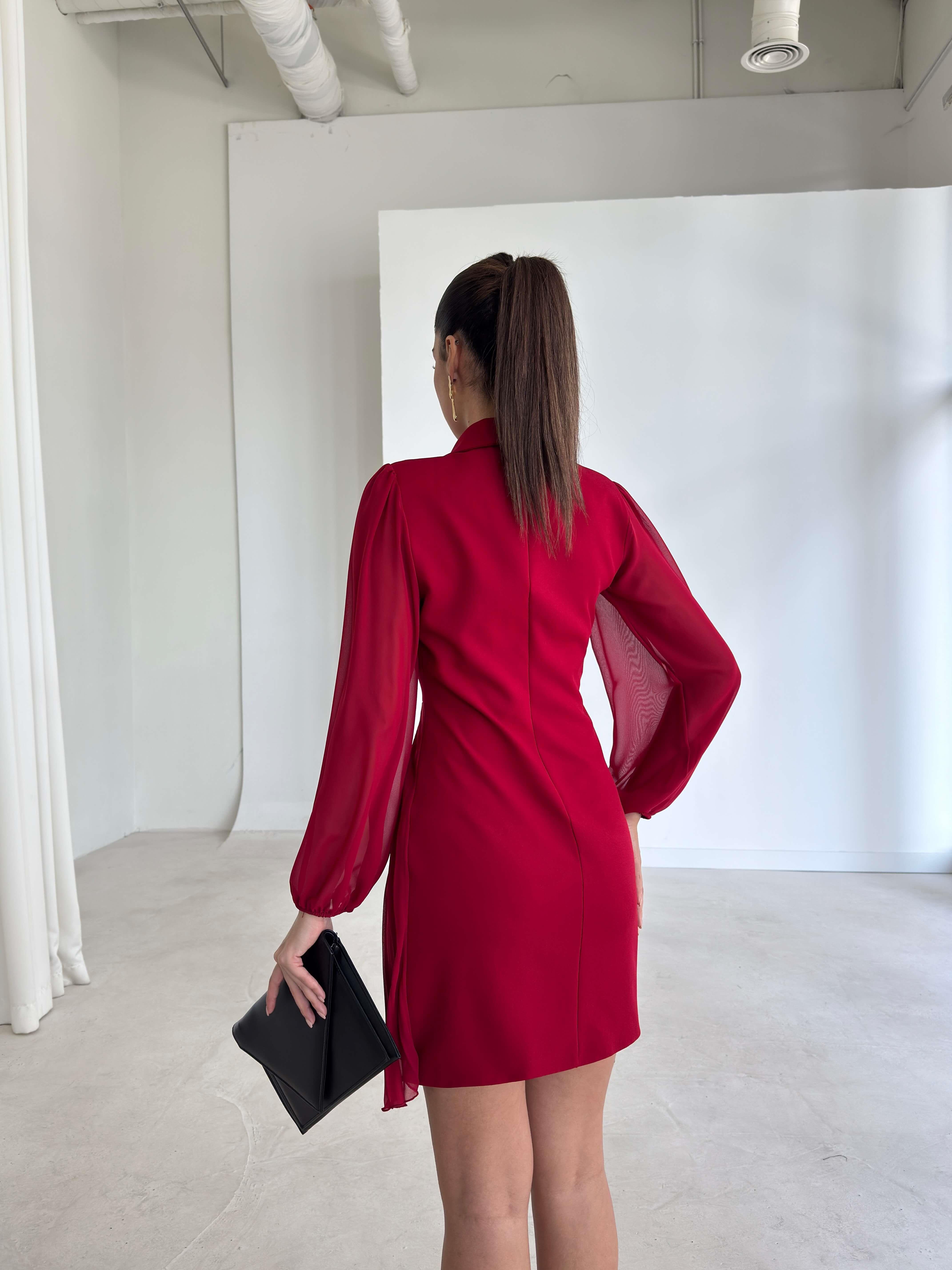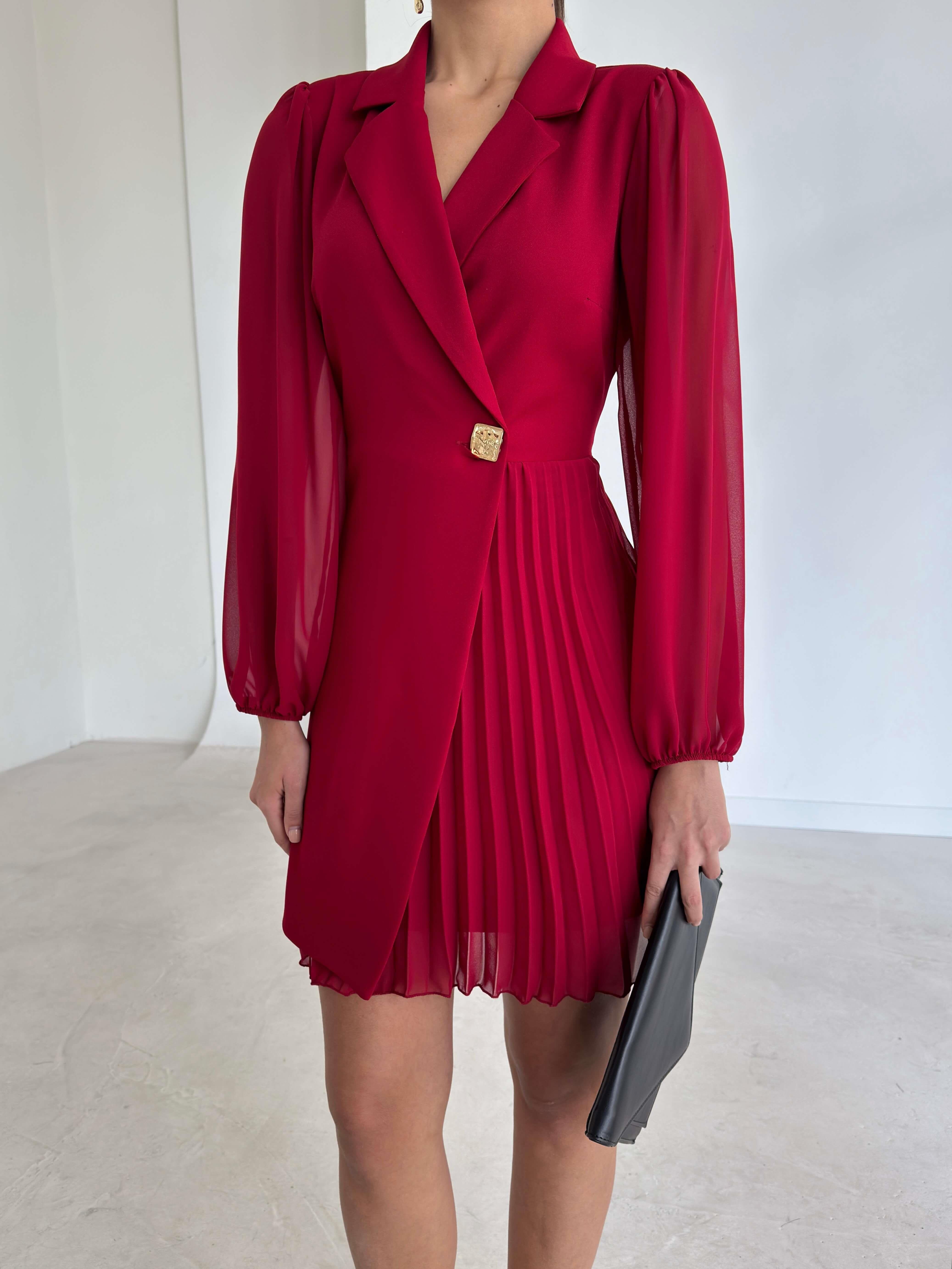 Kruvaze Yaka Tül Kollu Dominik Kırmızı Kadın Ceket Elbise 26K223 (26K223)
