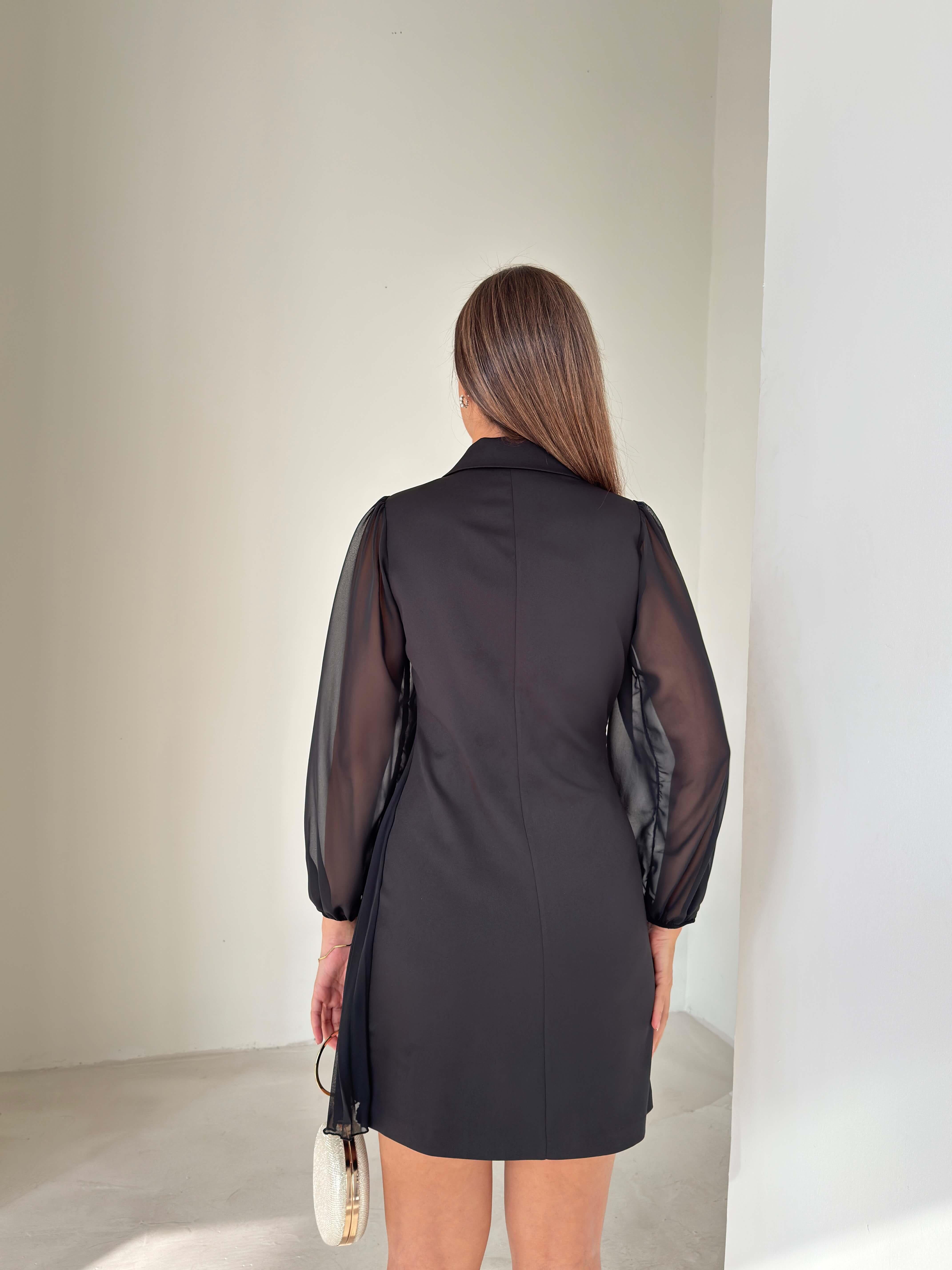 Kruvaze Yaka Tül Kollu Dominik Siyah Kadın Ceket Elbise 26K223 (26K223)