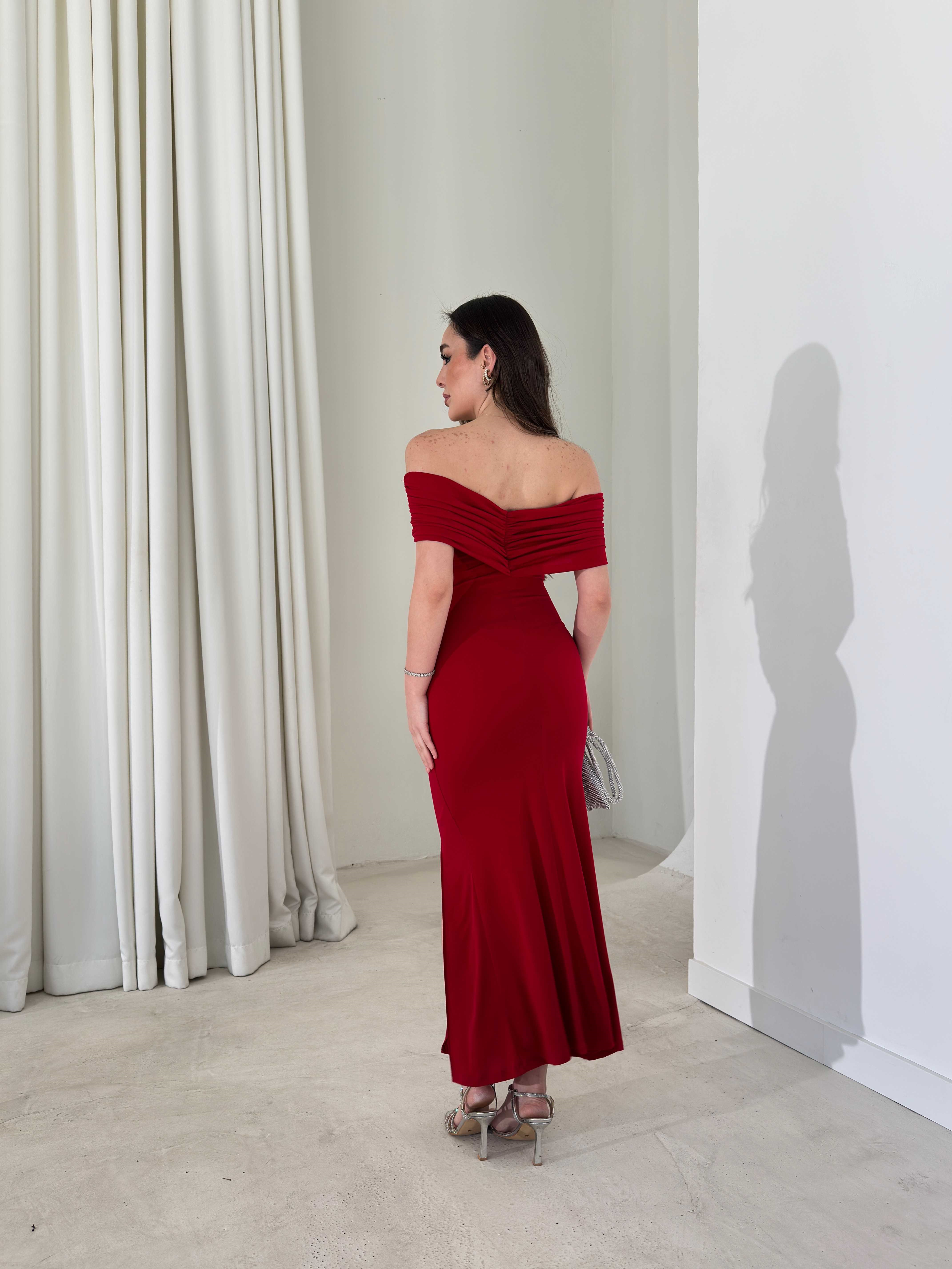 Madonna Yaka Drape Detaylı Yırtmaçlı Midi Kırmızı Onlim Kadın Elbise 26Y083 (26Y083)