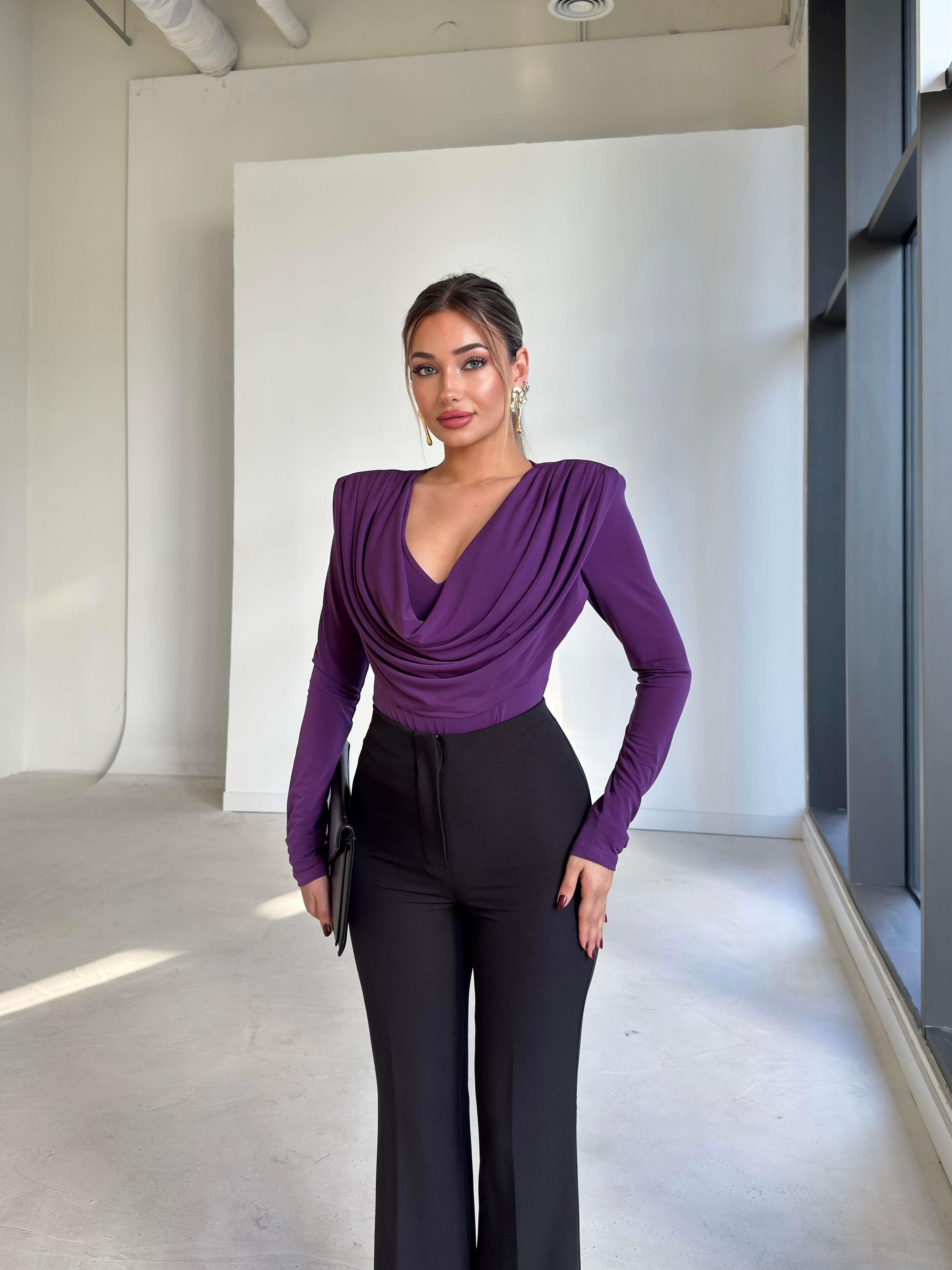 Omzu Vatkalı Uzun Kol Degaje Yaka Dinre Kadın Mor Bluz 26K101 (26K101)