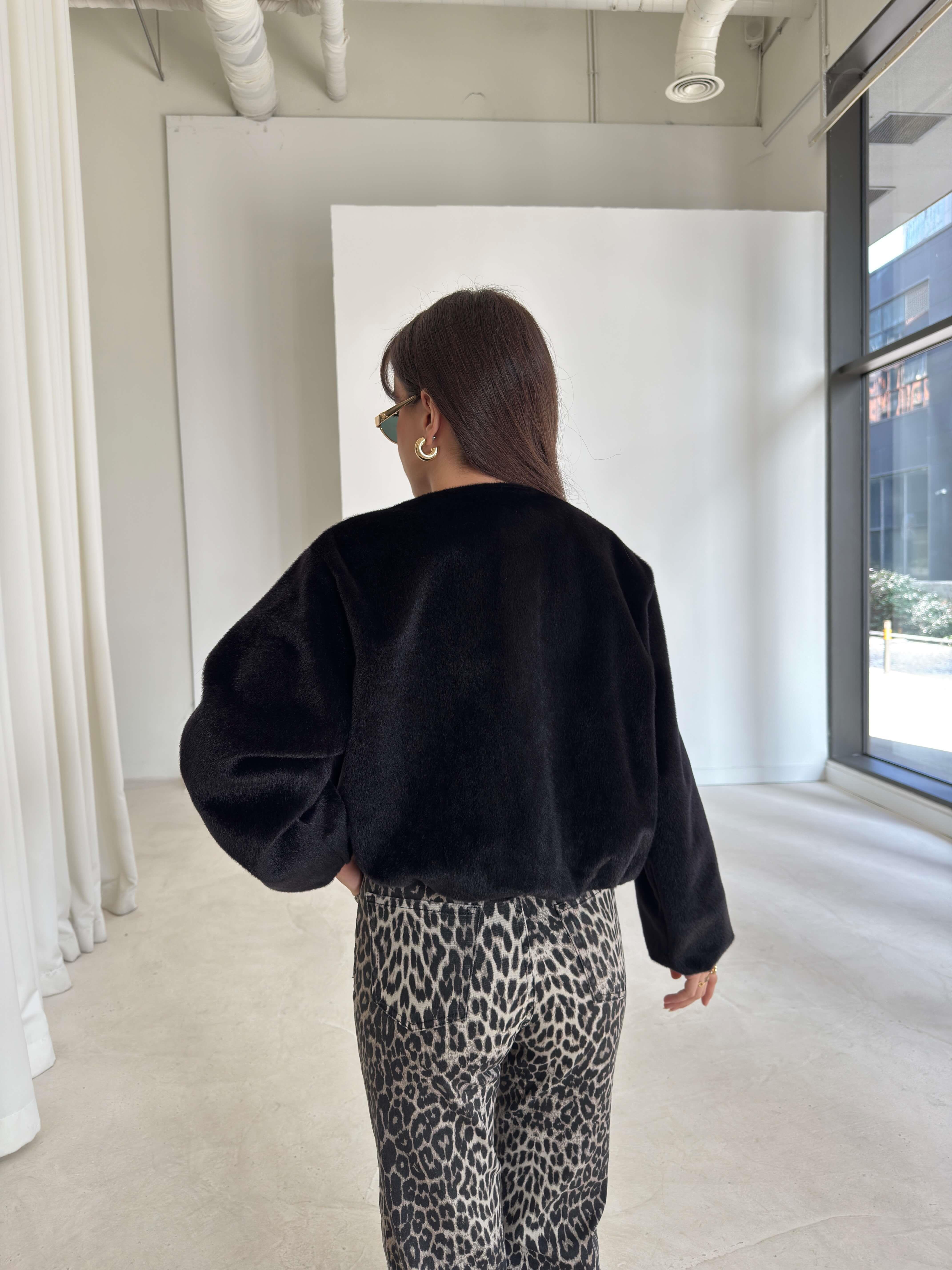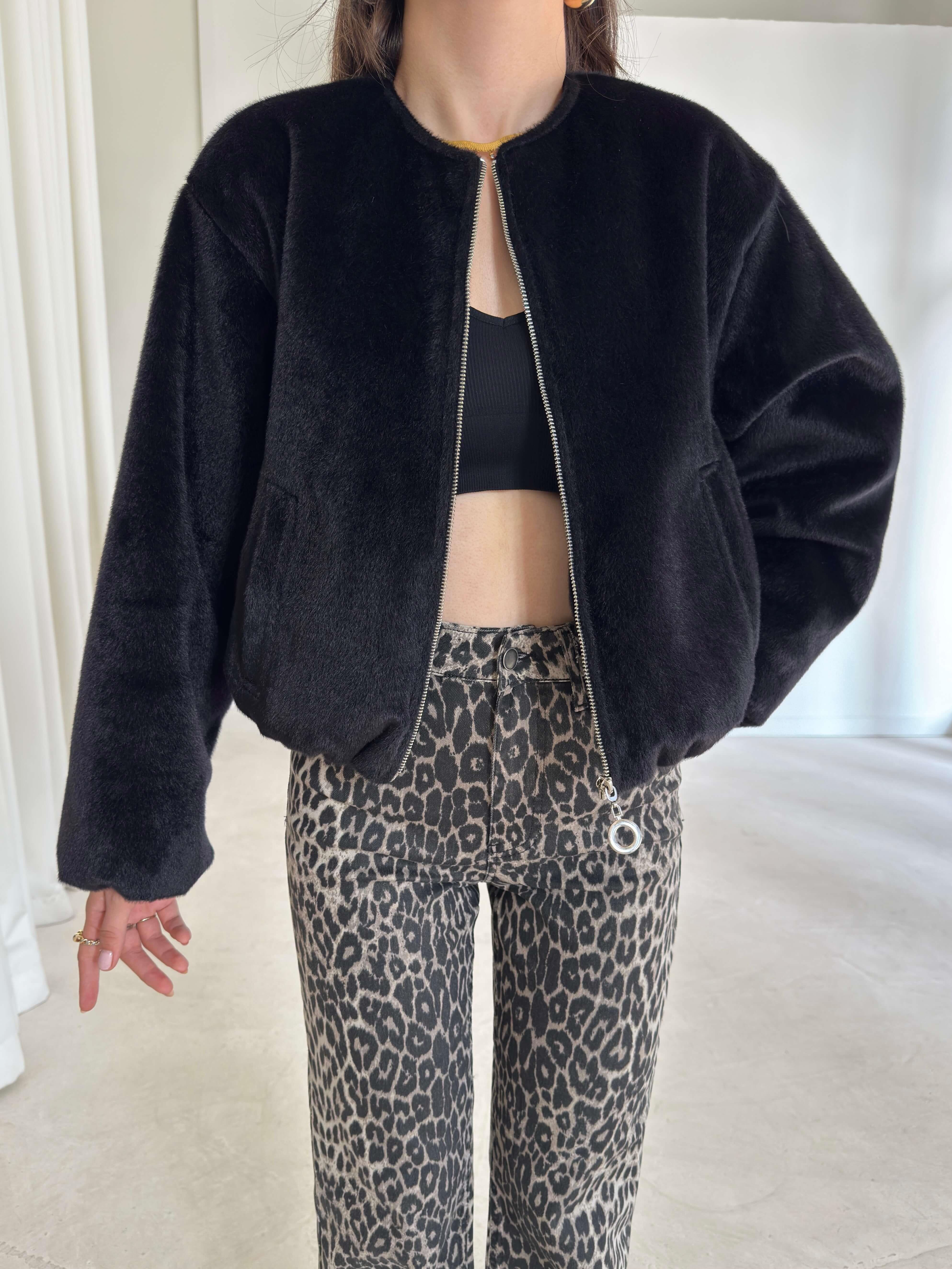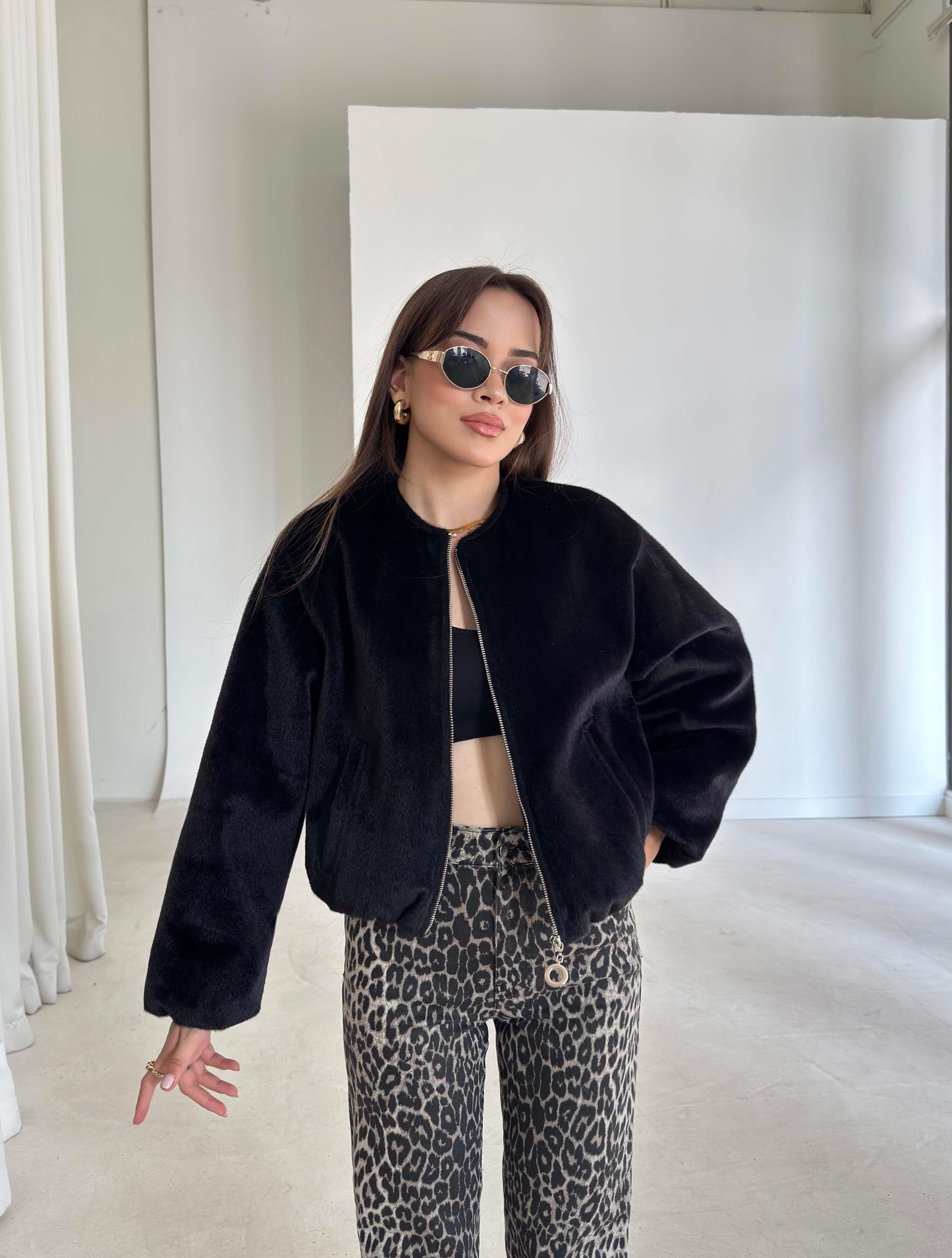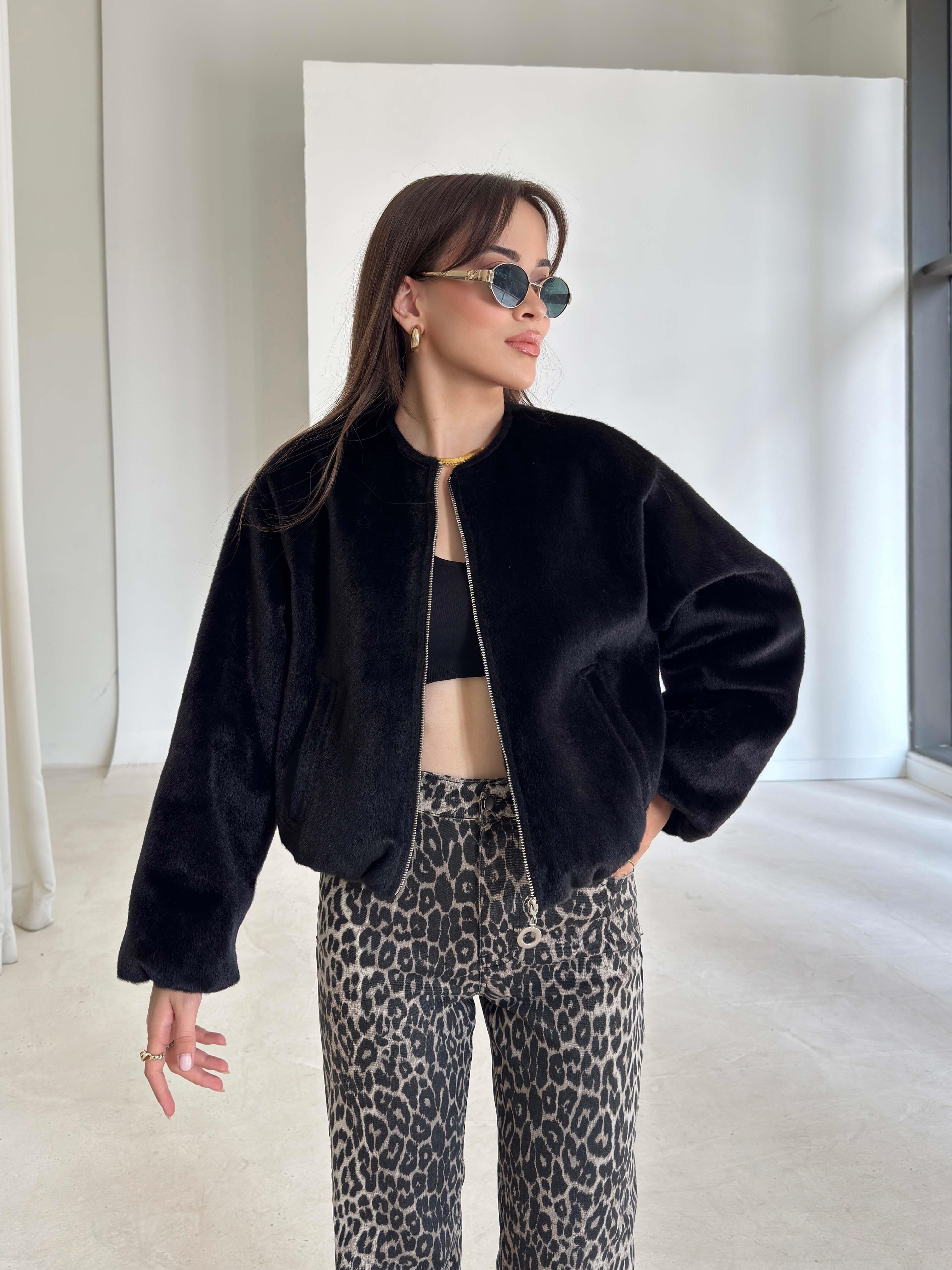 Önü Fermuarlı Gizli Cepli Bomber Darian Siyah Kadın Crop Ceket 26K219 (26K219)