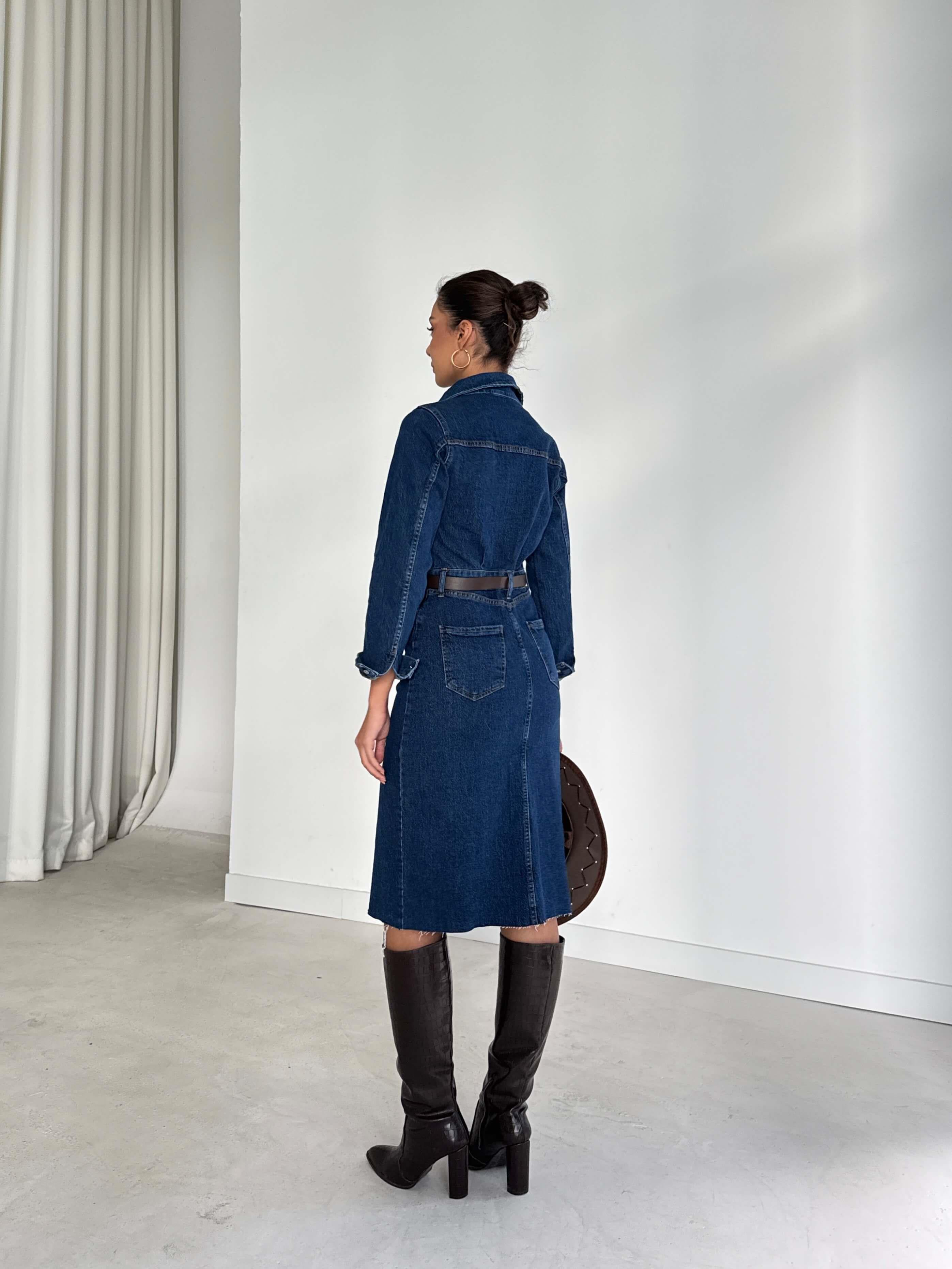 Önü Yırtmaçlı Düğmeli Cep Detaylı Linerda Lacivert Kadın Kot Elbise 26K261 (26K261)