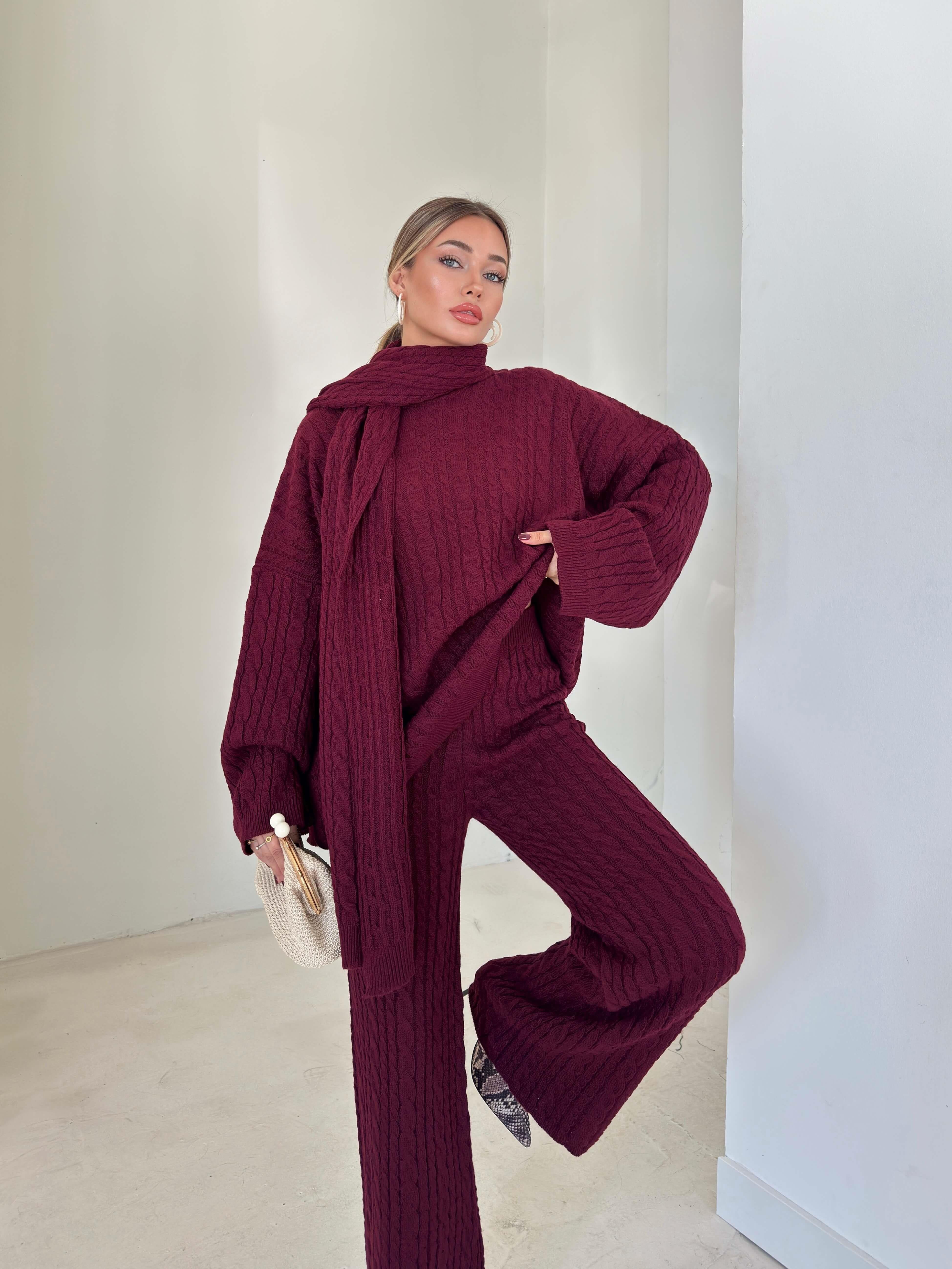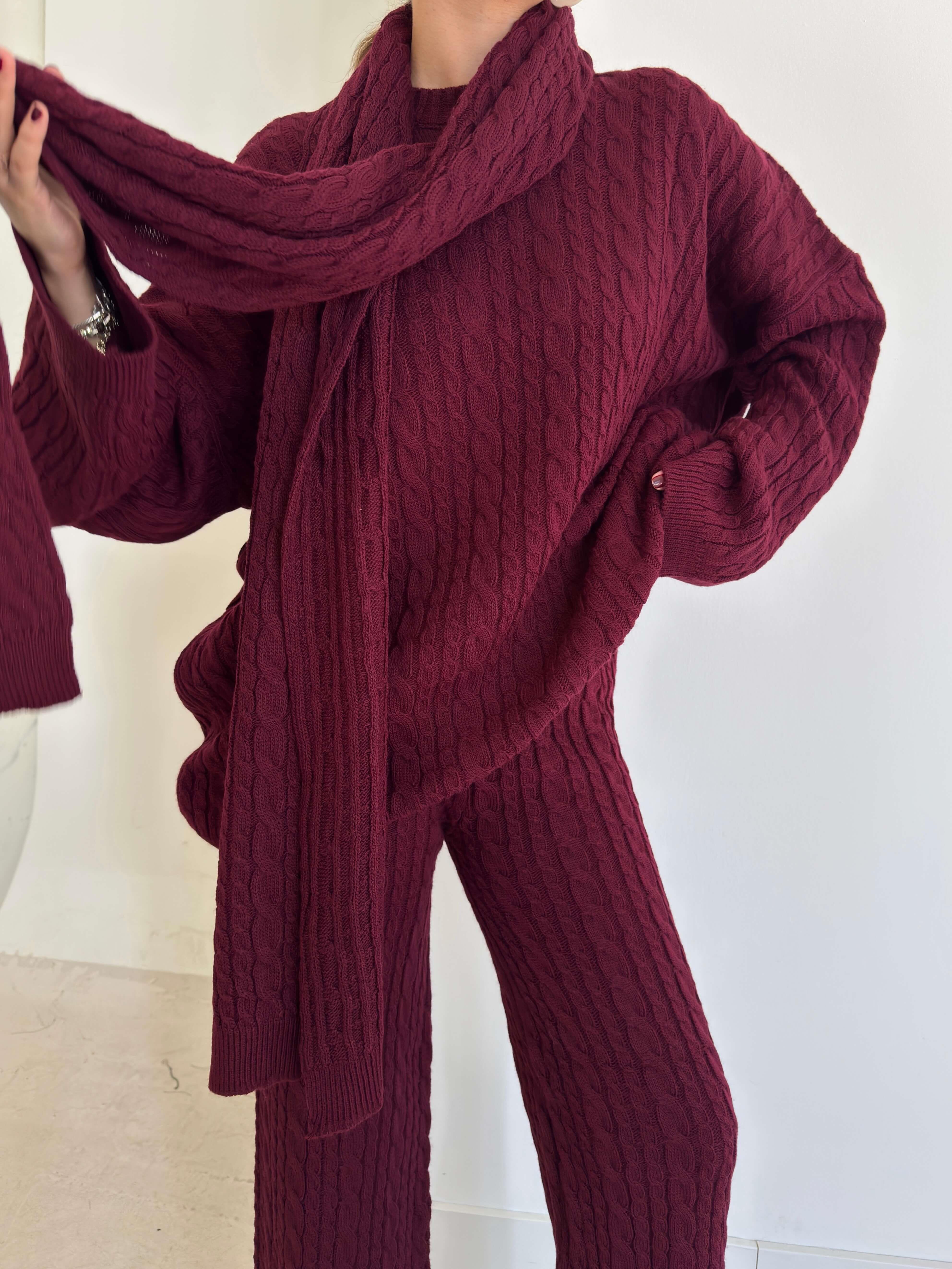 Oversize Kazak Bol Paça Pantolon Ve Atkılı Kalli Kadın Bordo Üçlü Triko Takım 26K093 (26K093)