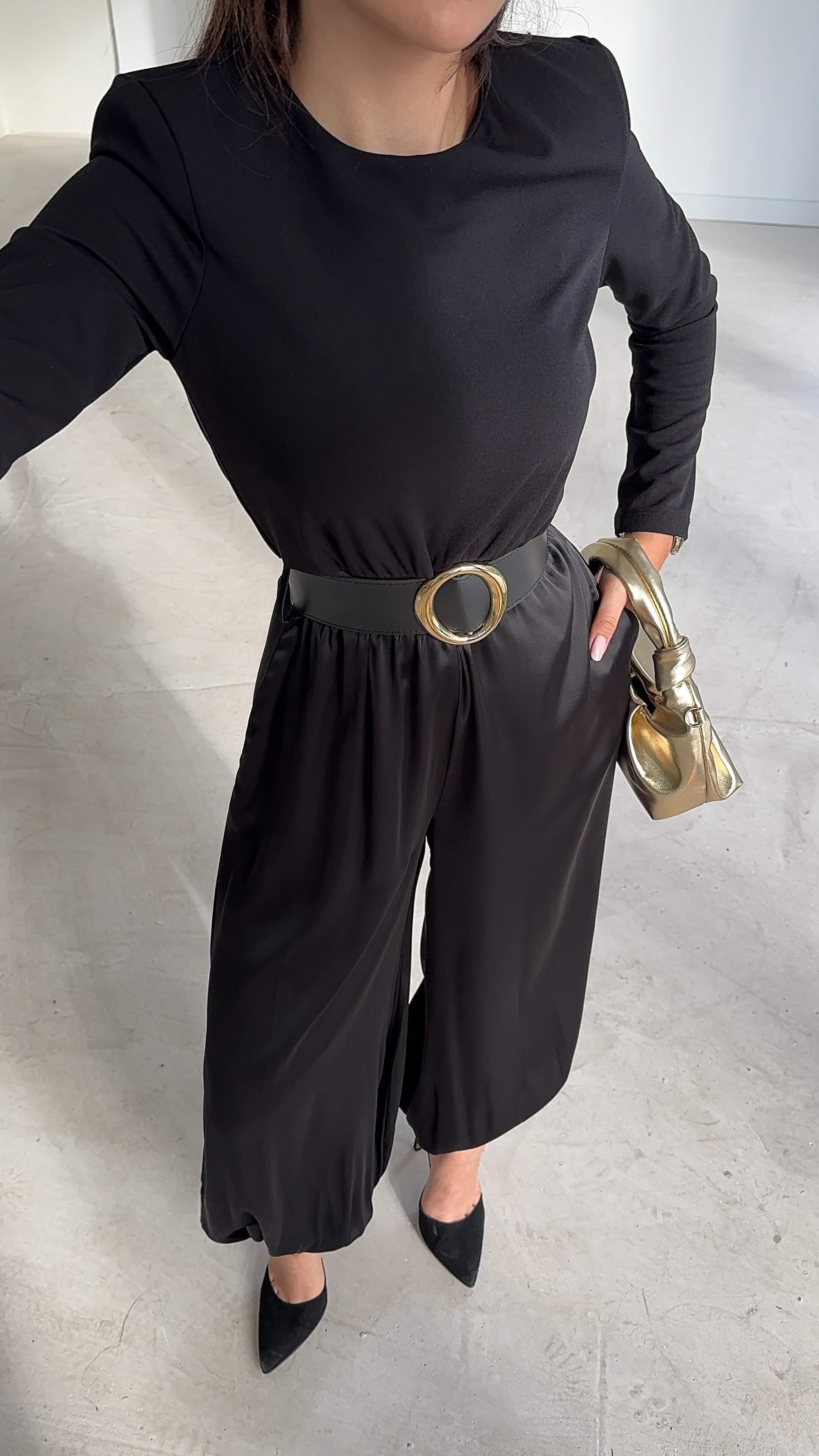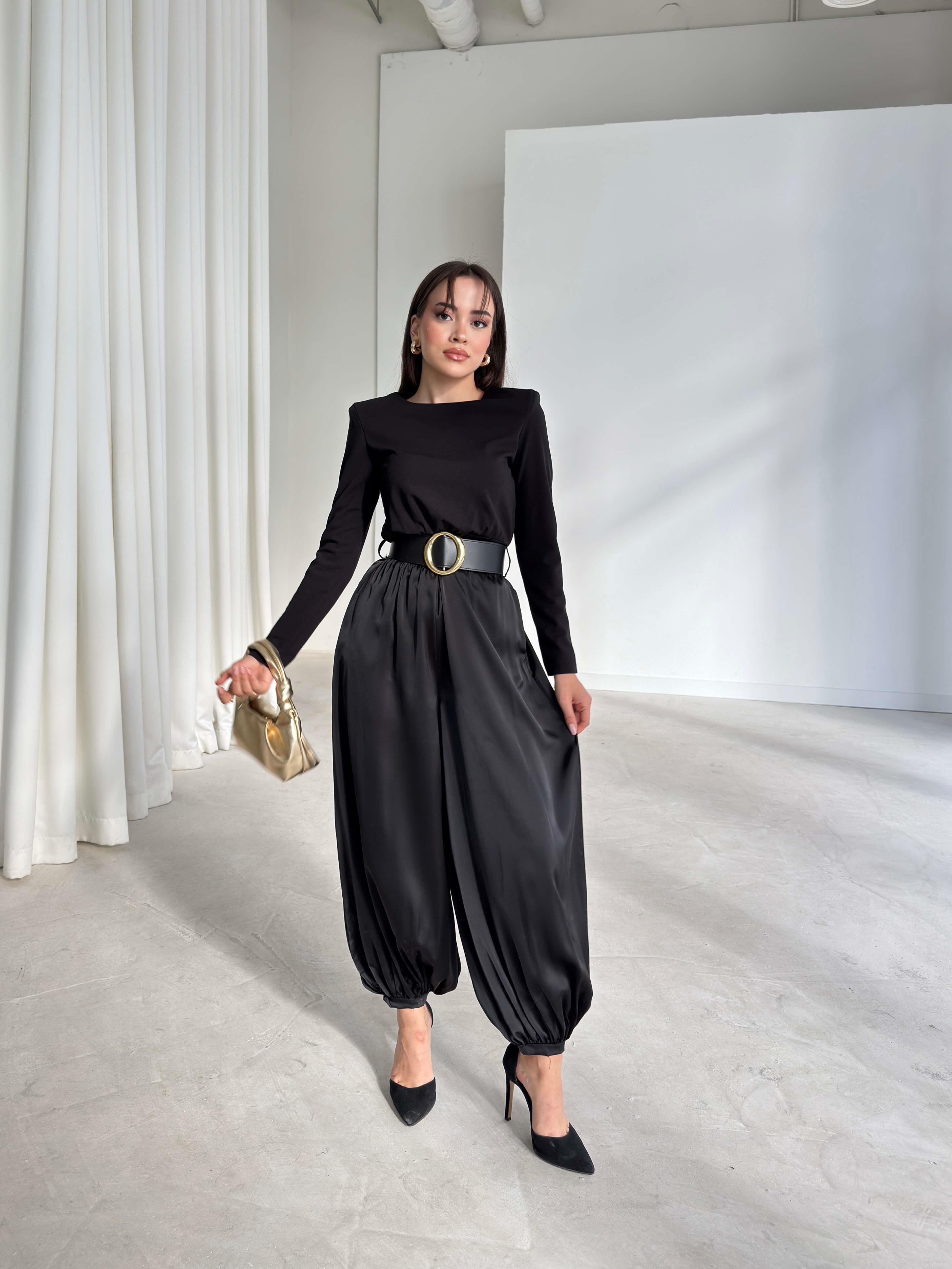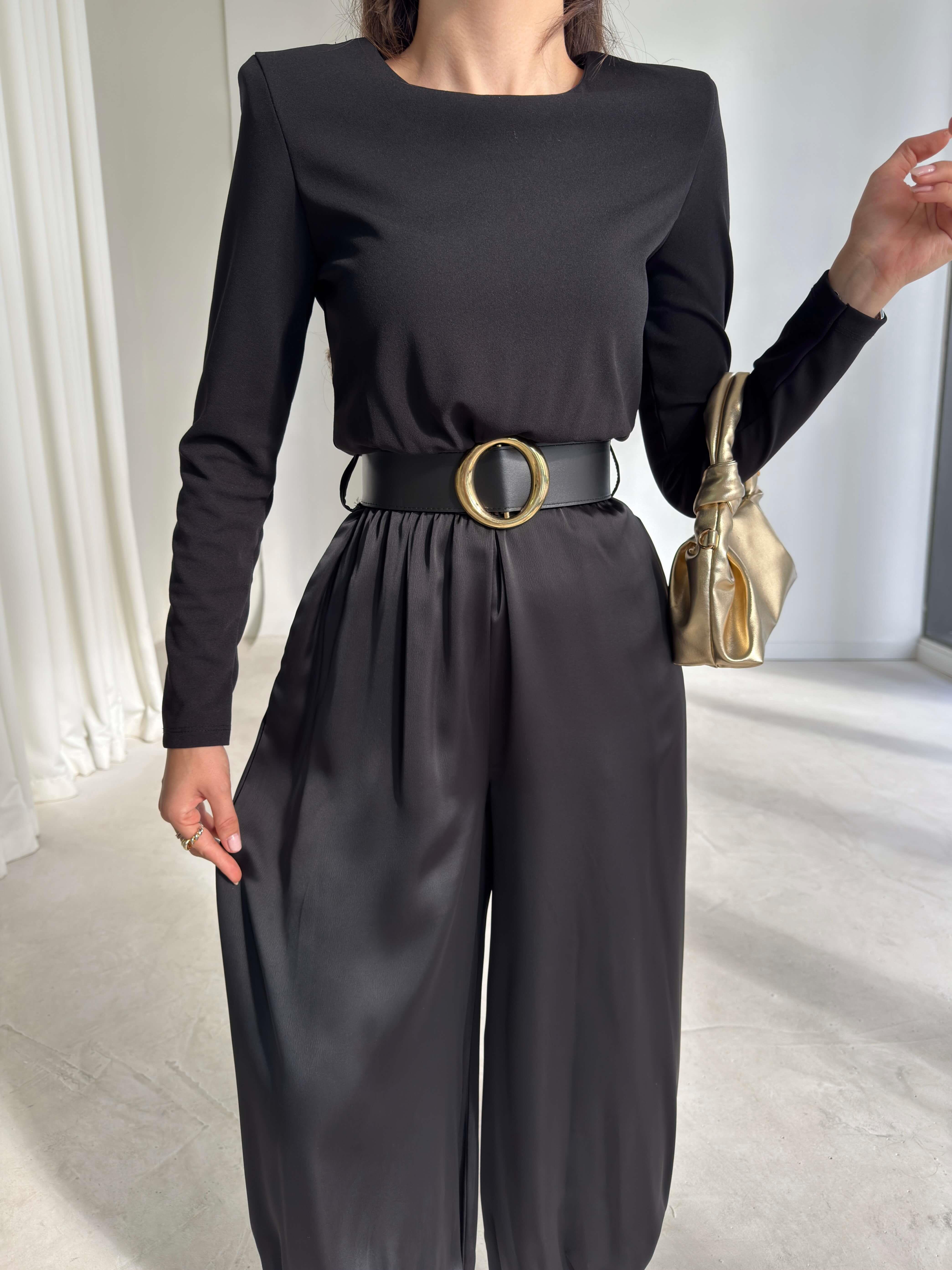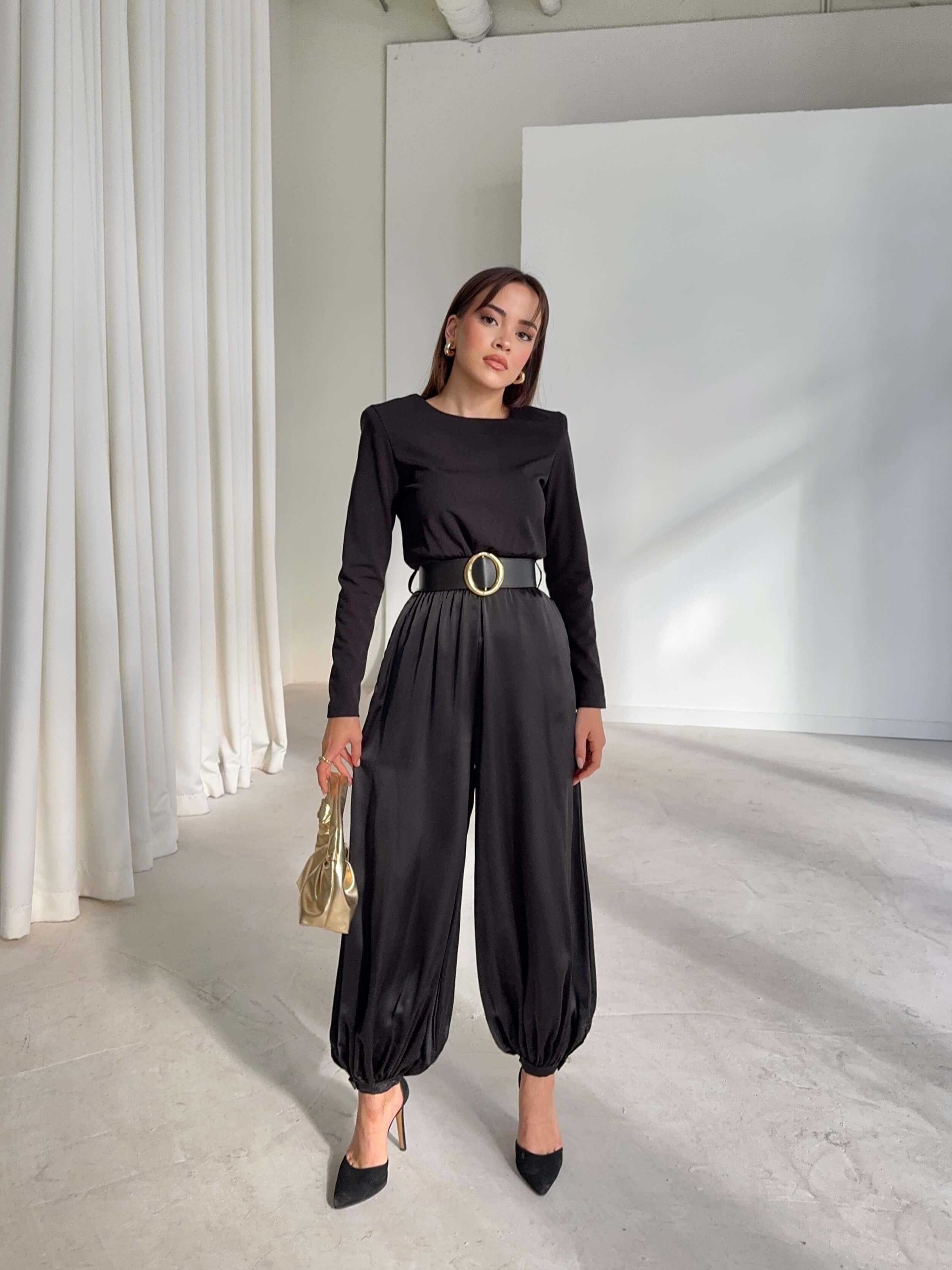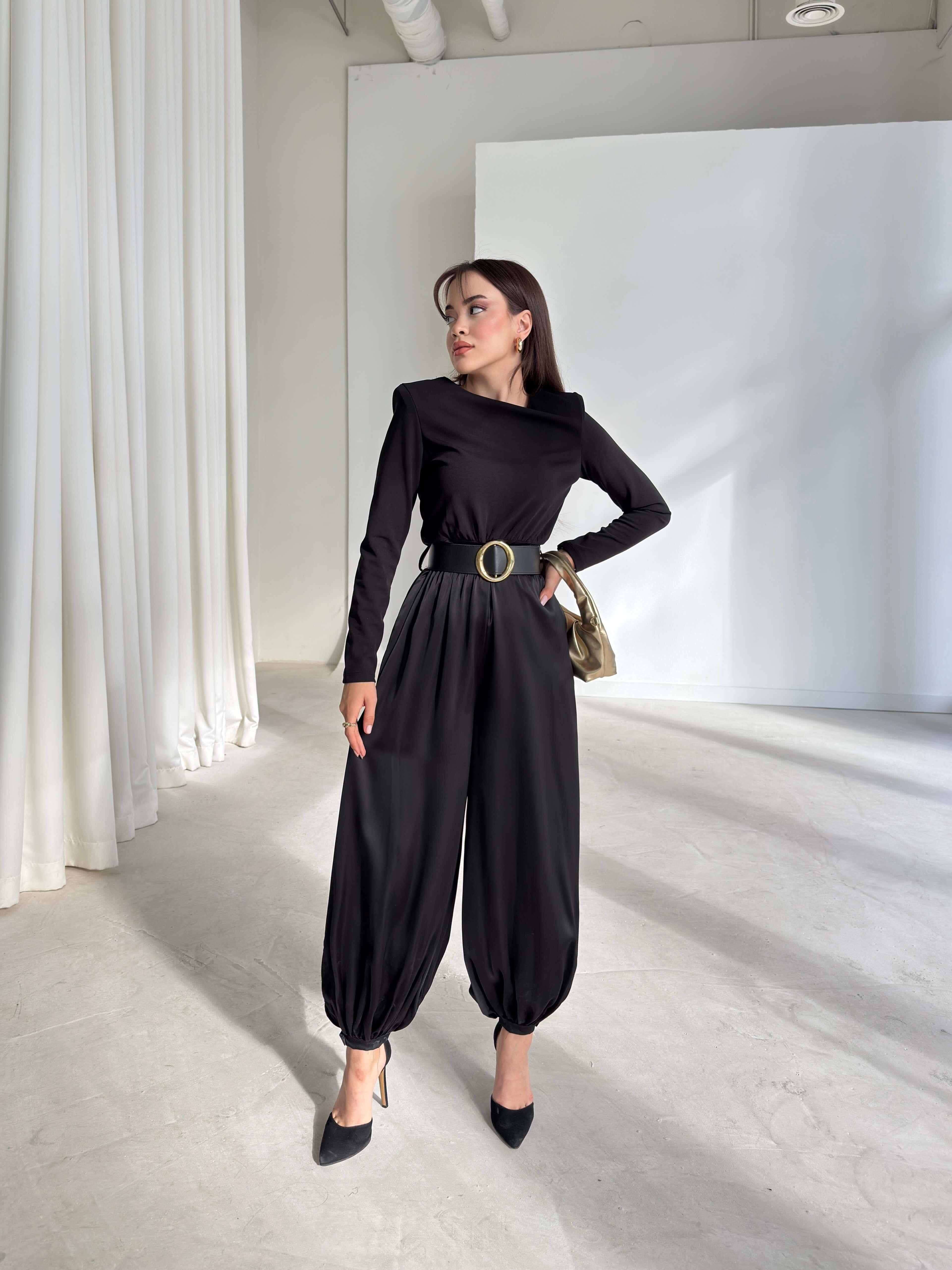 Paçası Düğmeli Kemerli Vatkalı Altı Saten Albert Siyah Kadın Tulum 26K205 (26K205)