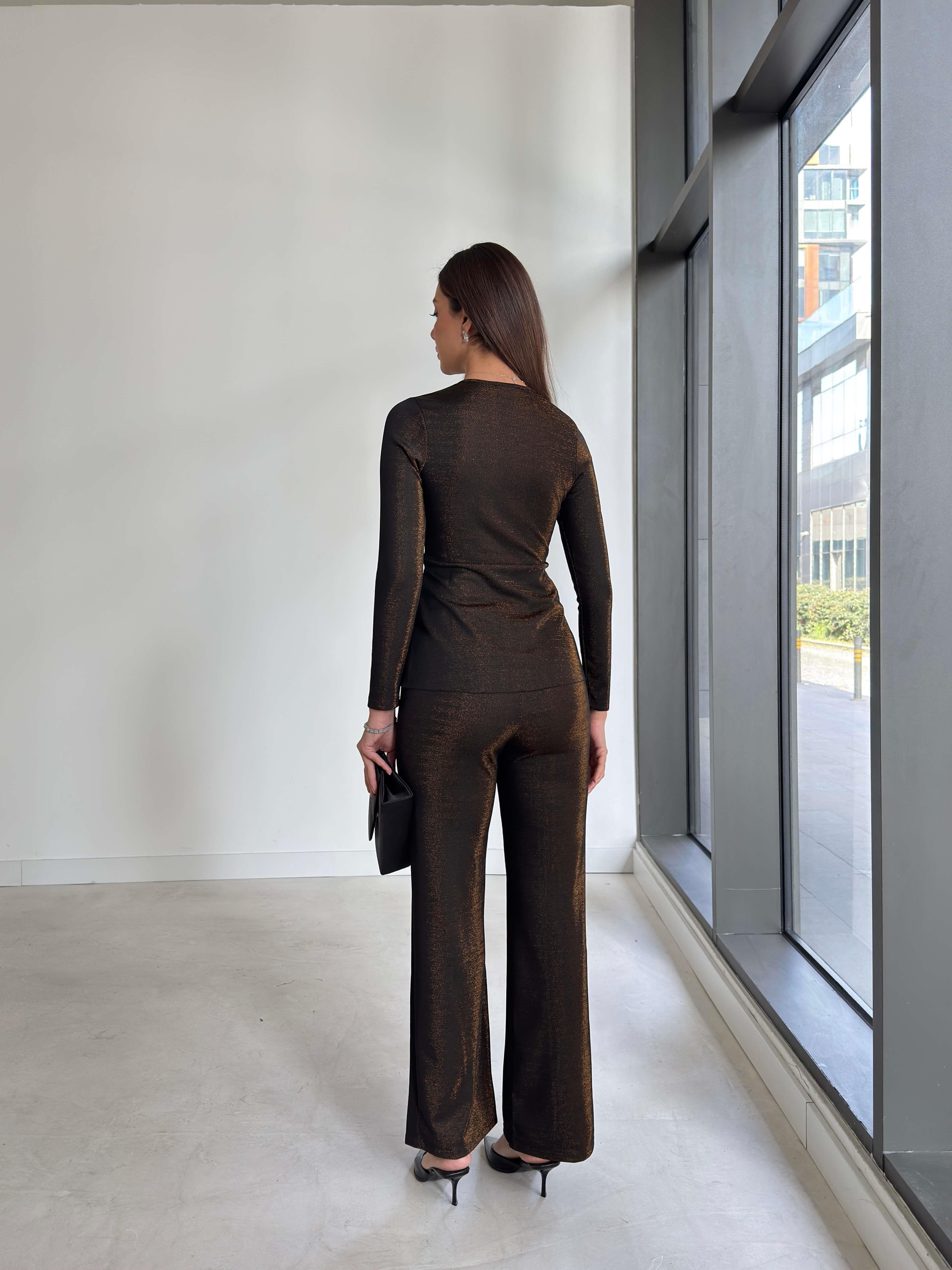 Parlak Kruvaze Yaka Drapeli Helre Bakır Kadın İkili Takım 26K297 (26K297)