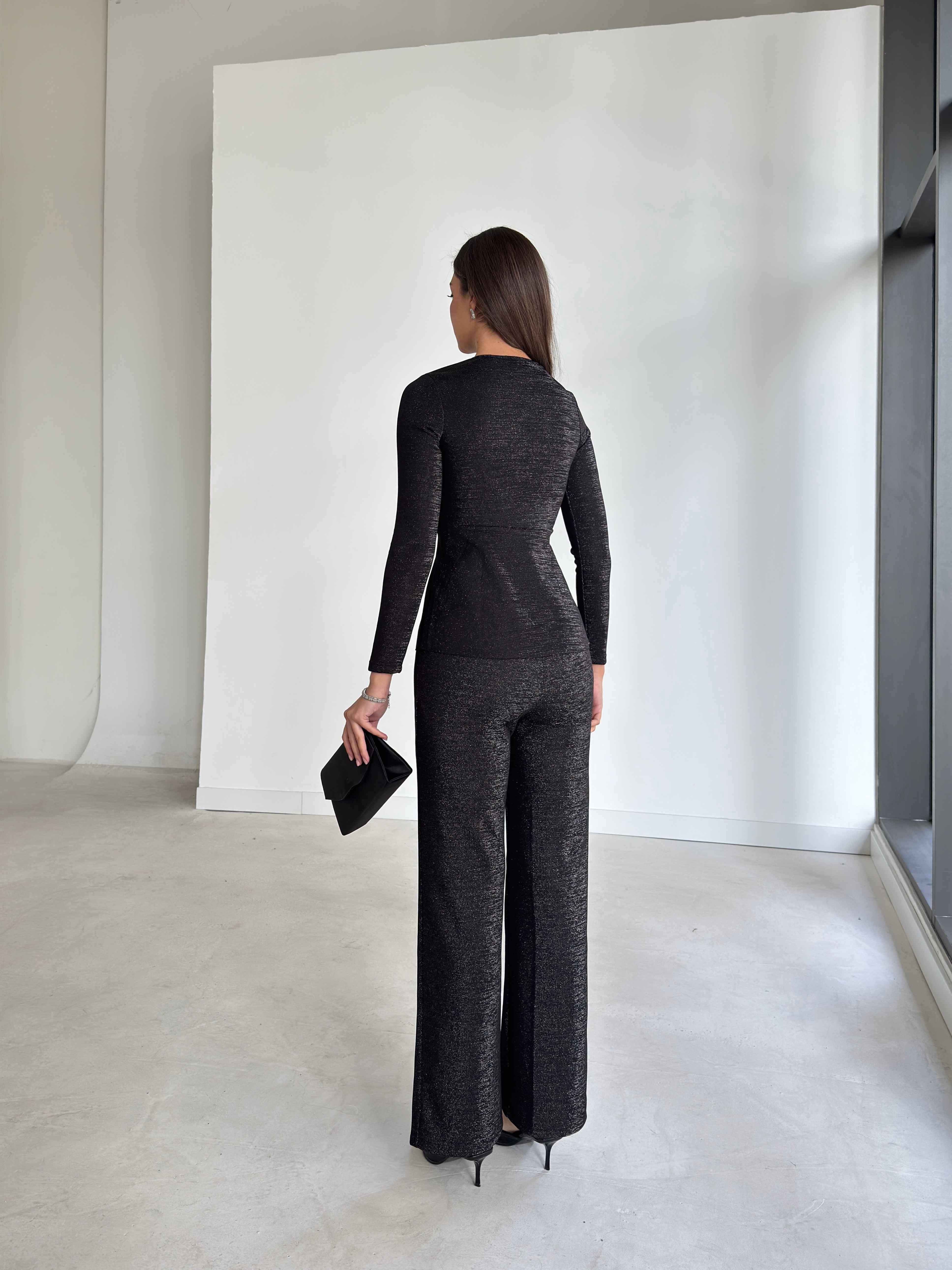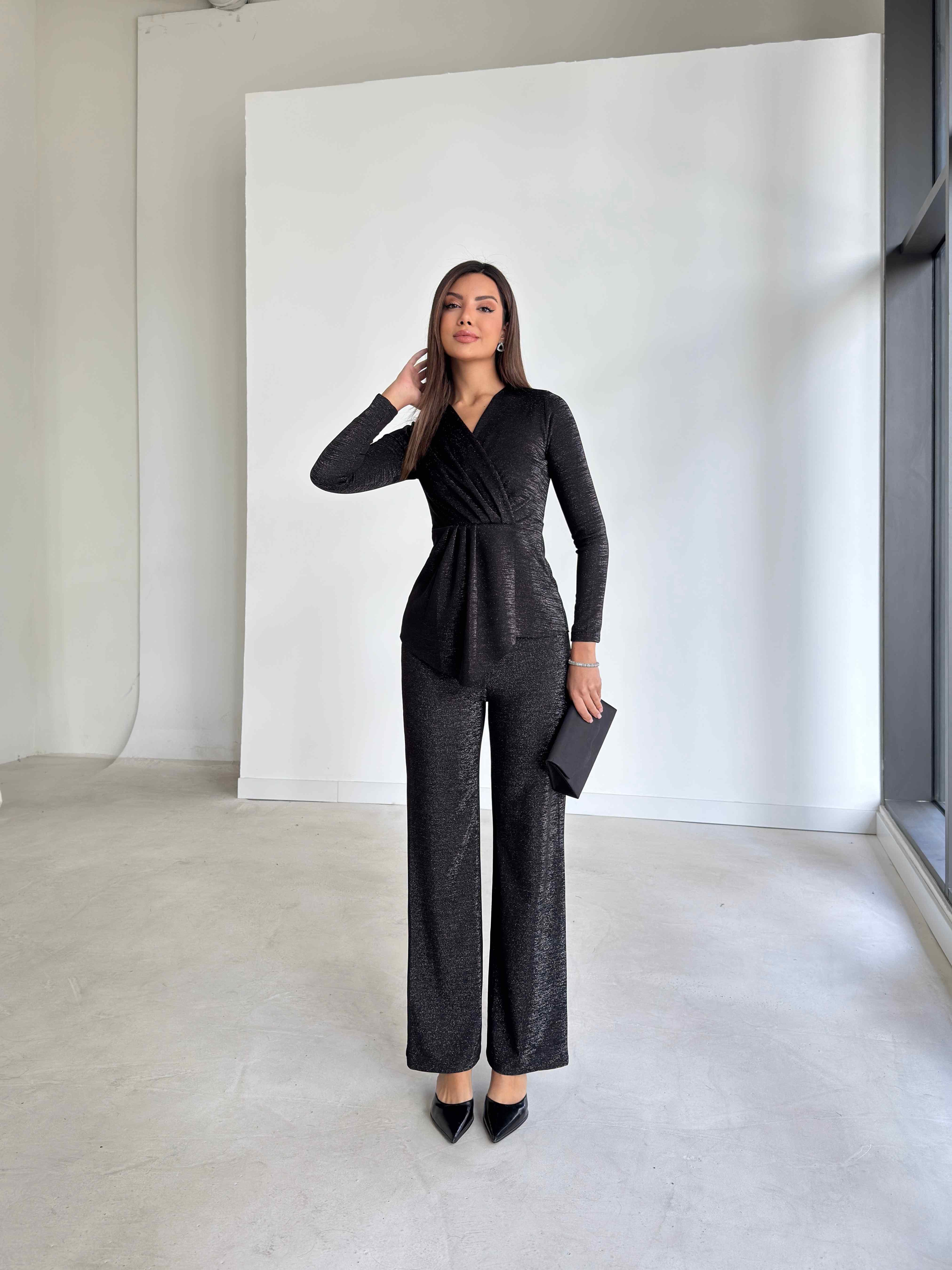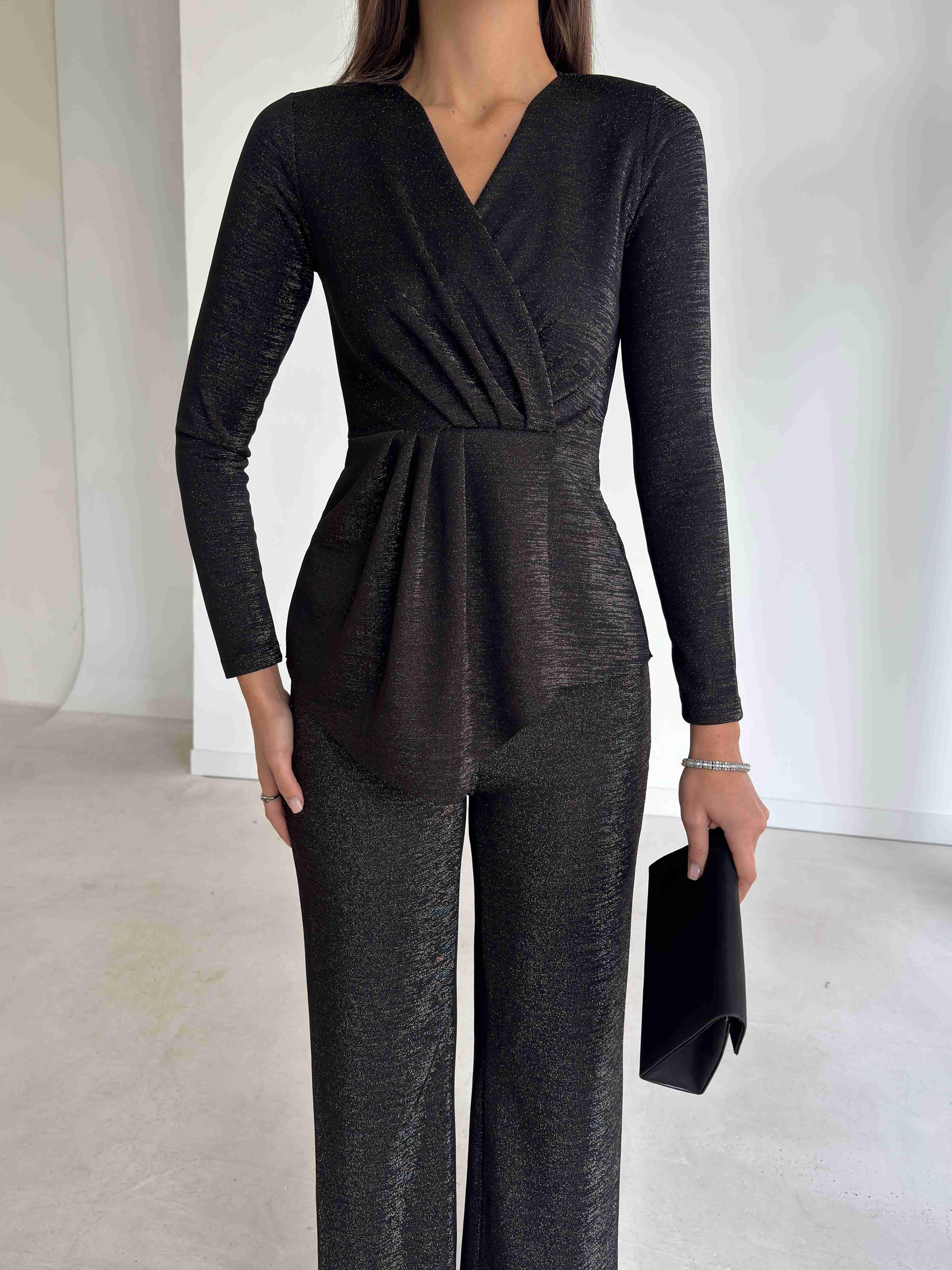Parlak Kruvaze Yaka Drapeli Helre Siyah Kadın İkili Takım 26K297 (26K297)