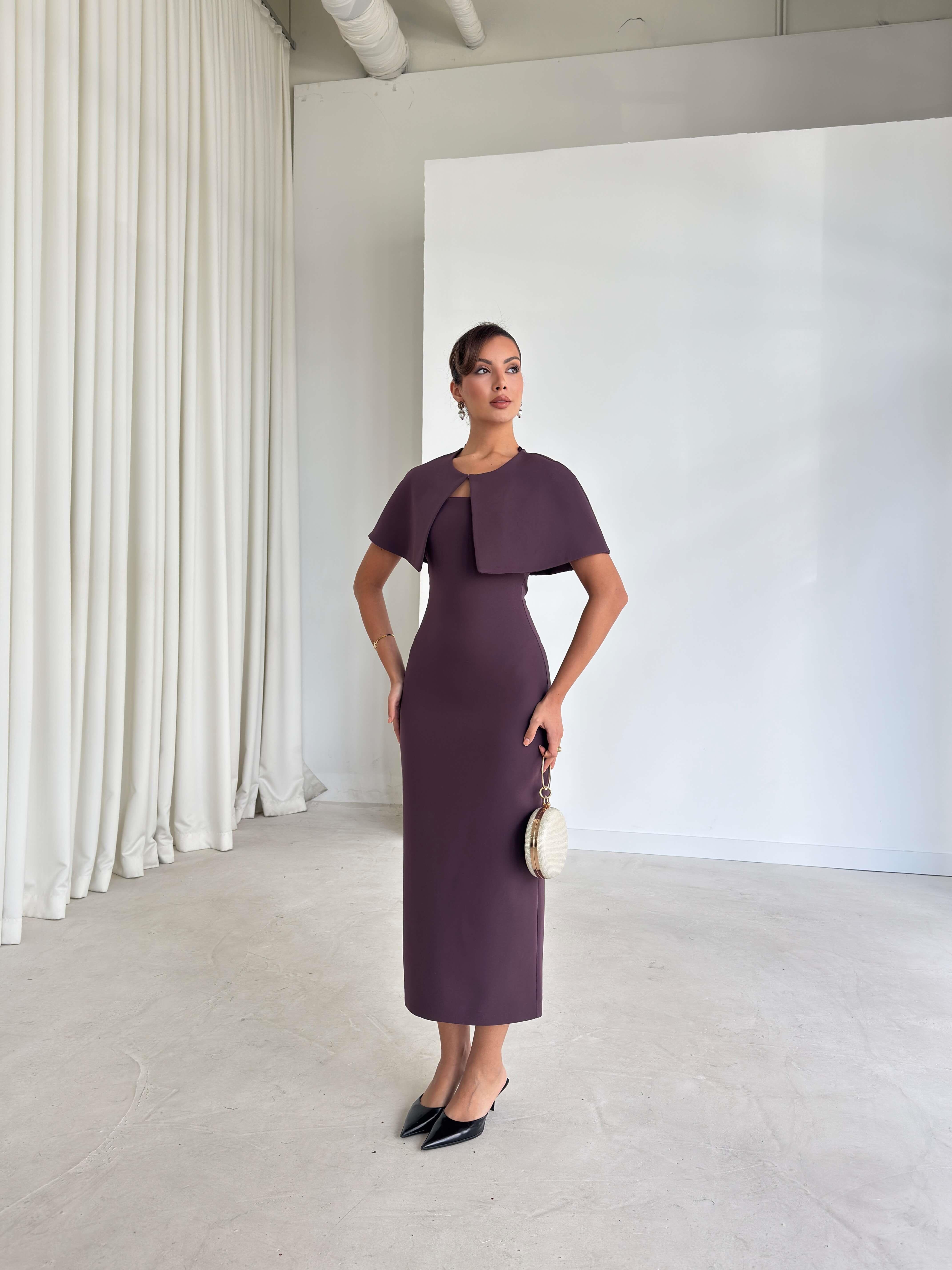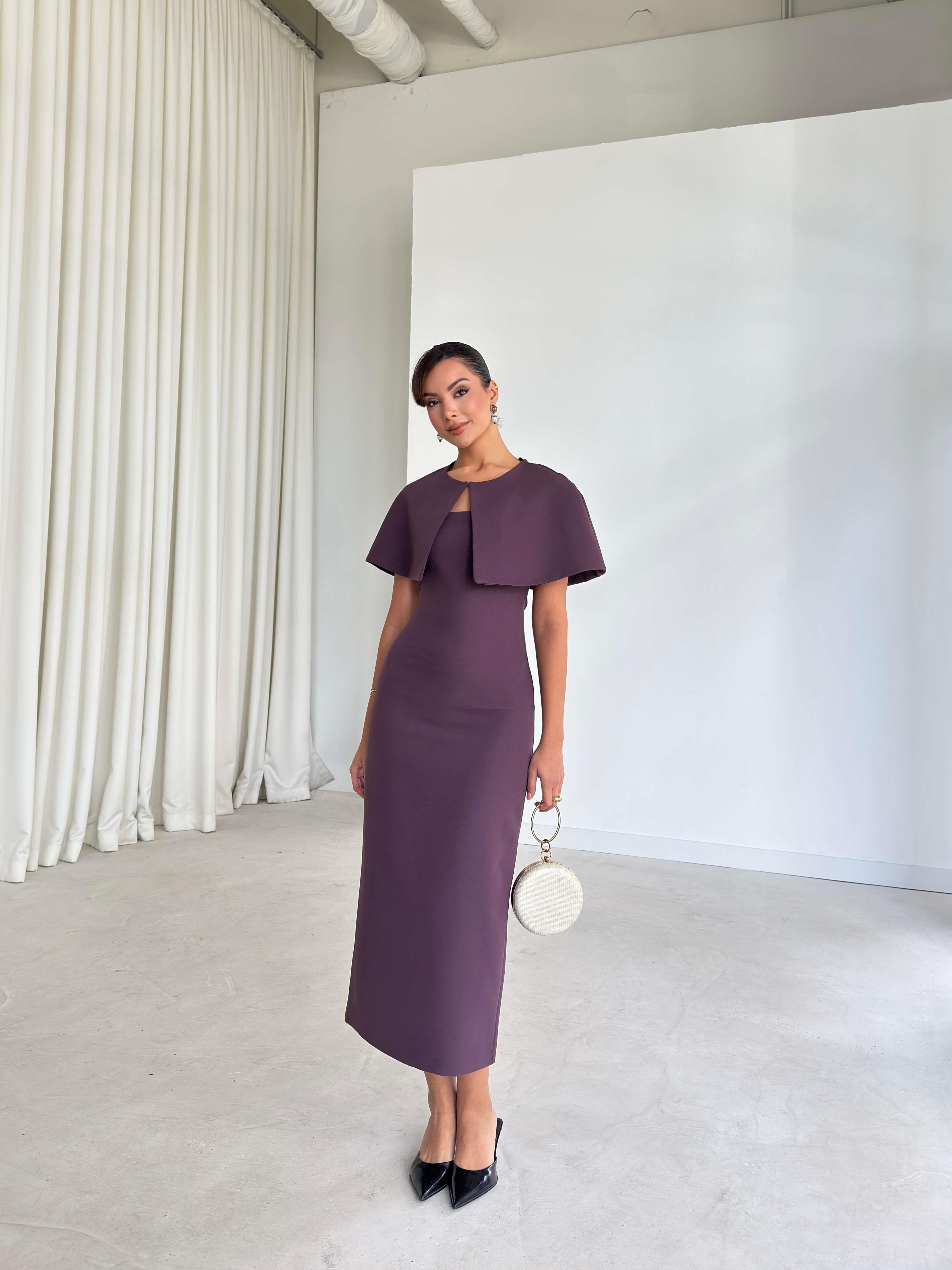 Pelerinli Straplez Arkası Yırtmaçlı Jeremy Mürdüm Kadın Elbise 26K257 (26K257)