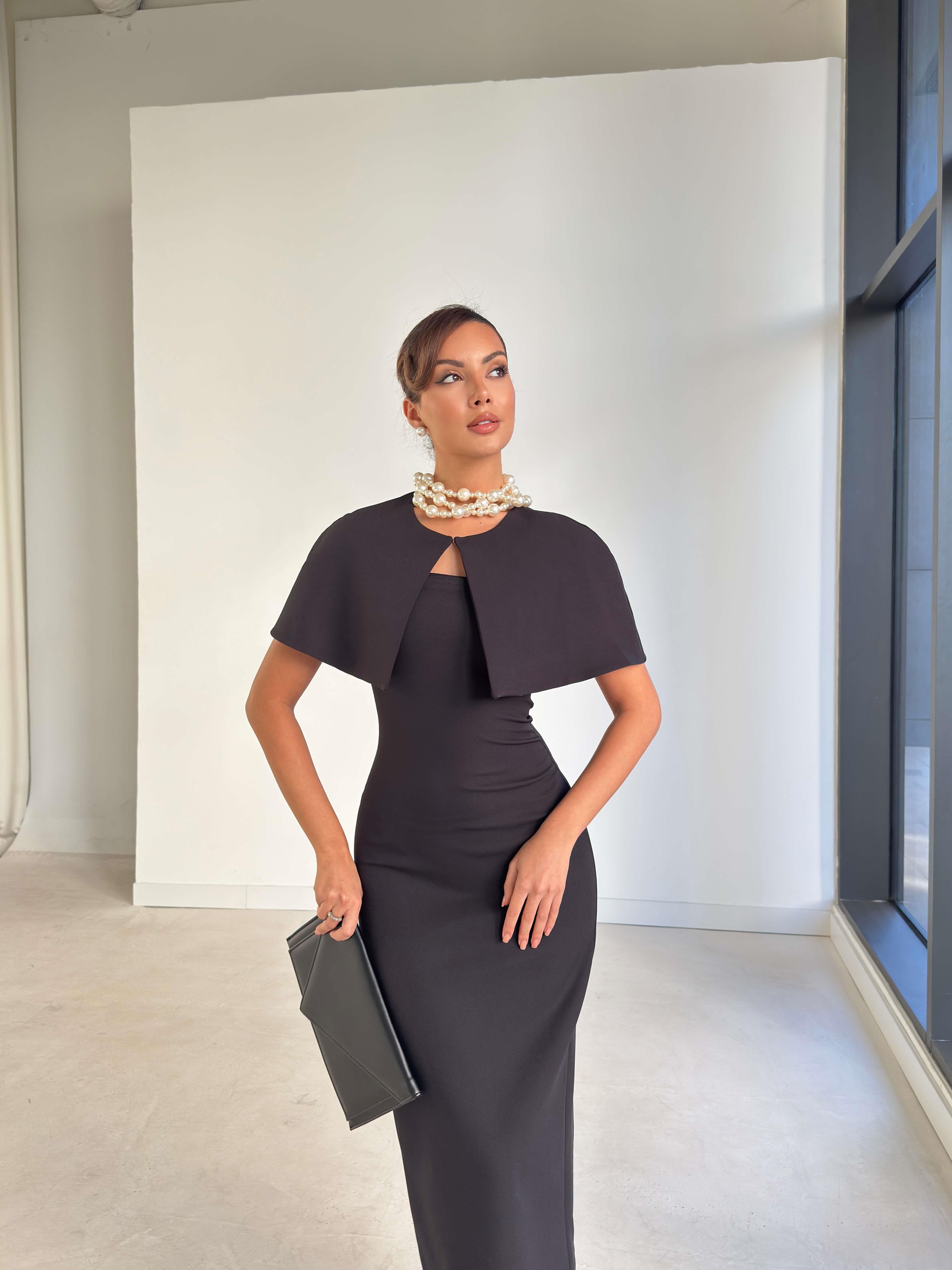 Pelerinli Straplez Arkası Yırtmaçlı Jeremy Siyah Kadın Elbise 26K257 (26K257)