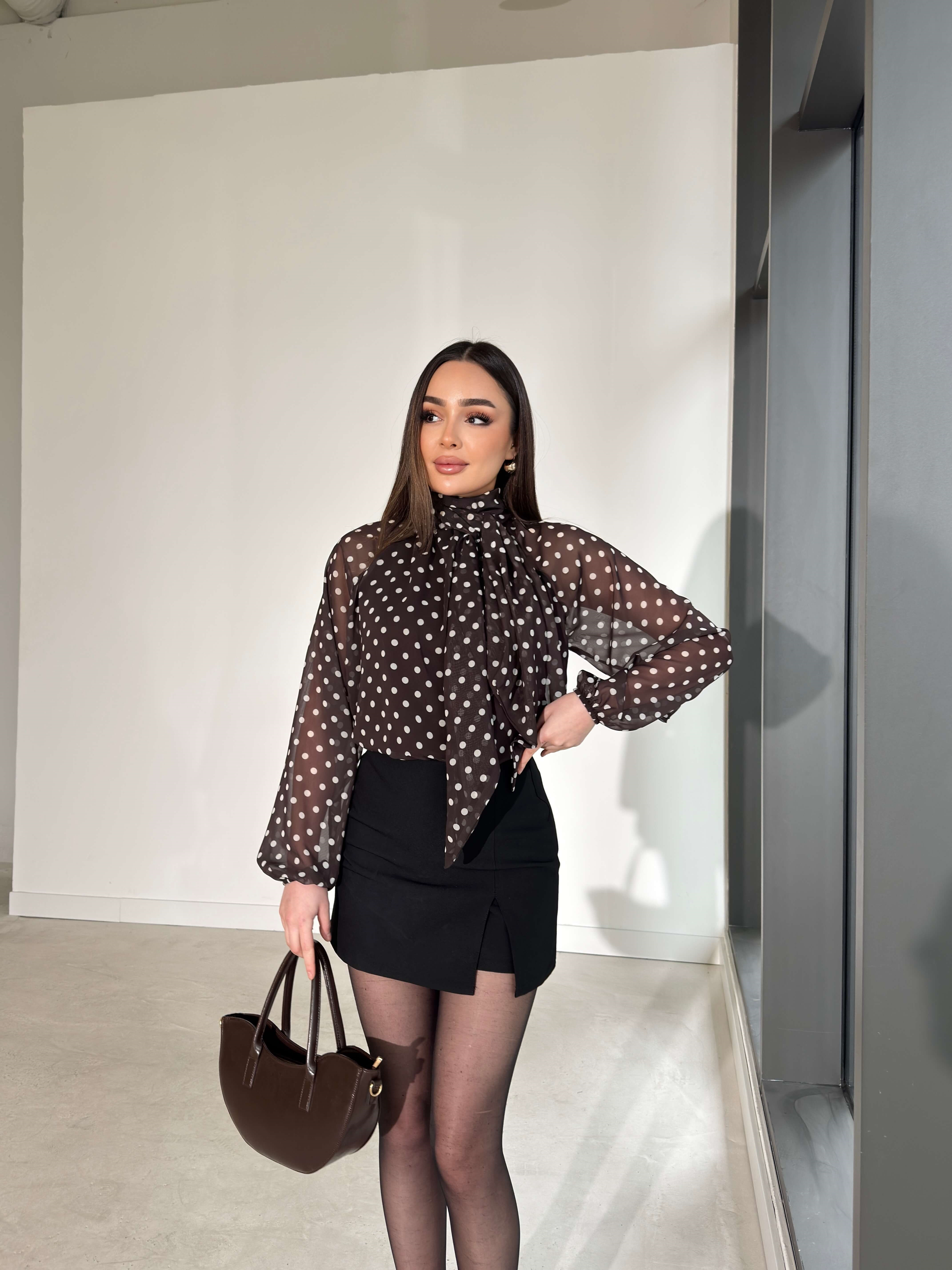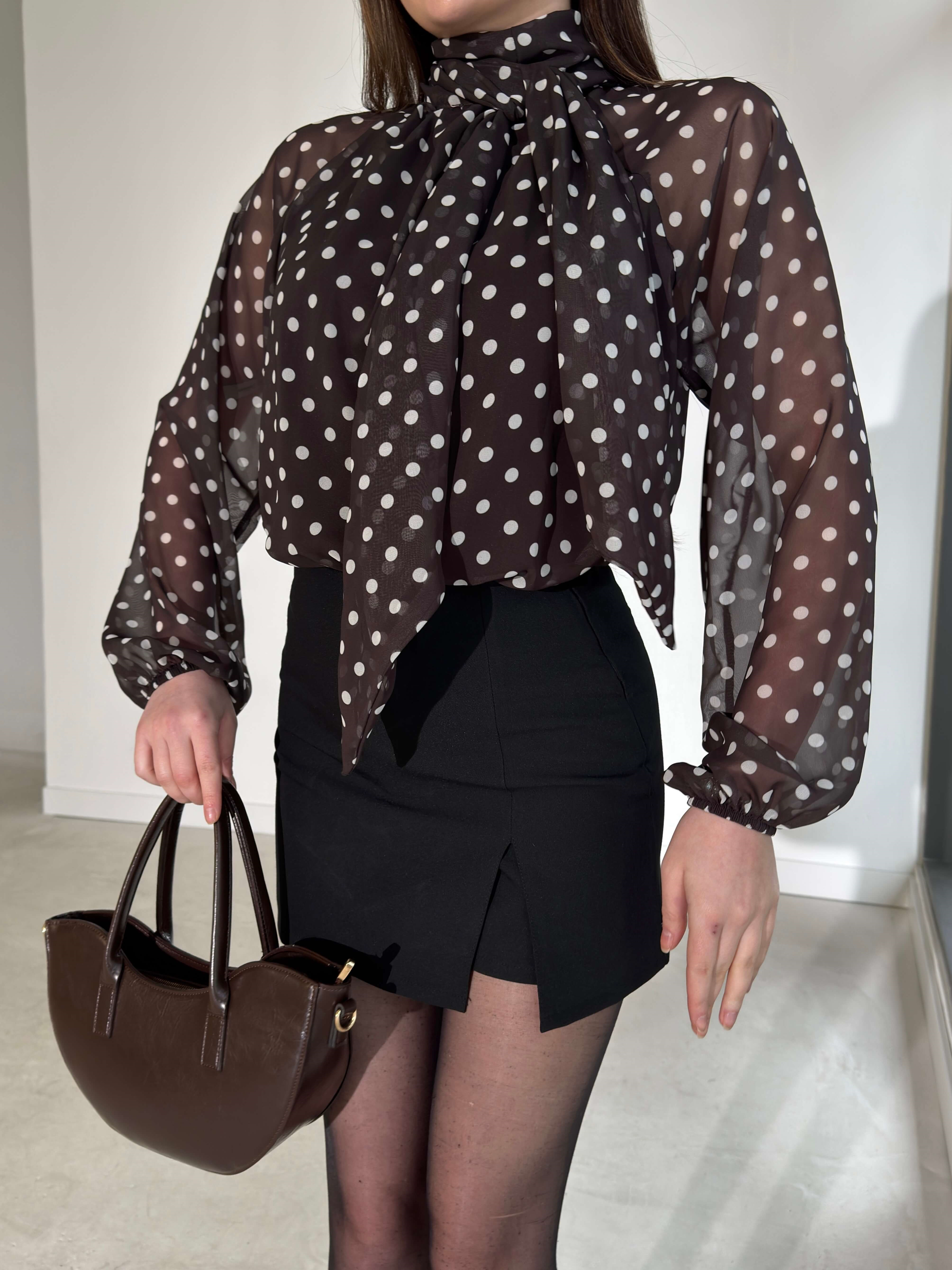 Puantiyeli Boynu Fularlı Şifon Evro Kahverengi Kadın Bluz 26Y054 (26Y054)