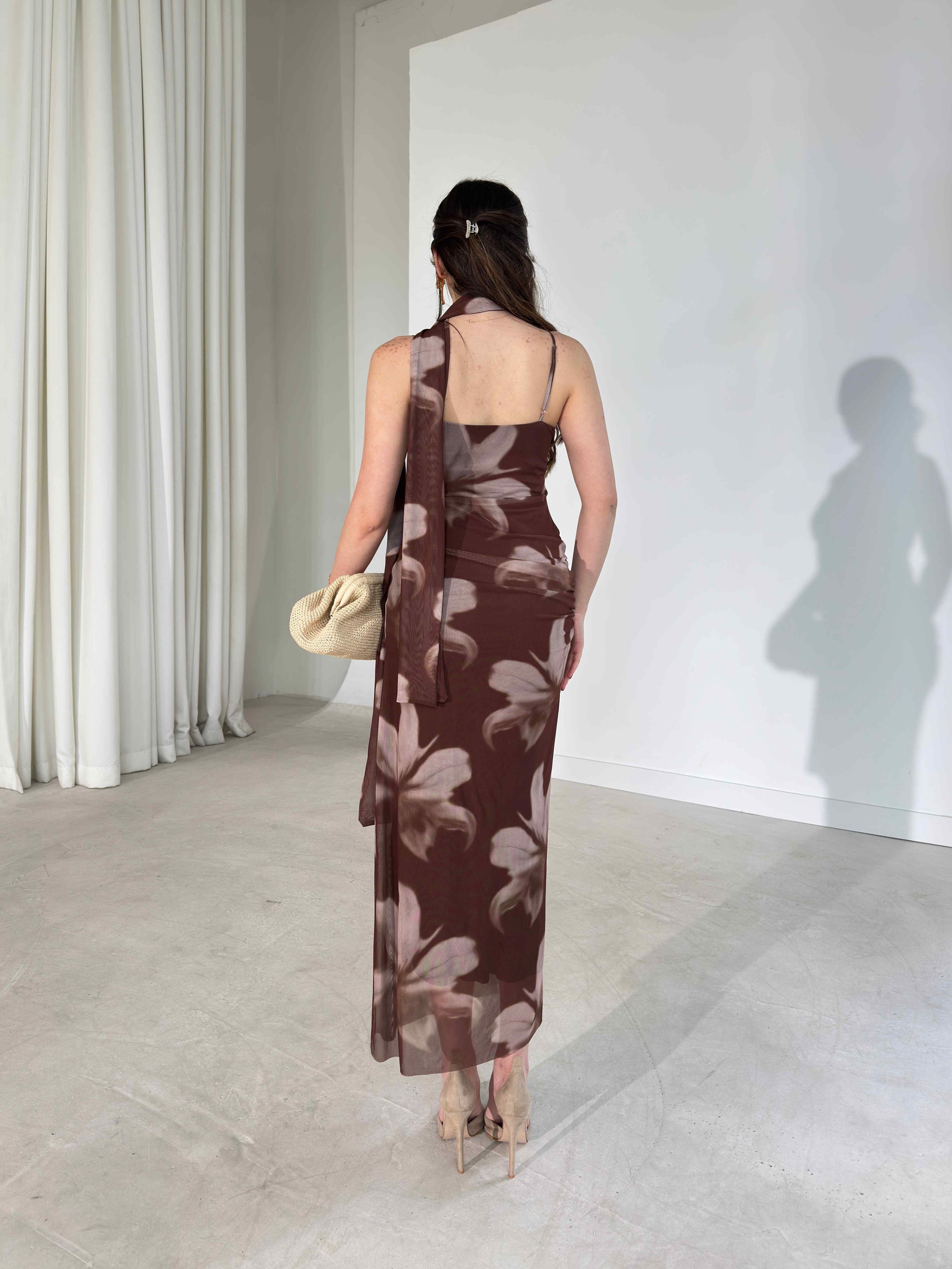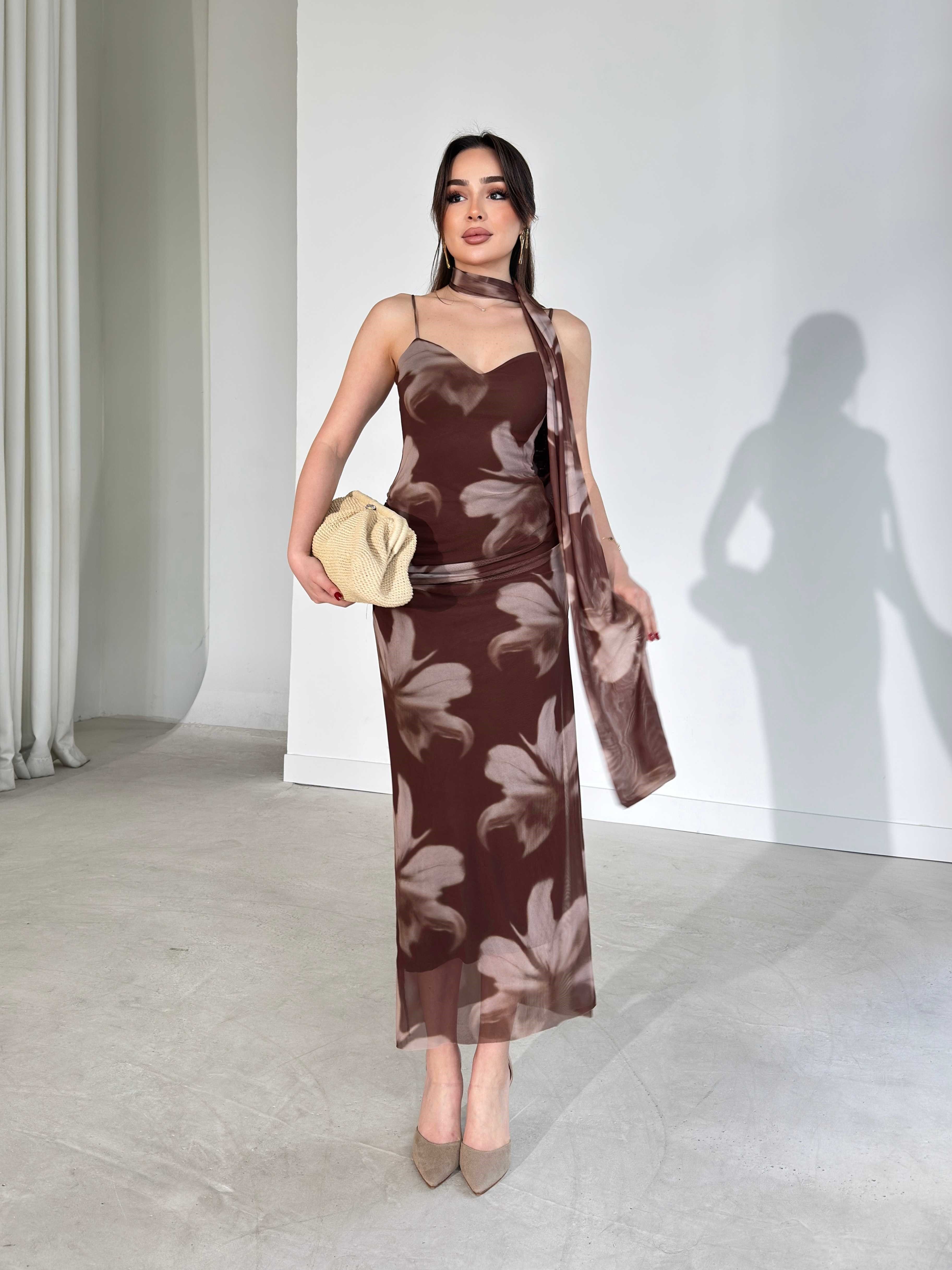Şallı Kalp Yaka İnce Askılı Tül Kahverengi Madyson Kadın Elbise 26Y192 (26Y192)