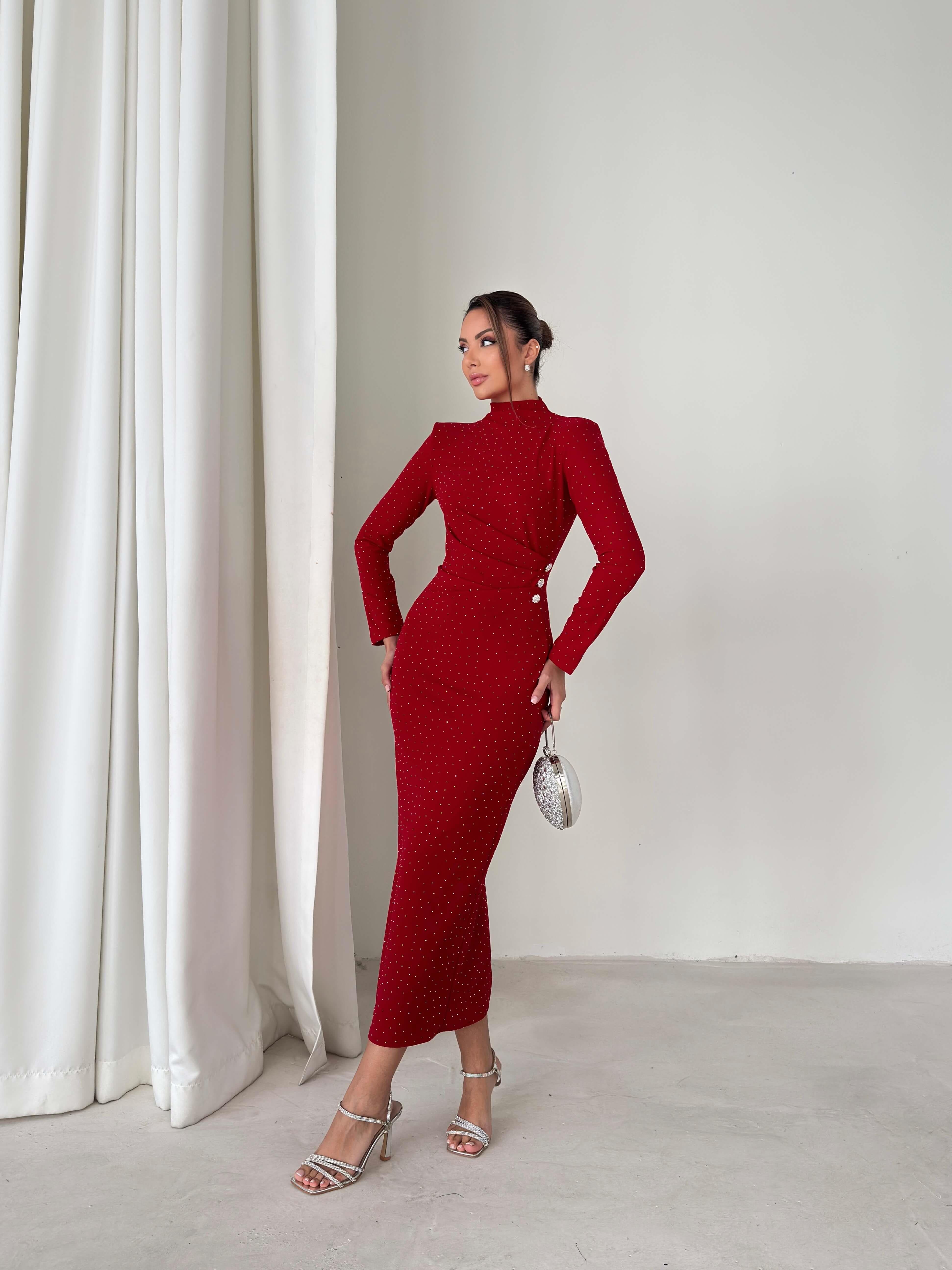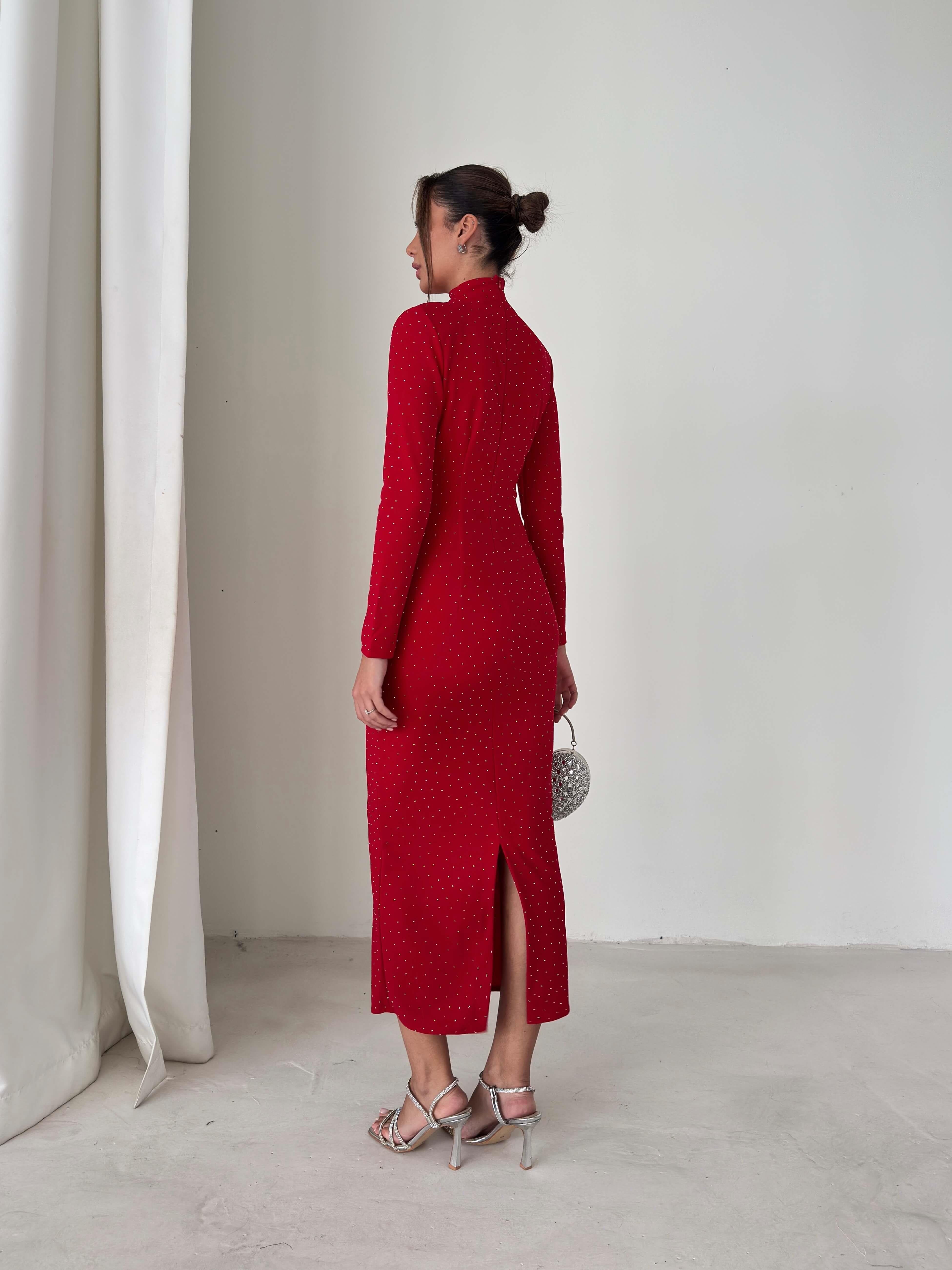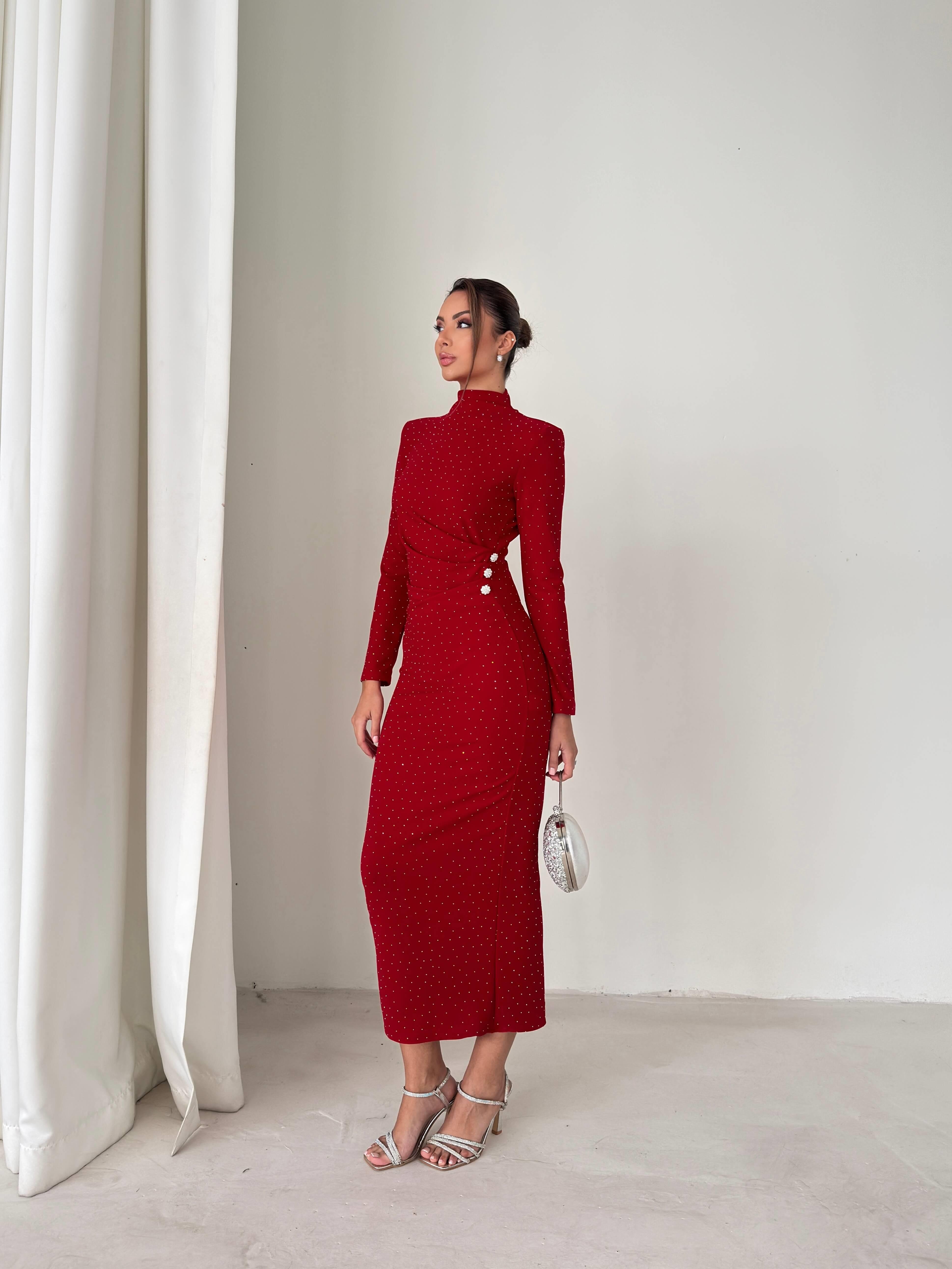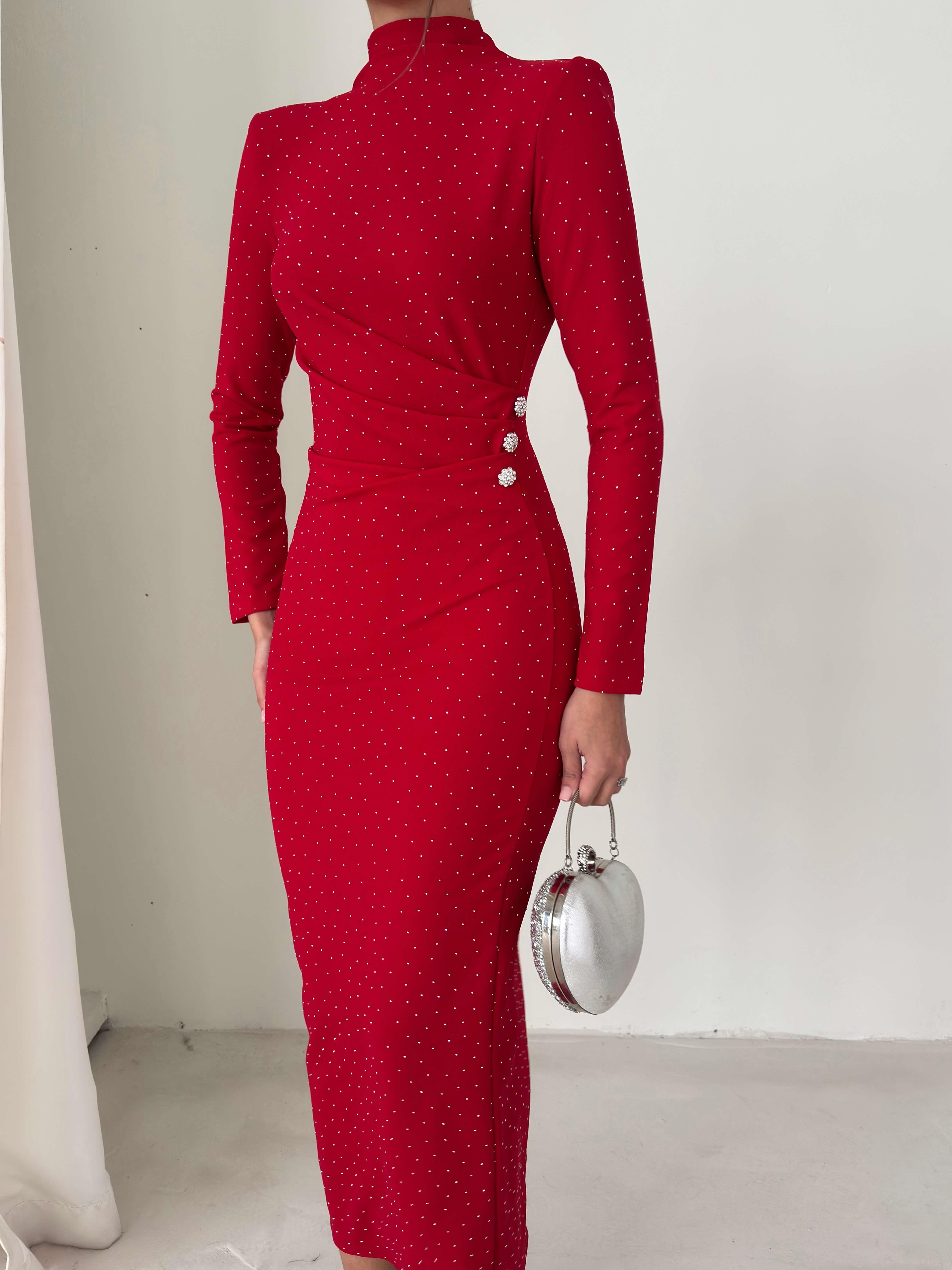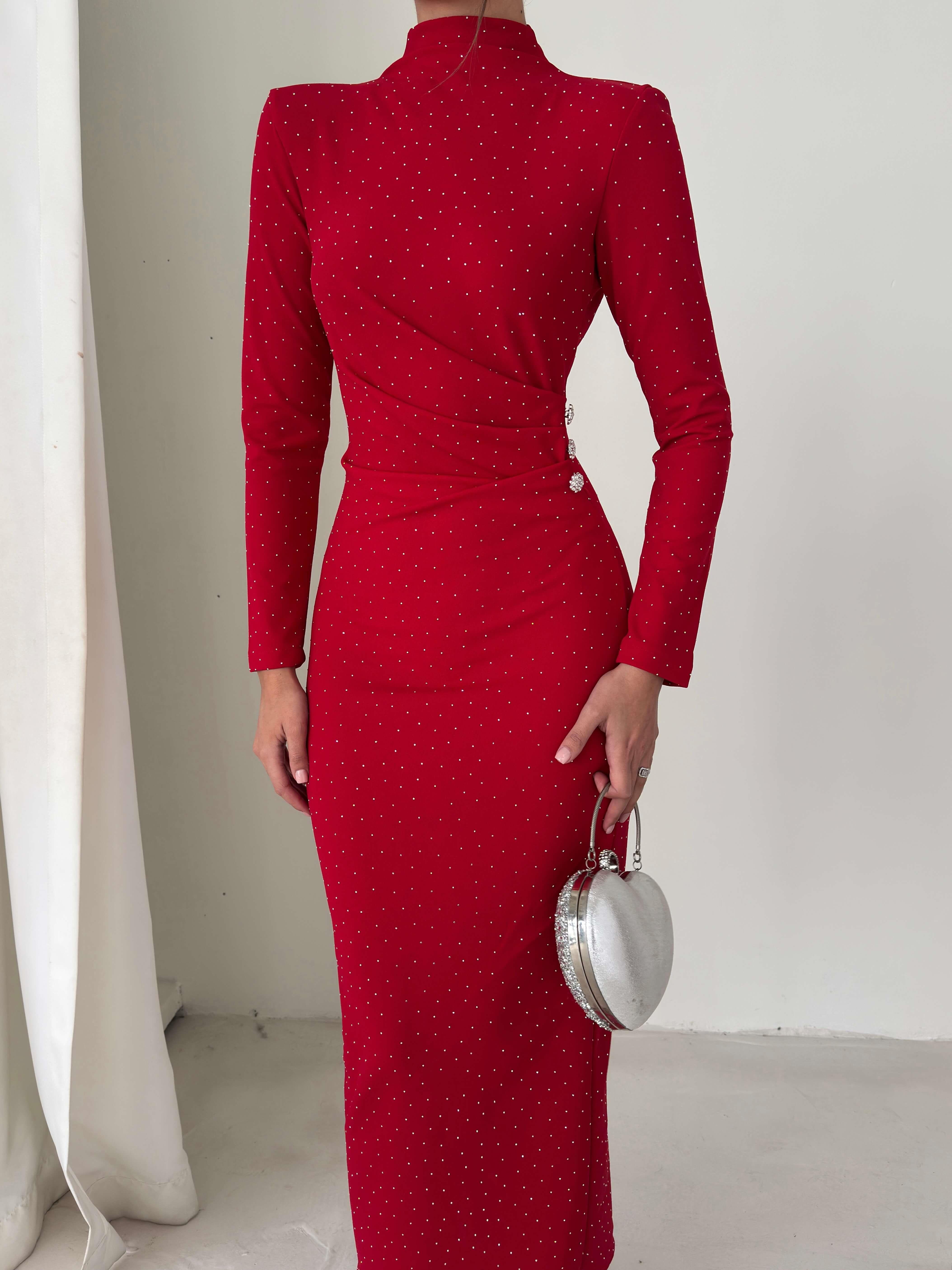 Taşlı Drape Detaylı Arkası Yırtmaçlı Aksesuarlı Ferguson Kırmızı Kadın Elbise 26K235 (26K235)