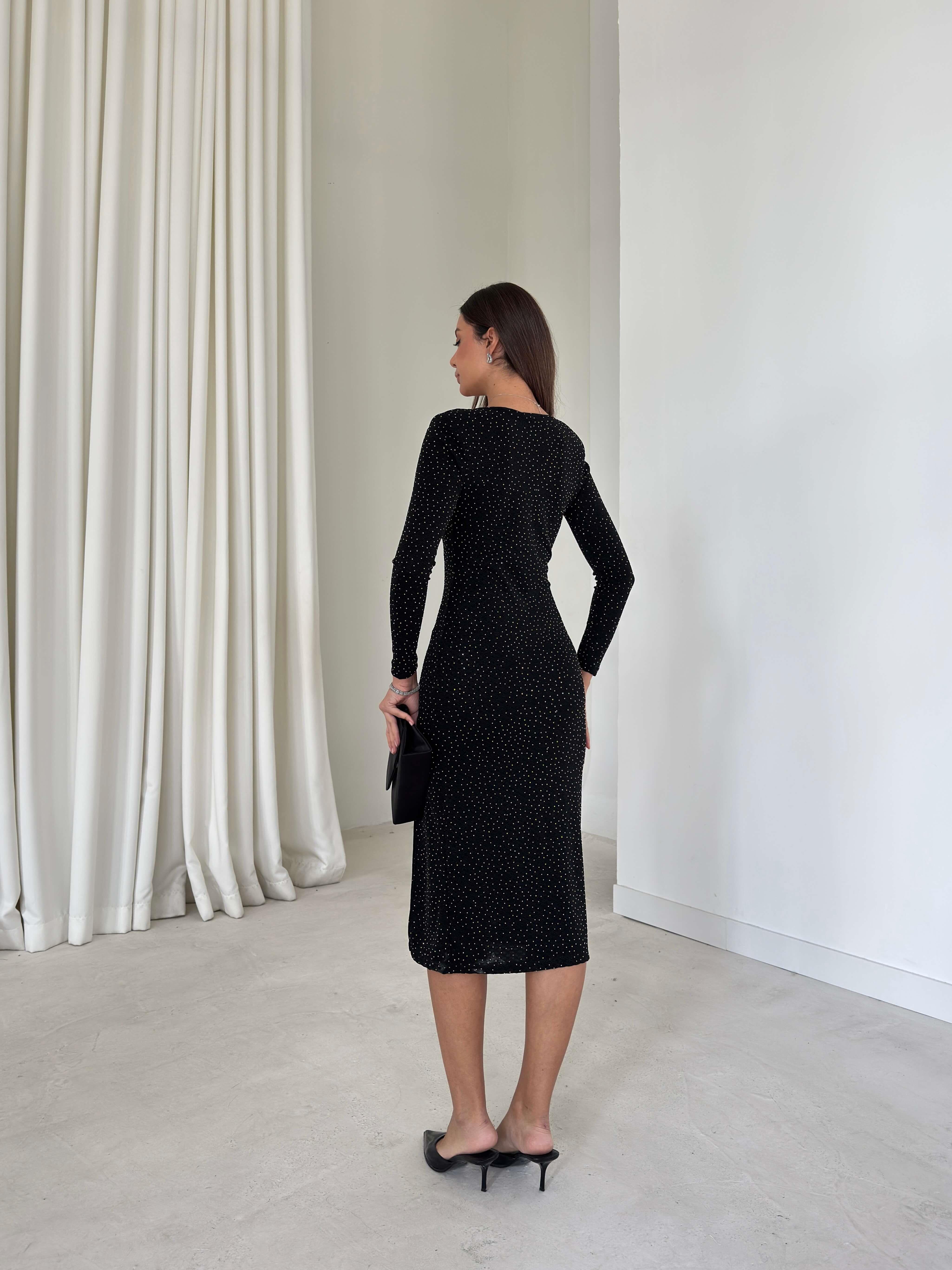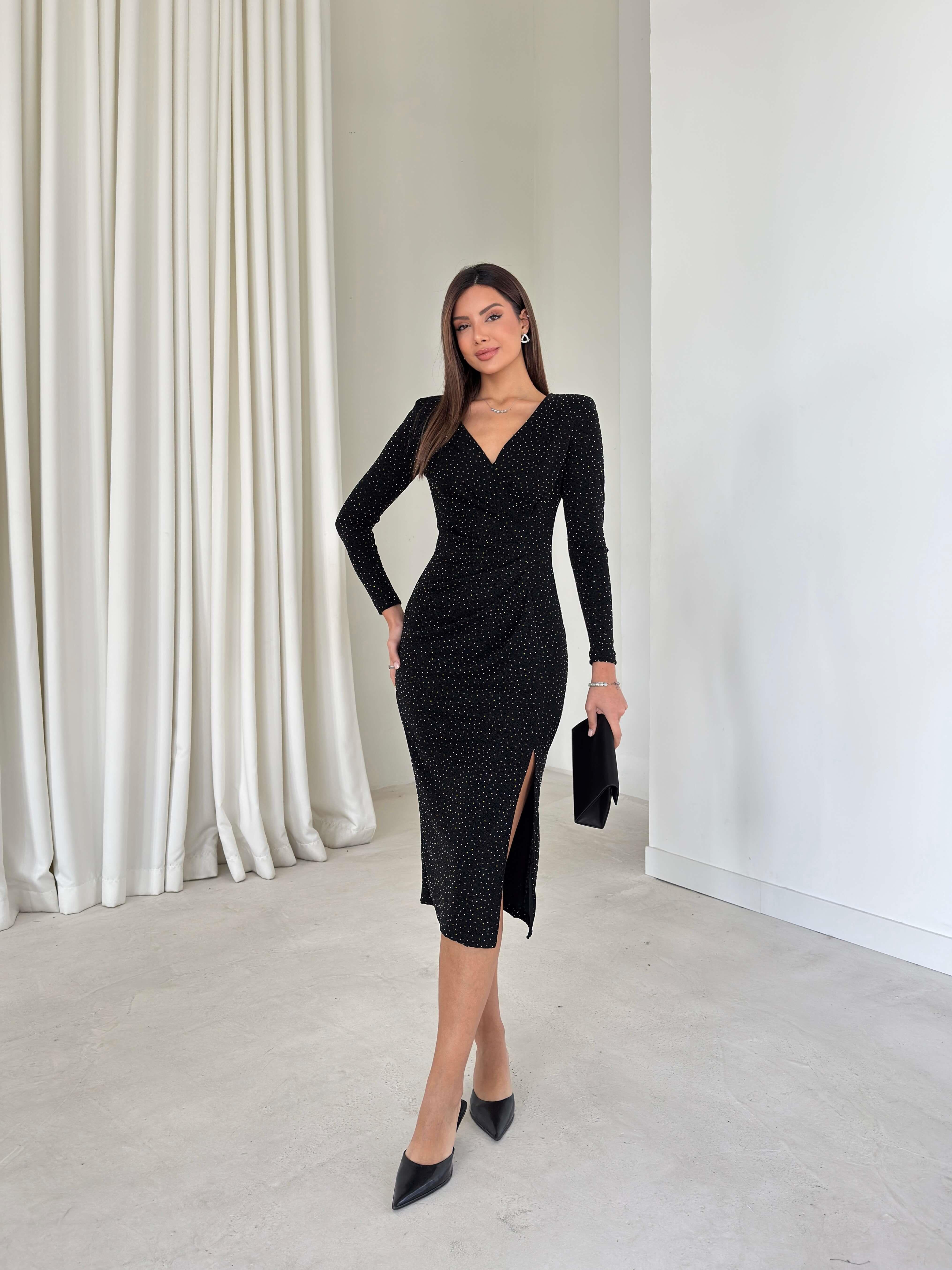 Taşlı Parlak Kruvaze Yaka Drapeli Önü Yırtmaçlı Nılda Siyah Kadın Elbise 26K295 (26K295)