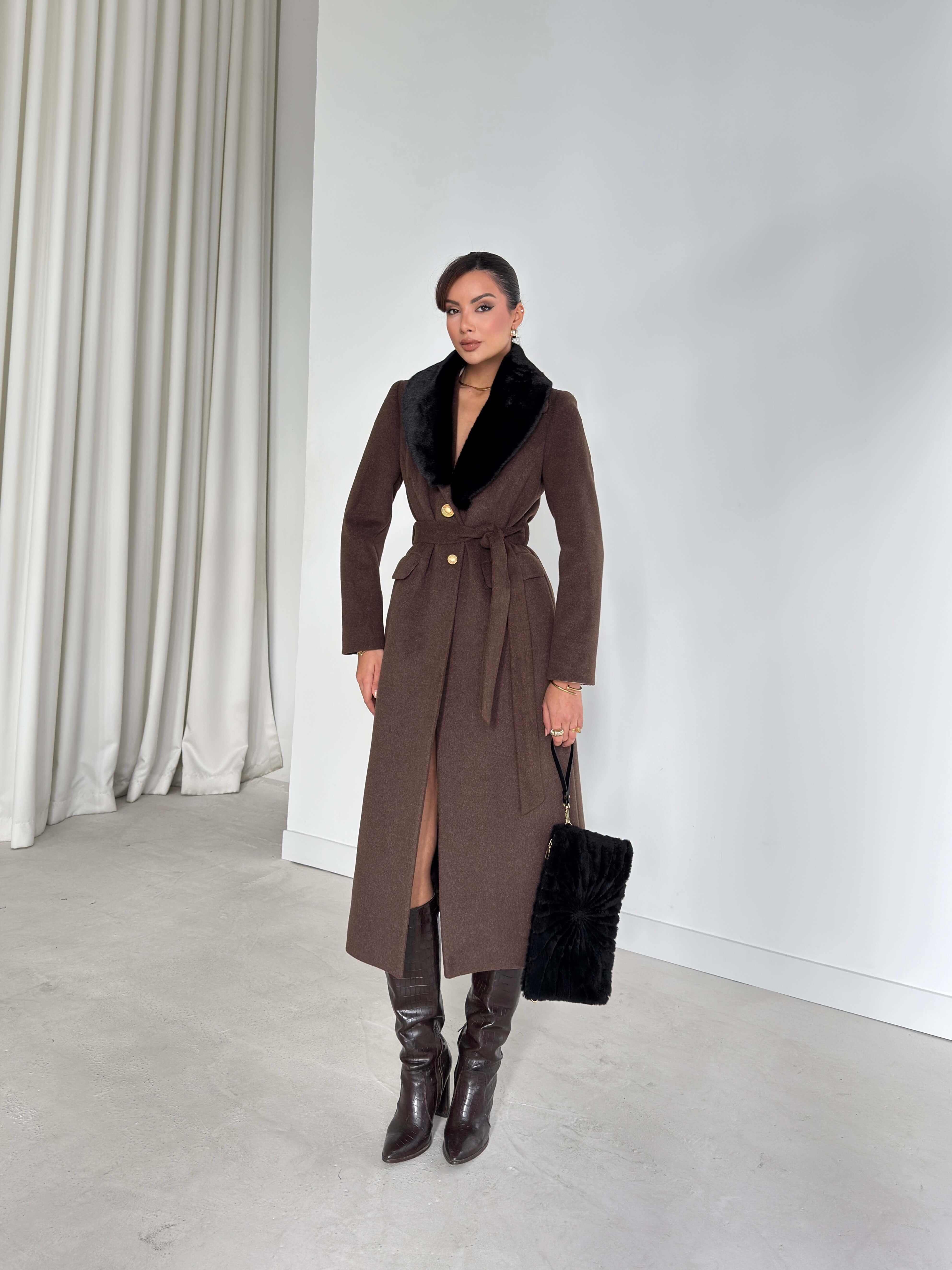 Yakası Tüylü Düğme Kapamalı Kuşaklı Kelmira Kahve Kaban Kaban 26K254 (26K254)
