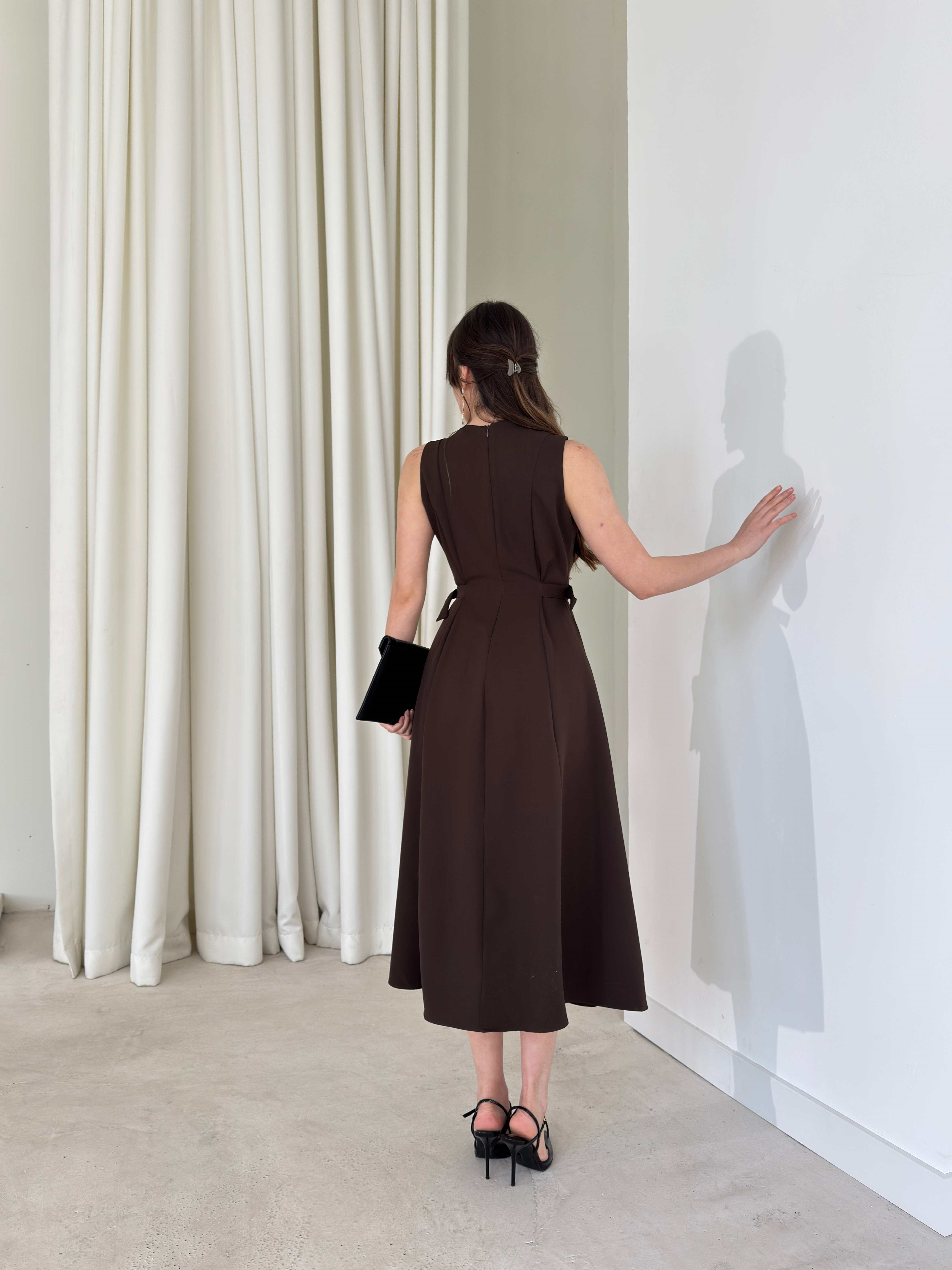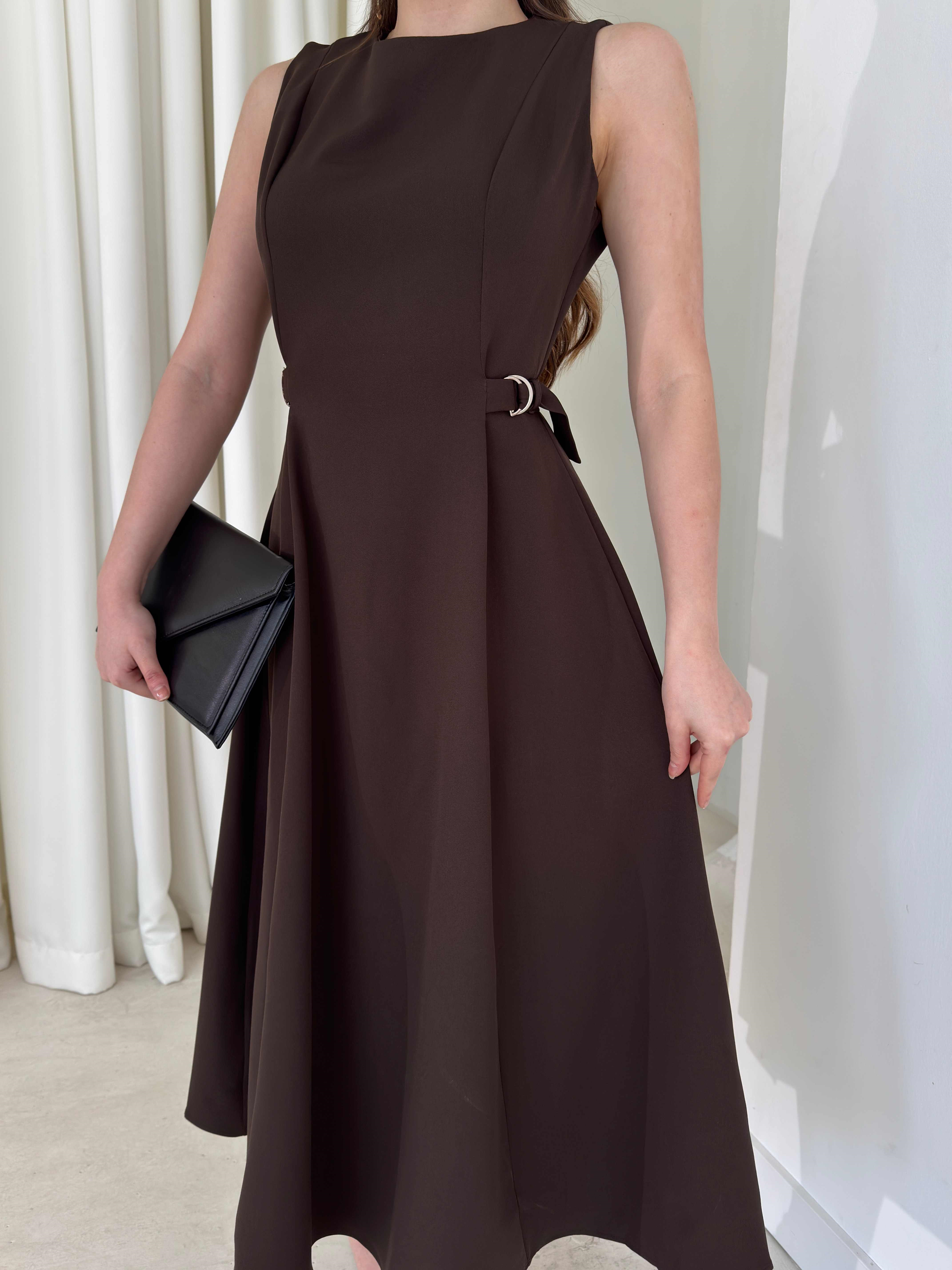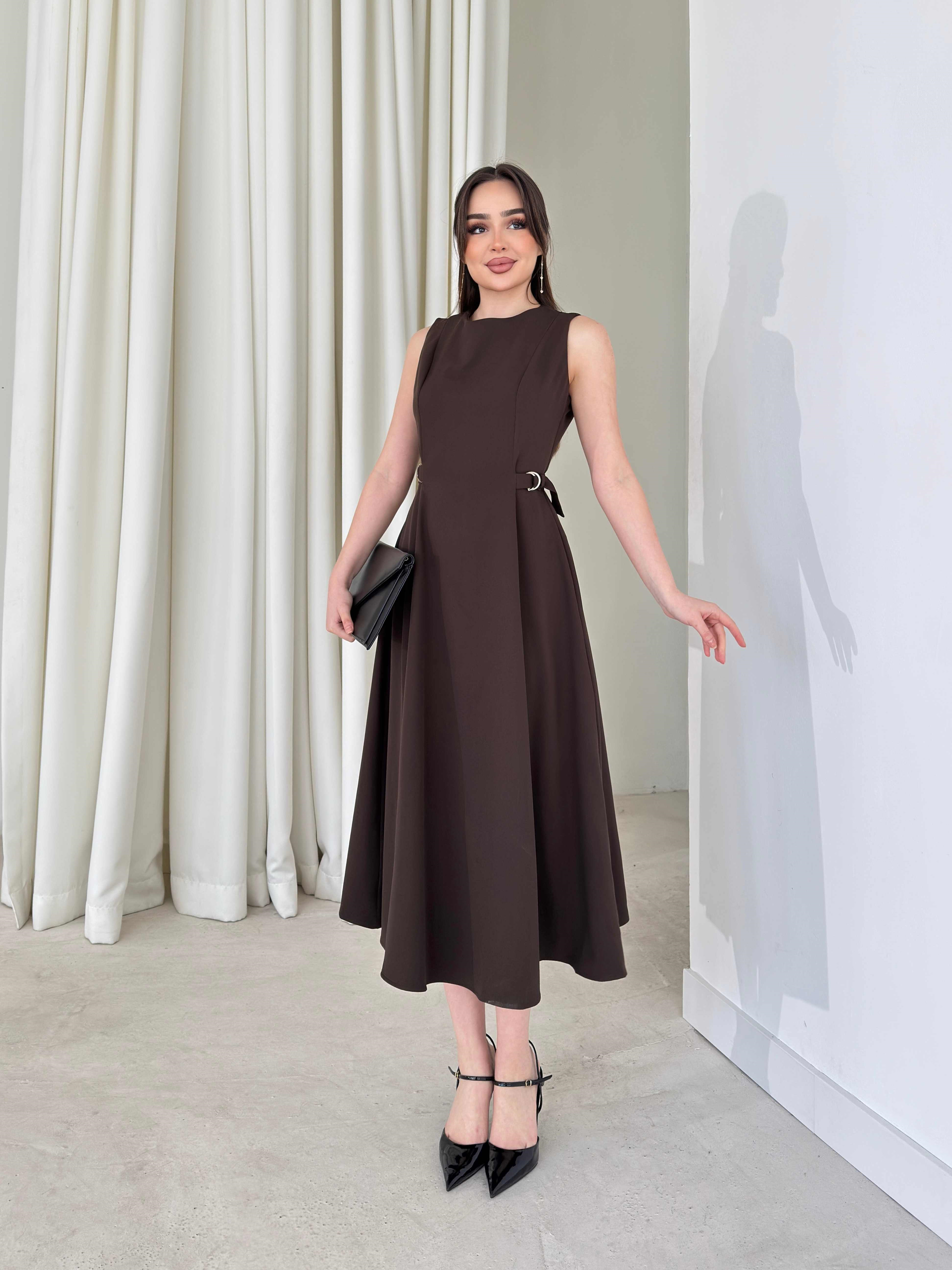 Yanı Ayarlanabilir Kemerli Sıfır Kol Midi Boy Kahverengi Vice Kadın Elbise 26Y176 (26Y176)
