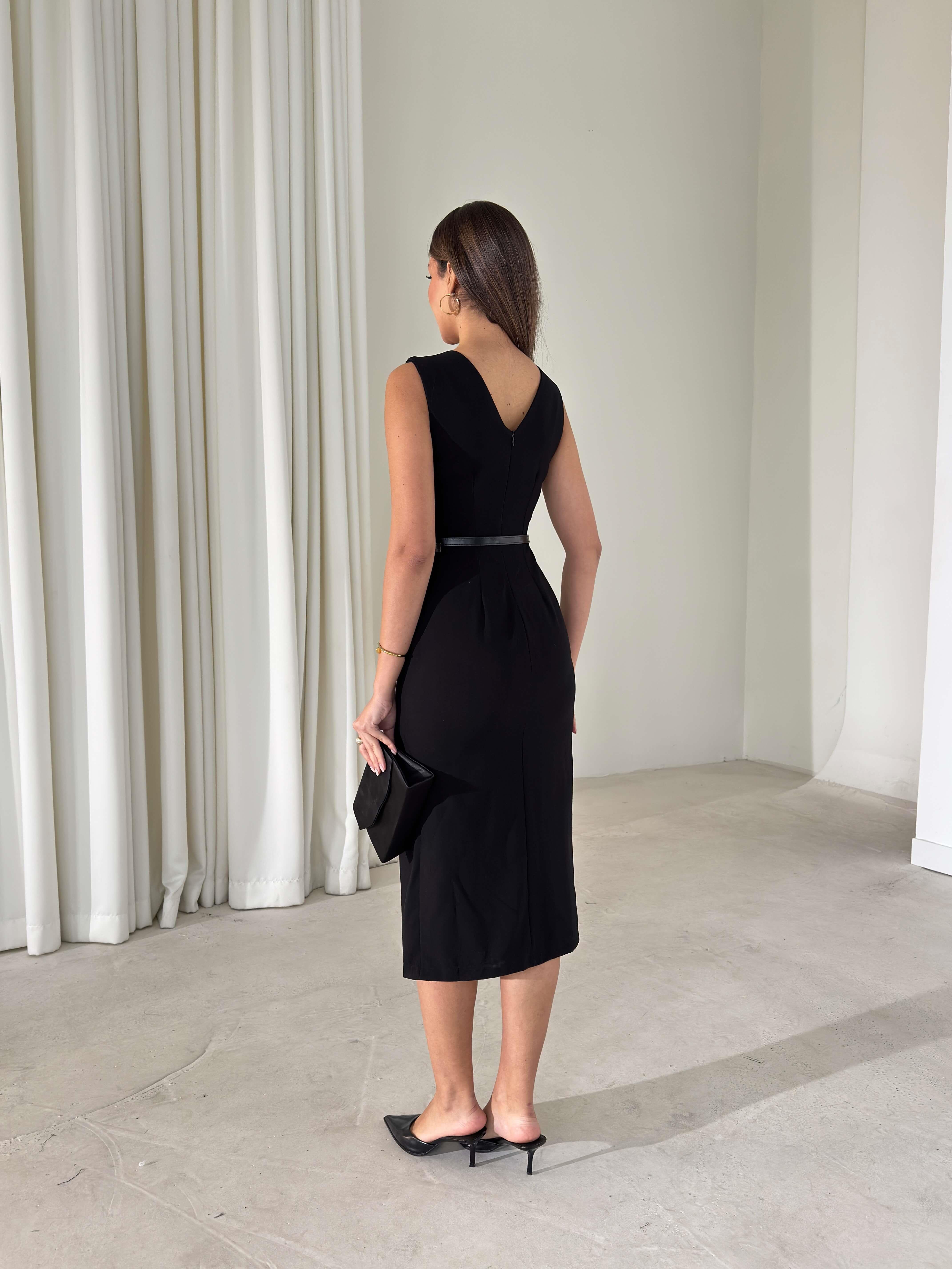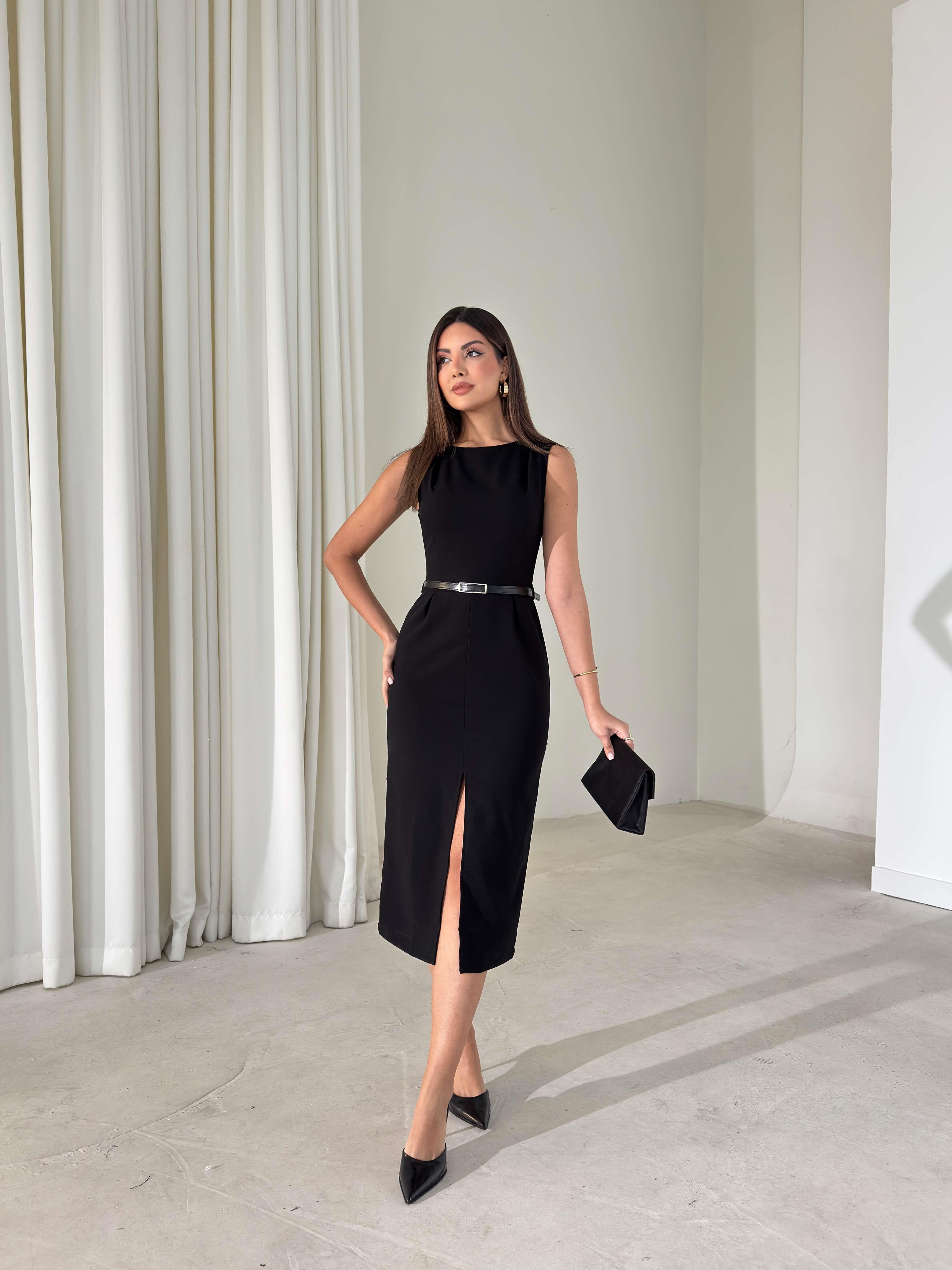Yırtmaçlı Kemerli Drape Detaylı Sıfır Kol Otis Siyah Kadın Elbise 26K416 (26K416)